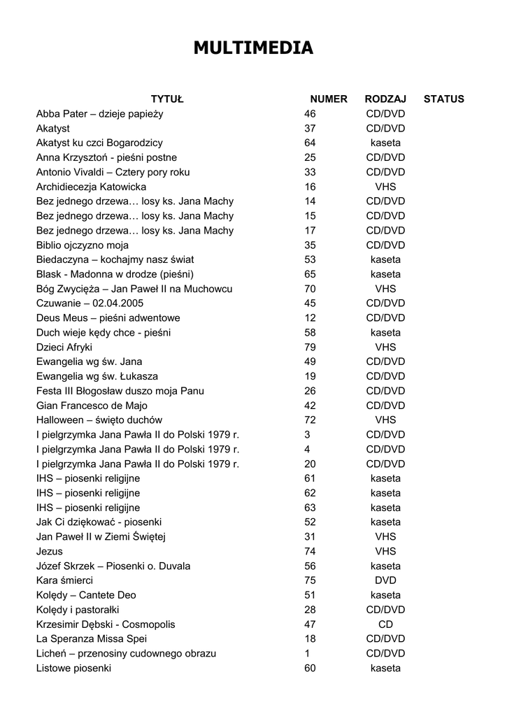 MULTIMEDIA TYTUŁ Abba Pater – dzieje papieży Akatyst Akatyst ku czci Bogarodzicy Anna Krzysztoń - pieśni postne Antonio Vivaldi – Cztery pory roku Archidiecezja Katowicka Bez jednego drzewa… losy ks. Jana Machy Bez jednego drzewa… losy ks. Jana Machy Bez jednego drzewa… losy ks. Jana Machy Biblio ojczyzno moja Biedaczyna – kochajmy nasz świat Blask - Madonna w drodze (pieśni) Bóg Zwycięża – Jan Paweł II na Muchowcu Czuwanie – 02.04.2005 Deus Meus – pieśni adwentowe Duch wieje kędy chce - pieśni Dzieci Afryki Ewangelia wg św. Jana Ewangelia wg św. Łukasza Festa III Błogosław duszo moja Panu Gian Francesco de Majo Halloween – święto duchów I pielgrzymka Jana Pawła II do Polski 1979 r. I pielgrzymka Jana Pawła II do Polski 1979 r. I pielgrzymka Jana Pawła II do Polski 1979 r. IHS – piosenki religijne IHS – piosenki religijne IHS – piosenki religijne Jak Ci dziękować - piosenki Jan Paweł II w Ziemi Świętej Jezus Józef Skrzek – Piosenki o. Duvala Kara śmierci Kolędy – Cantete Deo Kolędy i pastorałki Krzesimir Dębski - Cosmopolis La Speranza Missa Spei Licheń – przenosiny cudownego obrazu Listowe piosenki NUMER 46 37 64 25 33 16 14 15 17 35 53 65 70 45 12 58 79 49 19 26 42 72 3 4 20 61 62 63 52 31 74 56 75 51 28 47 18 1 60 RODZAJ CD/DVD CD/DVD kaseta CD/DVD CD/DVD VHS CD/DVD CD/DVD CD/DVD CD/DVD kaseta kaseta VHS CD/DVD CD/DVD kaseta VHS CD/DVD CD/DVD CD/DVD CD/DVD VHS CD/DVD CD/DVD CD/DVD kaseta kaseta kaseta kaseta VHS VHS kaseta DVD kaseta CD/DVD CD CD/DVD CD/DVD kaseta STATUS Lourdes Matka Boża Licheńska Misteria Paschalia Mozart – Mistrzowskie Dzieła New Life`m – Z ciemności do światła Niemy krzyk Nowe przygody dzieci z Bullerbyn o. Józef Augustyn – Adamie gdzie jesteś? Objawienia w Fatimie Odpocznij we mnie - pieśni Ojciec Stanisław Papczyński Opowieści z Narnii Opowieści z Narnii – książę Kaspian Oskar i pani Róża Papieska pastorałka Pasja opowiedziana przez K. Emmerich Pastuszkowie z Fatimy i ich posłannictwo Pieśń Baranka schola Dominikanów Pieśni Polaków dla Papieża Podwórkowe koła różańcowe dzieci w Kalnej Posyłam Ciebie – św. Faustyna Pseudonim Anoda – żołnierze wyklęci Requiem, Camerata Silesia, Parnassos Requiem, Camerata Silesia, Parnassos Rodzinne kolędowanie Rozmowy z miłosiernym Panem - Dzienniczek Salem - zwycięzca Solidarni 2010 Śpiewy Gregoriańskie Św. Franciszek dzisiaj Światło Chrystusa – liturgia wielkiejnocy Święte Triduum Paschalne Święte Triduum Paschalne Syndrom IHS – piosenki religijne Triduum Paschalne - śpiewy Tryptyk rzymski Tryptyk rzymski W drodze - radość W drodze - ruszaj 76 39 44 29 13 73 38 48 77 59 2 7 8 32 22 9 78 23 43 71 57 34 10 11 24 69 68 6 27 54 67 40 41 5 66 30 21 36 50 55 VHS VHS CD/DVD CD/DVD CD/DVD VHS CD/DVD kaseta VHS kaseta CD/DVD CD/DVD CD/DVD CD/DVD CD/DVD CD/DVD VHS CD/DVD CD VHS kaseta CD/DVD CD/DVD CD/DVD CD/DVD kaseta kaseta CD/DVD CD/DVD kaseta kaseta CD/DVD CD/DVD CD/DVD kaseta CD/DVD CD/DVD CD/DVD kaseta kaseta