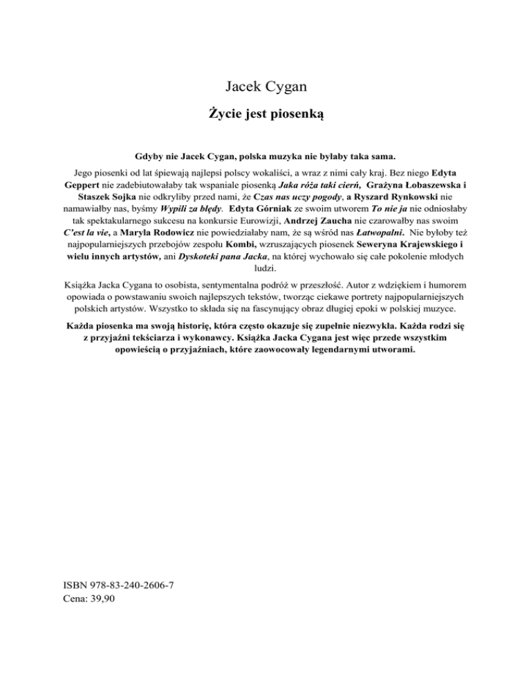 Jacek Cygan Życie jest piosenką Gdyby nie Jacek Cygan, polska muzyka nie byłaby taka sama. Jego piosenki od lat śpiewają najlepsi polscy wokaliści, a wraz z nimi cały kraj. Bez niego Edyta Geppert nie zadebiutowałaby tak wspaniale piosenką Jaka róża taki cierń, Grażyna Łobaszewska i Staszek Sojka nie odkryliby przed nami, że Czas nas uczy pogody, a Ryszard Rynkowski nie namawiałby nas, byśmy Wypili za błędy. Edyta Górniak ze swoim utworem To nie ja nie odniosłaby tak spektakularnego sukcesu na konkursie Eurowizji, Andrzej Zaucha nie czarowałby nas swoim C’est la vie, a Maryla Rodowicz nie powiedziałaby nam, że są wśród nas Łatwopalni. Nie byłoby też najpopularniejszych przebojów zespołu Kombi, wzruszających piosenek Seweryna Krajewskiego i wielu innych artystów, ani Dyskoteki pana Jacka, na której wychowało się całe pokolenie młodych ludzi. Książka Jacka Cygana to osobista, sentymentalna podróż w przeszłość. Autor z wdziękiem i humorem opowiada o powstawaniu swoich najlepszych tekstów, tworząc ciekawe portrety najpopularniejszych polskich artystów. Wszystko to składa się na fascynujący obraz długiej epoki w polskiej muzyce. Każda piosenka ma swoją historię, która często okazuje się zupełnie niezwykła. Każda rodzi się z przyjaźni tekściarza i wykonawcy. Książka Jacka Cygana jest więc przede wszystkim opowieścią o przyjaźniach, które zaowocowały legendarnymi utworami. ISBN 978-83-240-2606-7 Cena: 39,90