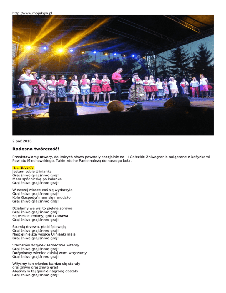 http://www.mojekgw.pl 2 paź 2016 Radosna twórczość! Przedstawiamy utwory, do których słowa powstały specjalnie na II Gołeckie Żniwogranie połączone z Dożynkami Powiatu Miechowskiego. Takie zdolne Panie należą do naszego koła. "ULINIANKA" Jestem sobie Ulinianka Graj żniwo graj żniwo graj! Mam spódniczkę po kolanka Graj żniwo graj żniwo graj! W naszej wiosce coś się wydarzyło Graj żniwo graj żniwo graj! Koło Gospodyń nam się narodziło Graj żniwo graj żniwo graj! Działamy we wsi to piękna sprawa Graj żniwo graj żniwo graj! Są wielkie zmiany, grill i zabawa Graj żniwo graj żniwo graj! Szumią drzewa, ptaki śpiewają Graj żniwo graj żniwo graj! Najpiękniejszą wioskę Ulinianki mają Graj żniwo graj zniwo graj! Starostów dożynek serdecznie witamy Graj żniwo graj żniwo graj! Dożynkowy wieniec dzisiaj wam wręczamy Graj żniwo graj żniwo graj! Wiłyśmy ten wieniec bardzo się starały graj żniwo graj żniwo graj! Abyśmy w tej gminie nagrodę dostały Graj żniwo graj żniwo graj! Piękna nasza gmina cała Graj żniwo graj żniwo graj! Malownicza i wspaniała Graj żniwo graj żniwo graj! Wójta mamy zaradnego Graj żniwo graj żniwo graj! I do tego przystojnego Graj żniwo graj żniwo graj! Naszemu wójtowi będziemy śpiewały Graj żniwo graj żniwo graj! Bo dobry gospodarz więc go poważamy Graj żniwo graj żniwo graj! Ale nie róbmy o nim takiej wrzawy Graj żniwo graj żniwo graj! Bo go zabiorą nam do Warszawy Graj żniwo graj żniwo graj! Nasz drogi wójcie dzieci u nas wszędzie Graj żniwo graj żniwo graj! Może i plac zabaw też w Ulinie będzie Graj żniwo graj żniwo graj! A i piękne stroje by nam się przydały Graj żniwo graj żniewo graj! Byśmy w pożyczonych nie występowały Graj zniwo graj zniwo graj! My swe dzięki wójtowi składamy Graj żniwo graj żniwo graj! Bo w Ulinie plan pod chodnik mamy Graj żniwo graj żniwo graj! A i do starostwa założymy butki Graj żniwo graj żniwo graj! Żeby ten nasz chodnik nie był za krótki Graj żniwo graj żniwo graj! Starostów powiatu serdecznie witamy Graj żniwo graj żniwo graj! Niech wspierają gminę inwestycjami Graj żniwo graj żniwo graj! Tej władzy w powiecie to się dobrze wiedzie Graj żniwo graj żniwo graj! Dużo obiecują- może coś zbudują Graj żniwo graj żniwo graj! My za to staranie też wam obiecamy Graj żniwo graj żniwo graj! Że w przyszłych wyborach głosy wam oddamy Graj żniwo graj żniwo graj! I radnych sejmiku bardzo poważamy Graj żniwo graj żniwo graj! Na nowe korale też ochotę mamy Graj zniwo graj żniwo graj! Ośrodek zdrowia dobrze prosperuje Graj żniwo graj żniwo graj! Z całego powiatu pacjentów przyjmuje Graj żniwo graj żniwo graj! My na tę okazję cały rok czekały Graj żniwo graj żniwo graj! Byśmy sobie dzisiaj razem pośpiewały Graj żniwo graj żniwo graj! Nasi mili goście proszę się nie gniewać Graj żniwo graj żniwo graj! Mamy wolność słowa możemy pośpiewać Graj żniwo graj żniwo graj! „DZIEWCZYNA Z ULINY” Tam za Sarią, za polami Gdzie Kościółek jest drewniany, Szła dziewczyna z lawendami Cóż za widok malowany! Oj dziewczyno moja droga Ta ulińska Twa uroda Zgubić może niejednego Lub uczynić szczęśliwego! Ref: Ta dziewczyna jest szalona W gminie Gołcza urodzona! Mówi do mnie zawsze z rana Moja gmina ukochana! Chodzę za nią jak szalony Szukaj rolniku takiej żony! Hej, hej, hej To w Ulinie szukaj jej! Echo niesie me wołanie, Nad kamieniołomem słońce świeci Dziewcze pięknie jest ubrane Żonę taką ja chce mieć dziś! Świtać zaczyna już po nocy, Biegnę za nią aż do Wielkanocy! Bo przy źródełku będzie stała I swą twarz przemywała! Ref: Ta dziewczyna jest szalona Lecz z Ulinianki dobra żona. Tańczy dla mnie w stogu siana, Od wieczora aż do rana. Chodzę za nią jak szalony Szukaj rolniku takiej żony! Hej, hej hej W gminie Gołcza szukaj jej! „PRZEZ TEN CIĄGNIK ZIELONY” 1)Odkąd u sąsiada stoi Nie mogę jeść, nie mogę spać Jak się go dorobił-nie wiem? Zazdrość o sobie daje znać! 2)Co poradzić mogę na to, Że mnie na niego nie stać dziś. I tak przez kolejne lato W moim portfelu nie ma nic! Ref: Przez ten ciągnik ten ciągnik zielony –Oszalałem! Kiedy mówię o nim mojej żonie-to jest wrzask! Całą forsę na nawóz na nawóz już wydałem, Tak narobię się i nie zarobię już nieraz! 3)Nic przed Krusem nie ukryję, Pole to mój cały świat. Grad po moim zbożu bije To nie jest dla mnie dobry czas! 4)Jeden John Deere mi wystarczy I moje serce gubi rytm. O niego w Unii będę walczył Jeździć 30-tką to już wstyd! Ref:... Barbara K. z Stowarzyszenie Koło Gospodyń Wiejskich "Ulinianki"