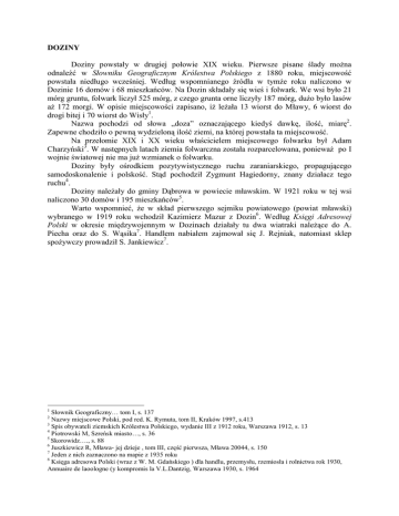 DOZINY Doziny powstały w drugiej połowie XIX wieku. Pierwsze pisane ślady można odnaleźć w Słowniku Geograficznym Królestwa Polskiego z 1880 roku, miejscowość powstała niedługo wcześniej. Według wspomnianego źródła w tymże roku naliczono w Dozinie 16 domów i 68 mieszkańców. Na Dozin składały się wieś i folwark. We wsi było 21 mórg gruntu, folwark liczył 525 mórg, z czego grunta orne liczyły 187 mórg, dużo było lasów aż 172 morgi. W opisie miejscowości zapisano, iż leżała 13 wiorst do Mławy, 6 wiorst do drogi bitej i 70 wiorst do Wisły1. Nazwa pochodzi od słowa „doza” oznaczającego kiedyś dawkę, ilość, miarę2. Zapewne chodziło o pewną wydzieloną ilość ziemi, na której powstała ta miejscowość. Na przełomie XIX i XX wieku właścicielem miejscowego folwarku był Adam Charzyński3. W następnych latach ziemia folwarczna została rozparcelowana, ponieważ po I wojnie światowej nie ma już wzmianek o folwarku. Doziny były ośrodkiem pozytywistycznego ruchu zaraniarskiego, propagującego samodoskonalenie i polskość. Stąd pochodził Zygmunt Hagiedorny, znany działacz tego ruchu4. Doziny należały do gminy Dąbrowa w powiecie mławskim. W 1921 roku w tej wsi naliczono 30 domów i 195 mieszkańców5. Warto wspomnieć, że w skład pierwszego sejmiku powiatowego (powiat mławski) wybranego w 1919 roku wchodził Kazimierz Mazur z Dozin6. Według Księgi Adresowej Polski w okresie międzywojennym w Dozinach działały tu dwa wiatraki należące do A. Piecha oraz do S. Wąsika7. Handlem nabiałem zajmował się J. Rejniak, natomiast sklep spożywczy prowadził S. Jankiewicz7. 1 Słownik Geograficzny… tom I, s. 137 Nazwy miejscowe Polski, pod red. K. Rymuta, tom II, Kraków 1997, s.413 3 Spis obywateli ziemskich Królestwa Polskiego, wydanie III z 1912 roku, Warszawa 1912, s. 13 4 Piotrowski M, Szreńsk miasto…, s. 36 5 Skorowidz…., s. 88 6 Juszkiewicz R, Mława- jej dzieje , tom III, część pierwsza, Mława 20044, s. 150 7 Jeden z nich zaznaczono na mapie z 1935 roku 8 Księga adresowa Polski (wraz z W. M. Gdańskiego ) dla handlu, przemysłu, rzemiosła i rolnictwa rok 1930, Annuaire de laoologne (y kompromis la V.L.Dantzig, Warszawa 1930, s. 1964 2