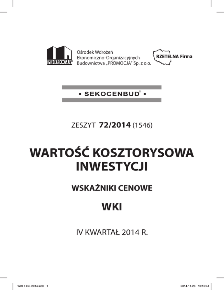 Ośrodek Wdrożeń Ekonomiczno-Organizacyjnych Budownictwa „PROMOCJA” Sp. z o.o. ZESZYT 72/2014 (1546) WARTOŚĆ KOSZTORYSOWA INWESTYCJI WSKAŹNIKI CENOWE WKI IV KWARTAŁ 2014 R. WKI 4 kw. 2014.indb 1 2014-11-26 10:16:44 SPIS TREŚCI 1. ZAŁOŻENIA METODYCZNE – WPROWADZENIE ........................................................................................ 3 2. WSKAŹNIKI KOSZTÓW WEDŁUG GRUP................................................................................................... 13 Grupa kosztów 1 Pozyskanie działki budowlanej ................................................................................... 13 Grupa kosztów 2 Przygotowanie terenu i przyłączenie obiektów do sieci ............................................. 24 NOWE POZYCJE Grupa kosztów 3 Budowa obiektów podstawowych .............................................................................. 31 NOWE POZYCJE Grupa kosztów 4 Instalacje .................................................................................................................... 58 Grupa kosztów 5 Zagospodarowanie terenu i obiekty pomocnicze ....................................................... 87 NOWE POZYCJE Grupa kosztów 6 Wyposażenie .............................................................................................................. 94 NOWE POZYCJE Grupa kosztów 7 Prace przygotowawcze, projektowe, obsługa inwestorska ....................................... 120 3. PODATEK OD TOWARÓW I USŁUG (VAT) .............................................................................................. 134 WSZELKIE PRAWA ZASTRZEŻONE Kopiowanie i reprodukowanie zarówno całości jak i fragmentów niniejszej publikacji jest niedozwolone Redaktor naczelna wydawnictw SEKOCENBUD, redaktor prowadząca zeszyt: Mariola Gala-de Vacqueret Zespół autorski: Mariola Gala-de Vacqueret, Andrzej Górniecki, Paweł Kaczmarski, Anna Łapczyńska, Elżbieta Pikiewicz, Małgorzata Płaneta, Wiesława Sikorska-Ożgo, Michał Wałdykowski, Andrzej Wypych Wydawca: Ośrodek Wdrożeń Ekonomiczno-Organizacyjnych Budownictwa PROMOCJA Sp. z o.o. 02-796 Warszawa, ul. Migdałowa 4, 22 24-25-400, 22 24-25-401 Sąd Rej. dla m.st. Warszawy XIII Wydz. Gosp. KRS 0000092639, Kapitał zakładowy 109 800 zł. [email protected] www.sekocenbud.pl Konto bankowe: Pekao S.A. O/Warszawa Nr 39 1240 5963 1111 0000 4798 9414 Druk: Poligrafia GREG Grzegorz Sitek, 05-400 Otwock, ul. A. Sołtana 7 ISSN 1231-2517 2 WKI WSTEP.indd 2 WKI 4/2014 2014-11-27 12:03:13 WPROWADZENIE 1. WPROWADZENIE I ZAŁOŻENIA METODYCZNE 1.1. Zakres zastosowania biuletynu Wskaźniki cenowe podane w tym zeszycie mogą być wykorzystywane do: a) ustalenia szacunkowych łącznych kosztów inwestycji i obliczenia wartości kosztorysowej inwestycji (WKI) jako: – składnika programu inwestycji finansowanej z budżetu państwa, – wyceny inwestycji przy składaniu wniosku o dofinansowanie ze środków unijnych, – podstawa ustalenia kwoty nakładów finansowych, jaką powinien dysponować inwestor dla zrealizowania inwestycji o założonym programie funkcjonalno-użytkowym, – podstawa opracowania studium wykonalności oraz oceny ekonomicznej efektywności inwestycji, – dokumentu niezbędnego do bieżącej kontroli wydatkowania środków finansowych w trakcie przygotowania i realizacji inwestycji, – podstawy opracowania harmonogramu finansowo-rzeczowego realizacji inwestycji oraz harmonogramu finansowania projektu. b) wyliczenia planowanych kosztów prac projektowych (WPP) oraz planowanych kosztów robót budowlanych (WRB), niezbędnych do ustalenia wartości zamówienia zgodnie z przepisami rozporządzenia Ministra Infrastruktury z dnia 18 maja 2004 r. w sprawie określenia metod i podstaw sporządzania kosztorysu inwestorskiego, obliczania planowanych kosztów prac projektowych oraz planowanych kosztów robót budowlanych określonych w programie funkcjonalno-użytkowym (przy zlecaniu łącznego wykonania prac projektowych i robót budowlanych), c) sporządzania kosztorysów inwestorskich na wyższym poziomie agregacji robót, d) szacowania wartości odtworzeniowej składników budowlanych nieruchomości przez rzeczoznawców majątkowych, e) wyceny prac projektowych jako funkcji kosztów robót budowlanych, f) wyceny prac przygotowawczych, geotechnicznych, obsługi inwestorskiej i geodezyjnej, g) ustalenia kosztów wyposażenia różnych obiektów budowlanych. Wartość kosztorysowa inwestycji (WKI) została określona po raz pierwszy w rozporządzeniu Rady Ministrów z dnia 2 października 2001 r. w sprawie szczegółowych zasad finansowania inwestycji z budżetu państwa (Dz. U. Nr 133, poz. 1480). Aktualnie tj. od 1 stycznia 2011 roku sposób i tryb finansowania inwestycji z budżetu państwa regulują przepisy rozporządzenia Rady Ministrów z dnia 2 grudnia 2010 r. w sprawie szczegółowego sposobu i trybu finansowania inwestycji z budżetu państwa ogłoszone w Dz. U. Nr 238 z 2010 r., poz. 1579. W § 2 pkt 6) tego rozporządzenia podano iż pod pojęciem – „szacunkowy łączny koszt inwestycji” – rozumie się koszt inwestycji ustalony na podstawie wskaźników cenowych określonych w ogólnodostępnych opracowaniach lub na podstawie kosztów zrealizowanej inwestycji o podobnej złożoności. Z kolei w § 4 podano iż decyzję o ujęciu finansowania inwestycji ze środków budżetu państwa w materiałach do projektu ustawy budżetowej, dysponenci części budżetowej będą mogli podjąć na podstawie uzgodnionego programu inwestycji zawierającego w zakresie kosztów: a) szacunkowy łączny koszt inwestycji lub b) wartość kosztorysową inwestycji. W 2003 roku Izba Projektowania Budowlanego, Stowarzyszenie Kosztorysantów Budowlanych oraz Zrzeszenie Biur Kosztorysowania Budowlanego (Zrzeszenie zakończyło działalność w roku 2005) opracowały i wydały „Środowiskowe zasady obliczania wartości kosztorysowej inwestycji budowlanych” stanowiące wz