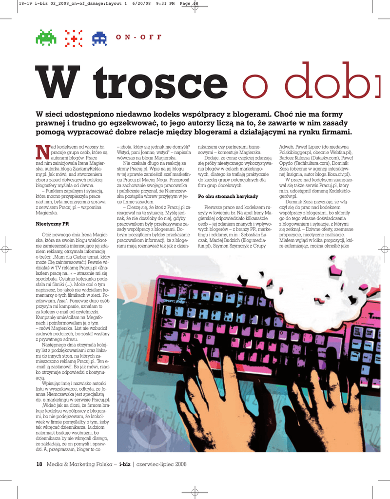 18-19 i-biz 02_2008_on-of_damage:Layout 1 6/20/08 9:31 PM Page 18 O N - O F F W trosce o dobr W sieci udostępniono niedawno kodeks współpracy z blogerami. Choć nie ma formy prawnej i trudno go egzekwować, to jego autorzy liczą na to, że zawarte w nim zasady pomogą wypracować dobre relacje między blogerami a działającymi na rynku firmami. ad kodeksem od wiosny br. pracuje grupa osób, które są autorami blogów. Prace nad nim zainicjowała Irena Magierska, autorka bloga ZjadamyReklamy.pl. Jak mówi, nad stworzeniem zbioru zasad dotyczących polskiej blogosfery myślała od dawna. – Punktem zapalnym i sytuacją, która mocno przyspieszyła prace nad nim, była nieprzyjemna sprawa z serwisem Pracuj.pl – wspomina Magierska. N Nieetyczny PR Otóż pewnego dnia Irena Magierska, która na swoim blogu wielokrotnie zamieszczała interesujące jej zdaniem reklamy, otrzymała informację o treści: „Mam dla Ciebie temat, który może Cię zainteresować:) Pewnie widziałaś w TV reklamę Pracuj.pl »Znalazłem pracę na...« – strasznie mi się spodobała. Ostatnio koleżanka podesłała mi filmiki (...). Może coś o tym napiszesz, bo jakoś nie widziałam komentarzy o tych filmikach w sieci. Pozdrawiam, Asia”. Ponieważ dużo osób przysyła mi kampanie, uznałam to za kolejny e-mail od czytelniczki. Kampanię umieściłam na Megafonach i poinformowałam ją o tym – mówi Magierska. List nie wzbudził żadnych podejrzeń, bo został wysłany z prywatnego adresu. Następnego dnia otrzymała kolejny list z podziękowaniami oraz linkami do innych stron, na których zamieszczono reklamę Pracuj.pl. Ten e-mail ją zastanowił. Bo jak mówi, rzadko otrzymuje odpowiedzi z kontynuacją. Wpisując imię i nazwisko autorki listu w wyszukiwarce, odkryła, że Joanna Niemczewska jest specjalistą ds. e-marketingu w serwisie Pracuj.pl. „Widać jak na dłoni, że firmom brakuje kodeksu współpracy z blogerami, bo nie podejrzewam, że ktokolwiek w firmie pomyślałby o tym, żeby tak wkręcać dziennikarza. Ludziom natomiast brakuje wyobraźni, bo dziennikarza by nie wkręcali dlatego, że zakładają, że on pomyśli i sprawdzi. A, przepraszam, bloger to co – idiota, który się jednak nie domyśli? Wstyd, pani Joanno, wstyd” – napisała wówczas na blogu Magierska. Nie czekała długo na reakcję ze strony Pracuj.pl. Wpis na jej blogu w tej sprawie zamieścił szef marketingu Pracuj.pl Maciej Noga. Przeprosił za zachowanie swojego pracownika i publicznie przyznał, że Niemczewska postąpiła wbrew przyjętym w jego firmie zasadom. – Cieszę się, że ktoś z Pracuj.pl zareagował na tę sytuację. Myślę jednak, że nie doszłoby do niej, gdyby pracownikom były przekazywane zasady współpracy z blogerami. Dobrym początkiem byłoby przekazanie pracownikom informacji, że z blogerami mają rozmawiać tak jak z dzien- 18 Media & Marketing Polska – i-biz | czerwiec-lipiec 2008 nikarzami czy partnerami biznesowymi – komentuje Magierska. Dodaje, że coraz częściej zdarzają się próby nieetycznego wykorzystywania blogów w celach marketingowych, dlatego że trafiają praktycznie do każdej grupy potencjalnych dla firm grup docelowych. Po obu stronach barykady Pierwsze prace nad kodeksem ruszyły w kwietniu br. Na apel Ireny Magierskiej odpowiedziało kilkanaście osób – jej zdaniem znanych i wpływowych blogerów – z branży PR, marketingu i reklamy, m.in.: Sebastian Łuczak, Maciej Budzich (Blog.mediafun.pl), Szymon Szymczyk z Grupy Adweb, Paweł Lipiec (do niedawna Polskiblogger.pl, obecnie Webfan.pl), Bartosz Kulesza (Datasky.com), Paweł Opydo (Techkultura.com), Dominik Koza (obecnie w agencji interaktywnej Insignia, autor bloga Koza.civ.pl). W prace nad kodeksem zaangażował się także serwis Pracuj.pl, który m.in. udostępnił domenę Kodeksblogerów.pl. Dominik Koza przyznaje, że włączył się do prac nad kodeksem współpracy z blogerami, bo skłoniły go do tego własne doświadczenia z blogowaniem i sytuacje, z którymi się zetknął. – Dziwne oferty, szemrane propozycje, nieetyczne realizacje. Miałem wgląd w kilka propozycji, które eufemizując, można określić jako 18-19 i-biz 02_2008_on-of_damage:Layout 1 6/20/08 10:59 PM Page 19 bre relacje takie jak kodeks inicjowane są w celu zwiększenia zaufania wobec blogów i napiętnowania sytuacji nieetycznych. niepoważne – wspomina. – Społeczność osób wyrażających swoje opinie w internecie, w tym w dużej mierze osób piszących blogi, dorasta. A każda dorastająca społeczność określa się poprzez to, na co się godzi, a czemu przeciwstawia – dodaje Koza. Tłumaczy, że blogerzy, których zna, to ludzie pracujący i wykształceni, których początkowe nieetyczne zachowania marketerów śmieszyły. Gdy jednak zachowania te przybrały na sile, postanowili zareagować. – Brak reakcji to w pewnej mierze akceptacja – twierdzi Koza. Z tych właśnie powodów powstał kodeks współpracy z blogerami. Skierowany zarówno do osób prowadzących blogi, aby poznały zagrożenia, jak i do tych, którzy biorą pod uwagę oszukiwanie ich czytelników za pomocą nieetycznych technik na firmowym lub niezależnym blogu. Powstał również z myślą o czytelnikach, aby byli świadomi, że działania Nie tylko we własnym interesie Kodeks współpracy z blogerami Zadbajmy o dobre stosunki TOMASZ WAWER 1. Po prostu kultura Autorzy kodeksu chcą promować dobre standardy kontaktu z blogerami i ich czytelnikami oraz tymi, którzy promują swoje produkty i usługi. Maciej Budzich, autor Blog.mediafun.pl, podkreśla, że kodeks ma pełnić funkcję informacyjno-edukacyjną. – Jest skierowany przede wszystkim do marketerów i pracowników firm, którzy planują działania związane z blogami. Sam często dostaję zapytania typu: „Proszę o posta na Pańskim blogu w zamian za link” – mówi Budzich. – Mam nadzieję, że przyda się on również blogerom, którzy, np. szukając sposobów