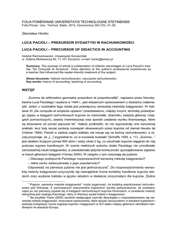 FOLIA POMERANAE UNIVERSITATIS TECHNOLOGIAE STETINENSIS Folia Pomer. Univ. Technol. Stetin. 2013, Oeconomica 303 (72), 41–50 Stanisław Hońko LUCA PACIOLI – PREKURSOR DYDAKTYKI W RACHUNKOWOŚCI LUCA PACIOLI – PRECURSOR OF DIDACTICS IN ACCOUNTING Instytut Rachunkowości, Uniwersytet Szczeciński ul. Adama Mickiewicza 64, 71-101 Szczecin, e-mail: [email protected] Summary. The purpose of article is presentation of didactic advantages of Luca Pacioli’s treatise “De Computis et Scripturis”. Drew attention to the author's professional experiences as a teacher that influenced the reader-friendly treatment of the subject. Słowa kluczowe: historia rachunkowości, nauczanie rachunkowości. Key words: history of accounting, teaching of accounting. WSTĘP „Summa de arithmetica geometria proportioni et proportionalità”, napisana przez franciszkanina Luca Paciolego i wydana w 1494 r., jest obszernym opracowaniem z dziedziny matematyki. Jeden z rozdziałów tego dzieła jest poświęcony weneckiej metodzie księgowości. W traktacie XI „De computis et scripturis opisano” przedstawiono, między innymi, technikę podwójnego zapisu w księgach rachunkowych kupców (w memoriale, dzienniku, księdze głównej i księgach pomocniczych), zasady inwentaryzacji oraz sposób ustalania wyniku finansowego, które są stosowane od ponad pięciuset lat1. Należy podkreślić, że nie wyprzedzały one ówczesnej praktyki, lecz były raczej syntezą rozwiązań stosowanych przez kupców od niemal dwustu lat (Volmer 1994). Pacioli w żadnej części traktatu nie kreuje się na twórcę rachunkowości, a raczej przyznaje, że „[...] wygrzebał to, co w kurzawie butwiało” (Scheffs 1939, s. 11). „Summa...” jest dziełem liczącym ponad 600 stron i waży około 2 kg, co utrudniało kupcom sięganie do niej podczas wypraw handlowych. W ocenie niektórych autorów dzieło Paciolego nie umożliwiało samodzielnej nauki księgowości, a uświadamiało jedynie konieczność uporządkowania zapisów w trzech głównych księgach (Yamey 2004). W związku z tym nasuwają się pytania: – Dlaczego podręcznik Paciolego rozpowszechnił wenecką metodę księgowości? – Jakie cechy zadecydowały o jego popularności? Odpowiedź na pierwsze pytanie nie jest jednoznaczna2. Do rozpowszechnienia weneckiej metody księgowości przyczyniły się niewątpliwie liczne kontakty handlowe kupców włoskich oraz wydanie traktatu w języku włoskim w dialekcie zrozumiałym dla kupców. Żadne 1 Pojęcie „wenecka metoda księgowości” może sugerować, że kolebką współczesnej rachunkowości jest Wenecja. Z zachowanych dokumentów kupieckich wynika jednoznacznie, że podwójny zapis po raz pierwszy pojawił się w księgach rachunkowych kupców florenckich, a utrwalenie metody weneckiej jest zasługą Paciolego, który w Wenecji wydał traktat o księgowości. 2 Na przykład Yame (2004) wyróżnił następujące czynniki decydujące o rozprzestrzenieniu się weneckiej metody księgowości: drukowane opracowania, które służyły nauczycielom w szkołach kupieckich i podczas korepetycji, liczne migracje kupców i księgowych w XVI wieku między głównymi ośrodkami handlowymi na obszarze Europy. 42 S. Hońko z późniejszych opracowań, poświęconych weneckiej metodzie księgowości z XVI i XVII wieku, nie zdobyło uznania i rozgłosu porównywalnego z „Summą...” Paciolego. Potwierdzeniem tego może być przetłumaczenie traktatu o księgowości na 12 języków w ciągu 100 lat od ukazania się publikacji3. Można zatem przypuszczać, że źródłem sukcesu podręcznika Paciolego, poza zawartością merytoryczną, był sposób ujęcia tematu. Na potrzeby niniejszego artykułu sformułowano tezę, że głównym czynnikiem decydującym o sukcesie podręcznika Paciolego były walory dydaktyczne. Celem artykułu jest przedstawienie metod dydaktycznych zastosowanych przez Paciolego. Inspiracją do podjęcia tematu i ważnym źródłem był referat: A. Sangstera (z Middlesex University Business School) i G. Scataglini Belghitara (z Balliol College, University of Oxford): „Luca Pacioli: the father of accounting education”, wygłoszony na konferencji historyków rachunkowości w Cadriff we wrześniu 2010 r. Autorzy ci stwierdzili, że Pacioli miał doskonałe podejście pedagogiczne, gdyż potrafił zaangażować uczniów w proces nauczania, a także zwiększyć ich zainteresowanie omawianą tematyką. Stosował przy tym metody dydaktyczne, które nawet współcześnie mogą być uznane za innowacyjne (Sangster i Scataglini Belghitar 2010). „Summa...” Paciolego stanowi interesujące źródło informacji o autorze jako nauczycielu, objaśniającym tajniki księgowości z perspektywy mistrza dzielącego się własnym doświadczeniem. Co ciekawe, z żadnej biografii Paciolego nie wynika, że kiedykolwiek zajmował się on handlem lub prowadził ewidencję księgową. Był jednak niezwykle wszechstronnym nauczycielem i naukowcem, o czym będzie mowa w dalszej części artykułu. MATERIAŁ I METODY Podstawowym materiałem, wykorzystanym w badaniach na potrzeby niniejszego tekstu, były anglojęzyczne opracowania poświęcone narzędziom dydaktycznym stosowanym w opracowaniu Paciolego z 1494 r. Na ich podstawie poddano analizie tytułowy traktat, systematyzując zastosowane narzędzia wraz z przykładami. WYNIKI I DYSKUSJA Doświadczenie dydaktyczne Luca Paciolego Pacioli, w trakcie pisania „Summy...” miał za sobą ponad trzydziestoletnie doświadczenie dydaktyczne. Może to prowadzić do wniosku, że adresatami „Summy...” byli nie tylko kupcy, ale również uczniowie szkół, w których Pacioli nauczał. Szkoły te, nazywane abbaco, można porównać z dzisiejszymi szkołami średnimi. Na uwagę zasługuje fakt, że w czasie swojej kariery dydaktycznej Pacioli łączył funkcję nauczyciela w szkole średniej z pracą na uniwersytecie, co w jego czasach było rzadko spotykane. Powszechną prakt