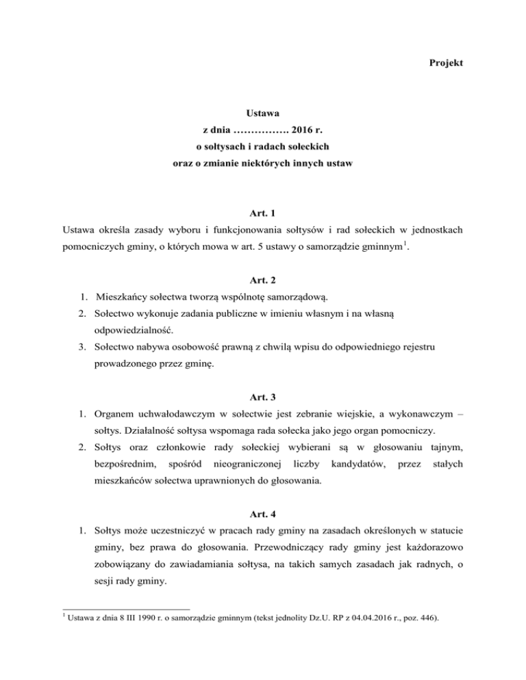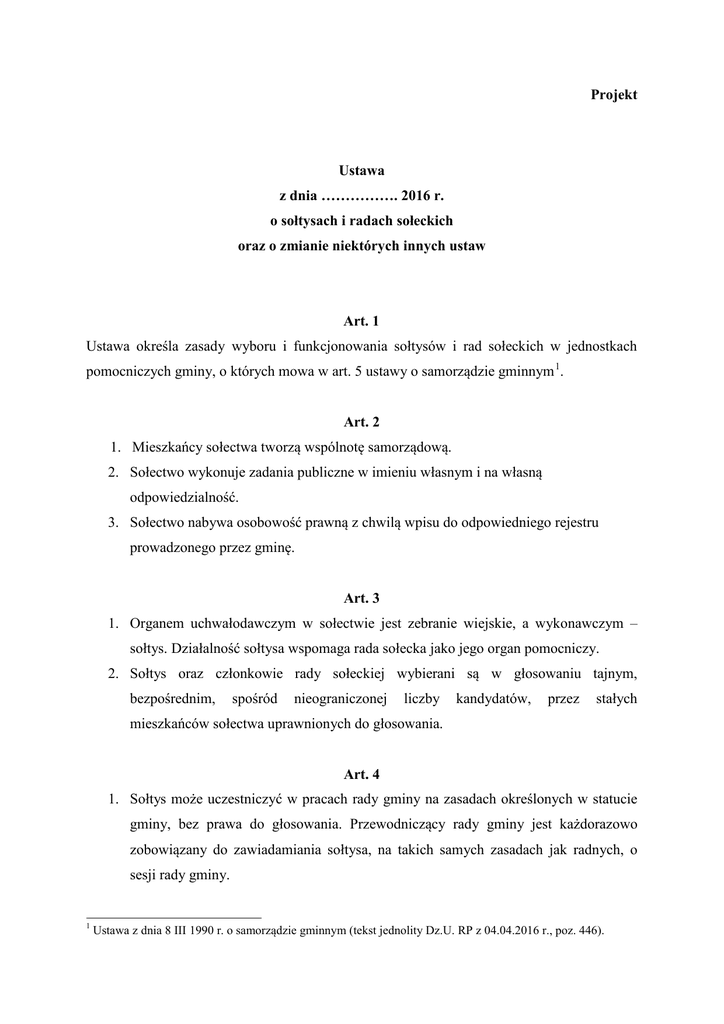 Projekt Ustawa z dnia ……………. 2016 r. o sołtysach i radach sołeckich oraz o zmianie niektórych innych ustaw Art. 1 Ustawa określa zasady wyboru i funkcjonowania sołtysów i rad sołeckich w jednostkach pomocniczych gminy, o których mowa w art. 5 ustawy o samorządzie gminnym 1. Art. 2 1. Mieszkańcy sołectwa tworzą wspólnotę samorządową. 2. Sołectwo wykonuje zadania publiczne w imieniu własnym i na własną odpowiedzialność. 3. Sołectwo nabywa osobowość prawną z chwilą wpisu do odpowiedniego rejestru prowadzonego przez gminę. Art. 3 1. Organem uchwałodawczym w sołectwie jest zebranie wiejskie, a wykonawczym – sołtys. Działalność sołtysa wspomaga rada sołecka jako jego organ pomocniczy. 2. Sołtys oraz członkowie rady sołeckiej wybierani są w głosowaniu tajnym, bezpośrednim, spośród nieograniczonej liczby kandydatów, przez stałych mieszkańców sołectwa uprawnionych do głosowania. Art. 4 1. Sołtys może uczestniczyć w pracach rady gminy na zasadach określonych w statucie gminy, bez prawa do głosowania. Przewodniczący rady gminy jest każdorazowo zobowiązany do zawiadamiania sołtysa, na takich samych zasadach jak radnych, o sesji rady gminy. 1 Ustawa z dnia 8 III 1990 r. o samorządzie gminnym (tekst jednolity Dz.U. RP z 04.04.2016 r., poz. 446). 2. W pracach rady gminy, z upoważnienia sołtysa, może uczestniczyć, w ramach uprawnień przyznanych sołtysom, członek rady sołeckiej upoważniony pisemnie przez sołtysa. Art. 5 1. Rada gminy ustanawia zasady na jakich sołtysom oraz członkom rad sołeckich będzie przysługiwała dieta lub zwrot kosztów podróży służbowej. 2. Niezależnie od diet i zwrotu kosztów podróży służbowych sołtysom przysługuje zryczałtowane wynagrodzenie związane z pełnioną funkcją, wynoszące w skali miesięcznej połowę minimalnego wynagrodzenia określonego na podstawie ustawy o minimalnym wynagrodzeniu za pracę 2. 3. Sołtys w związku z pełnioną funkcją nawiązuje stosunek pracy na podstawie wyboru. 4. Kwoty, o których mowa w ust. 1 i 2 nie obciążają funduszu sołeckiego. 5. Kwoty, o których mowa w ust. 2 pochodzą z budżetu państwa. Art. 6 1. Sołtys korzysta z ochrony prawnej przysługującej funkcjonariuszom publicznym. Art. 7 1. Sołectwo zarządza i korzysta z mienia komunalnego oraz rozporządza dochodami z tego źródła w zakresie określonym w statucie. Statut ustala również zakres czynności dokonywanych samodzielnie przez sołectwo w zakresie przysługującego jej mienia. 2. Sołectwo może również wykonywać inną, niż określona w ust. 1, działalność pożytku publicznego. 3. Rada gminy nie może uszczuplić dotychczasowych praw sołectw do korzystania z mienia bez zgody zebrania wiejskiego. 4. Wszystkie przysługujące dotychczas mieszkańcom wsi prawa własności, użytkowania lub inne prawa rzeczowe i majątkowe, zwane dalej mieniem sołeckim, pozostają nienaruszalne. 5. Do mienia gminnego mają zastosowanie, z zastrzeżeniem ust. 3, przepisy dotyczące mienia komunalnego. Ustawa z dnia 10 X 2002 r. o minimalnym wynagrodzeniu za pracę (tekst jednolity Dz.U. RP z 01.12.2015 r., poz. 208). 2 Art. 8 1. Organizację i zakres działania sołectwa określa rada gminy statutem, po przeprowadzeniu konsultacji z mieszkańcami. 2. Statut może przewidywać powołanie jednostki niższego rzędu w ramach sołectwa. 3. Statut sołectwa określa w szczególności: 1) nazwę i obszar sołectwa; 2) zasady i tryb wyborów organów sołectwa, w tym kwestie prawomocności zebrania wiejskiego; 3) organizację i zadania organów sołectwa; 4) zakres zadań przekazywanych sołectwu przez gminę oraz sposób ich realizacji; 5) zakres i formy kontroli oraz nadzoru organów gminy nad działalnością organów sołectwa. Art. 9 1. Zadania z zakresu obsługi administracyjno-organizacyjnej prowadzi właściwa miejscowo gmina. 2. Zadania związane z obsługą finansową prowadzi właściwy miejscowo wójt. Art. 10 Sołectwa istniejące w chwili uchwalenia ustawy otrzymują osobowość prawną z mocy ustawy. Art. 11 W ustawie z dnia z dnia 24 kwietnia 2003 r. o działalności pożytku publicznego i o wolontariacie 3 wprowadza się następujące zmiany: 1. w art. 3 ust. 3 pkt 5 otrzymuje brzmienie: „5) sołectwa” Art. 12 W ustawie z dnia 8 marca 1990 r. o samorządzie gminnym wprowadza się następujące zmiany: Ustawa z dnia 24 IV 2003 r. o działalności pożytku publicznego i o wolontariacie (tekst jednolity Dz.U. RP z 26.02.2016 r., poz. 239). 3 1. skreśla się art. 36; 2. w art. 37b ust. 2 skreśla się zwrot „rady sołeckiej” Art. 13 Ustawa wchodzi w życie z dniem 1 stycznia 2017 r. Uzasadnienie Instytucja sołtysa funkcjonuje w przestrzeni publicznej polskiej wsi od wieków. Urząd ten stał się jednym z najbardziej charakterystycznych składników zorganizowanego życia osiadłych społeczności wiejskich. Sołtys pełni bardzo ważną rolę w społecznym życiu wsi. Jest nie tylko reprezentantem sołectwa, lecz także inicjatorem przedsięwzięć służących społeczności wiejskiej. Cieszy się autorytetem i społecznym uznaniem. Istotą wnoszonego projektu ustawy jest dowartościowanie i wzmocnienie pozycji sołtysa i rady sołeckiej. Zgodnie z art. 15 ust. 1 ustawy z dnia 2 kwietnia 1997 r. – Konstytucja Rzeczypospolitej Polskiej (Dz.U. nr 78, poz. 443, ze zm.) ustrój terytorialny RP zapewnia decentralizację władzy publicznej. Oznacza to, że ustrój nasz jest zbudowany na zasadzie przekazywania jak największej liczby kompetencji do wspólnot lokalnych, a ponadto siła państwa bierze się z przywiązania obywateli do wspólnot, w których zamieszkują. Jest bowiem oczywistym, że naturalną cechą człowieka jest dbałość o otoczenie, w którym mieszka i pracuje. W Polsce najmniejszą jednostką organizacyjną, na której żyją ludzie, jest sołectwo – tworzone na podstawie ustawy z dnia 8 marca 1990 r. o samorządzie gminnym (Dz.U. RP z 2016 