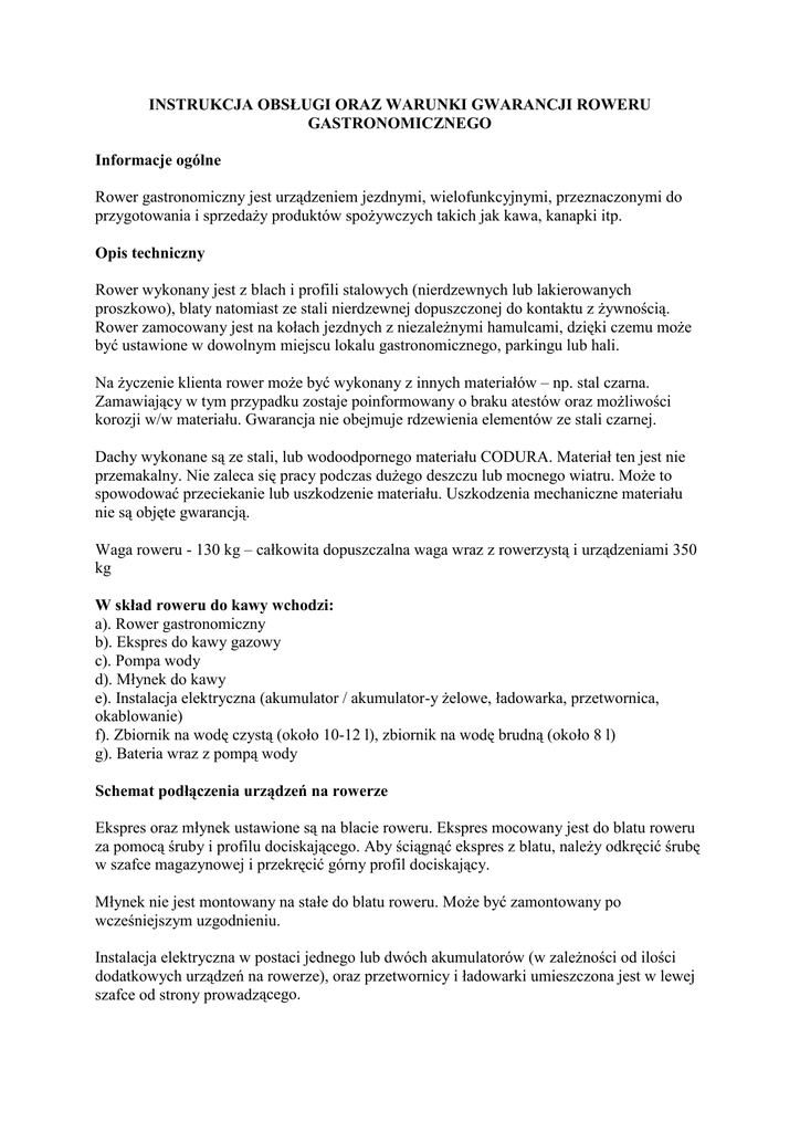 INSTRUKCJA OBSŁUGI ORAZ WARUNKI GWARANCJI ROWERU GASTRONOMICZNEGO Informacje ogólne Rower gastronomiczny jest urządzeniem jezdnymi, wielofunkcyjnymi, przeznaczonymi do przygotowania i sprzedaŜy produktów spoŜywczych takich jak kawa, kanapki itp. Opis techniczny Rower wykonany jest z blach i profili stalowych (nierdzewnych lub lakierowanych proszkowo), blaty natomiast ze stali nierdzewnej dopuszczonej do kontaktu z Ŝywnością. Rower zamocowany jest na kołach jezdnych z niezaleŜnymi hamulcami, dzięki czemu moŜe być ustawione w dowolnym miejscu lokalu gastronomicznego, parkingu lub hali. Na Ŝyczenie klienta rower moŜe być wykonany z innych materiałów – np. stal czarna. Zamawiający w tym przypadku zostaje poinformowany o braku atestów oraz moŜliwości korozji w/w materiału. Gwarancja nie obejmuje rdzewienia elementów ze stali czarnej. Dachy wykonane są ze stali, lub wodoodpornego materiału CODURA. Materiał ten jest nie przemakalny. Nie zaleca się pracy podczas duŜego deszczu lub mocnego wiatru. MoŜe to spowodować przeciekanie lub uszkodzenie materiału. Uszkodzenia mechaniczne materiału nie są objęte gwarancją. Waga roweru - 130 kg – całkowita dopuszczalna waga wraz z rowerzystą i urządzeniami 350 kg W skład roweru do kawy wchodzi: a). Rower gastronomiczny b). Ekspres do kawy gazowy c). Pompa wody d). Młynek do kawy e). Instalacja elektryczna (akumulator / akumulator-y Ŝelowe, ładowarka, przetwornica, okablowanie) f). Zbiornik na wodę czystą (około 10-12 l), zbiornik na wodę brudną (około 8 l) g). Bateria wraz z pompą wody Schemat podłączenia urządzeń na rowerze Ekspres oraz młynek ustawione są na blacie roweru. Ekspres mocowany jest do blatu roweru za pomocą śruby i profilu dociskającego. Aby ściągnąć ekspres z blatu, naleŜy odkręcić śrubę w szafce magazynowej i przekręcić górny profil dociskający. Młynek nie jest montowany na stałe do blatu roweru. MoŜe być zamontowany po wcześniejszym uzgodnieniu. Instalacja elektryczna w postaci jednego lub dwóch akumulatorów (w zaleŜności od ilości dodatkowych urządzeń na rowerze), oraz przetwornicy i ładowarki umieszczona jest w lewej szafce od strony prowadzącego. Zbiorniki na czystą oraz brudną wodę, pompa wody oraz pompa do baterii umieszczone są w prawej szafce od strony prowadzącego. Miejsce na butlę gazową 3 lub 5 kg (JG Gastro dostarcza rower bez butli gazowej) znajduje się w szafce otwieranej od przodu roweru. Pompa wody podłączona jest elektryczne do ekspresu. Jeden wąŜ pobiera wodę ze zbiornika na czystą wodę, drugi wąŜ podłączony jest do ekspresu. Ekspres podłączony jest do instalacji elektrycznej oraz miękkim węŜem do butli gazowej z reduktorem. Z ekspresu wychodzi rura odprowadzająca wodę do zbiornika na brudną wodę. Młynek podłączony jest do instalacji elektrycznej. Bateria przy zlewie połączona jest z pompą wody. Pompa wody zanurzona jest w zbiorniku na czysta wodę (tym samym, który słuŜy do robienia kaw). Bateria podłączona jest bezpośrednio do akumulatora. Po odkręceniu kranu elektrozawór steruje pompą wody. Standardowo rower posiada wodę „neutralną” – nie posiada ciepłej i zimnej wody. MoŜe taką posiadać po wcześniejszym uwzględnieniu przy zamówieniu. Przygotowanie roweru do pracy WAśNE: Przed wyjechaniem roweru z magazynu do pracy, naleŜy wykonać „przedgrzew”. Ekspres naleŜy podpiąć do zewnętrznego źródła prądu, oraz zagrzać wodę w bojlerze na grzałce elektrycznej. W przeciwnym wypadku, zagrzanie roweru „w terenie” moŜe trwać dłuŜej. Instalacja elektryczna powinna być naładowana do pełna. Instalację ładuje się poprzez podłączenie jedynego wychodzącego z niej kabla to gniazdka 230 V. Ładowanie podstawowej instalacji z jednym akumulatorem powinno trwać około 6 godzin. Instalacja elektryczna posiada wyświetlacz, na którym widać stopień naładowania. Nienaładowane akumulatory do pełna mogą skutkować krótszym czasem pracy. Koła powinny być napompowane, zawiasy nasmarowane, hamulce sprawdzone. Rower przystosowany jest do przemieszczania się nim na krótkich odcinkach po płaskiej i nie wyboistej powierzchni, zwłaszca, gdy obciąŜony jest towarem. W trakcie jazdy butla gazowa powinna być zakręcona oraz przymocowana, w taki sposób, aby nie miała moŜliwości przewrócenia się. Ekspres powinien być przykręcony do blatu, młynek zabezpieczony w taki sposób, aby nie spadł w trakcie jazdy, wszystkie szafki powinny być zamknięte na kluczyk. Rowery nie posiadają homologacji. Po ustawieniu roweru w przewidzianej lokalizacji naleŜy zablokować koła hamulcami. Instalacja elektryczna Bezpieczeństwo uŜytkowania: 1. Nie naleŜy przeciąŜać urządzenia. Praca pod większym obciąŜeniem niŜ znamionowe moŜe spowodować uszkodzenie przetwornicy 2. Wysokie napięcie moŜe utrzymywać się na wewnętrznych elementach urządzenia nawet po wyłączeniu go. Zabrania się otwierania obudowy. Wszelkie naprawy mogą być wykonywane tylko przez wykwalifikowany serwis. 3. W przypadku poŜaru naleŜy uŜywać gaśnic proszkowych. Stosowanie wody grozi poraŜeniem. 4. W przypadku nieprawidłowej pracy urządzenia naleŜy je natychmiast wyłączyć, a następnie odłączyć wtyczkę gniazda sieciowego i akumulator. KaŜde podłączone źródło moŜe stanowić zagroŜenie. 5. Nie naleŜy zbyt głęboko rozładowywać akumulatora. MoŜe to spowodować jego krótsze działanie. 6. W przypadku awarii skontaktować się z serwisem. Sygnalizacja dźwiękowa: Pojedynczy sygnał dźwiękowy - Zanik napięcia sieci 230V, przełączenie na zasilanie z akumulatorów. Sygnał dźwiękowy co 1s - Niski poziom naładowania akumulatorów lub przeciąŜenie przetwornicy. Szybkie sygnały dźwiękowe - Awaria, zwarcie lub przegrzanie. Obsługa urządzenia: Wyłącznik przetwornicy (zielony klawisz na froncie urządzenia) – wciśnięcie i przytrzymanie wyłącznika prz