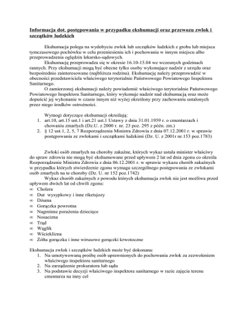 Informacja dot. postępowania w przypadku ekshumacji oraz przewozu zwłok i szczątków ludzkich Ekshumacja polega na wydobyciu zwłok lub szczątków ludzkich z grobu lub miejsca tymczasowego pochówku w celu przeniesienia ich i pochowania w innym miejscu albo przeprowadzenia oględzin lekarsko-sądowych. Ekshumację przeprowadza się w okresie 16.10-15.04 we wczesnych godzinach rannych. Przy ekshumacji mogą być obecne tylko osoby wykonujące nadzór z urzędu oraz bezpośrednio zainteresowane (najbliższa rodzina). Ekshumację należy przeprowadzić w obecności przedstawiciela właściwego terytorialnie Państwowego Powiatowego Inspektora Sanitarnego. O zamierzonej ekshumacji należy powiadomić właściwego terytorialnie Państwowego Powiatowego Inspektora Sanitarnego, który wykonuje nadzór nad ekshumacją oraz może dopuścić jej wykonanie w czasie innym niż wyżej określony przy zachowaniu ustalonych przez niego środków ostrożności. Wymogi dotyczące ekshumacji określają: 1. art.10, art.15 ust.1 i art.21 ust.1 Ustawy z dnia 31.01.1959 r. o cmentarzach i chowaniu zmarłych (Dz.U. z 2000 r. nr. 23 poz. 295 z późn. zm.) 2. § 12 ust.1, 2, 5, 7 Rozporządzenia Ministra Zdrowia z dnia 07.12.2001 r. w sprawie postępowania ze zwłokami i szczątkami ludzkimi (Dz. U. z 2001r nr.153 poz.1783) Zwłoki osób zmarłych na choroby zakaźne, których wykaz ustala minister właściwy do spraw zdrowia nie mogą być ekshumowane przed upływem 2 lat od dnia zgonu co określa Rozporządzenie Ministra Zdrowia z dnia 06.12.2001 r. w sprawie wykazu chorób zakaźnych w przypadku których stwierdzenie zgonu wymaga szczególnego postępowania ze zwłokami osób zmarłych na te choroby (Dz. U. nr 152 poz.1742) Wykaz chorób zakaźnych z powodu których ekshumacja zwłok nie jest możliwa przed upływem dwóch lat od chwili zgonu: • Cholera • Dur wysypkowy i inne riketsjozy • Dżuma • Gorączka powrotna • Nagminne porażenia dziecięce • Nosacizna • Trąd • Wąglik • Wścieklizna • Żółta gorączka i inne wirusowe gorączki krwotoczne Ekshumacja zwłok i szczątków ludzkich może być dokonana: 1. Na umotywowaną prośbę osób uprawnionych do pochowania zwłok za zezwoleniem właściwego inspektora sanitarnego 2. Na zarządzenie prokuratora lub sądu 3. Na podstawie decyzji właściwego inspektora sanitarnego w razie zajęcia terenu cmentarza na inny cel Wniosek o wydanie zezwolenia na ekshumację zawierający prośbę o wydanie zgody wraz z uzasadnieniem składa się do właściwego terytorialnie Państwowego Powiatowego Inspektora Sanitarnego. Do wniosku należy dołączyć: 1. Odpis aktu zgonu 2. Zgody zarządców cmentarzy 3. Zgody członków rodziny zmarłego • • • • • • Do złożenia wniosku o wydanie zezwolenia na ekshumację uprawniona jest najbliższa pozostała rodzina osoby zmarłej a mianowicie: pozostały małżonek (małżonka) osoby zmarłej krewni zstępni (potomek w linii prostej: dziecko, wnuk, prawnuk, itd.) krewni wstępni (przodek w linii prostej : rodzice, dziadkowie, pradziadkowie, itd.) krewny boczny do czwartego stopnia pokrewieństwa powinowaty w linii prostej do pierwszego stopnia pokrewieństwa osoba dobrowolnie do tego zobowiązująca się Jeżeli między członkami rodziny powstaje spór dotyczący ekshumacji osobą (osobami) uprawnioną (uprawnionymi) do złożenia wniosku o ekshumację będzie osoba (osoby) wskazana (wskazane) prawomocnym rozstrzygnięciem sądu. Państwowy Powiatowy Inspektor Sanitarny po zapoznaniu się z dokumentacją wydaje zawiadomienie o wszczęciu postępowania zaś po jego uprawomocnieniu przesyła wszystkim stronom wymienionym we wniosku oraz zarządcom cmentarzy decyzję zezwalającą na dokonanie ekshumacji. Zarówno zawiadomienie o wszczęciu postępowania jak i decyzja zezwalająca dostarczane są do zainteresowanych stron za zwrotnym potwierdzeniem odbioru. Ekshumacja zwłok lub szczątków ludzkich nie może zostać dokonana przed uprawomocnieniem się decyzji zezwalającej na jej przeprowadzenie. Ekshumacją i przewozem zwłok lub szczątków ludzkich zajmują się uprawnione do tego celu podmioty prowadzące działalność zgodnie z Polską Klasyfikacją Działalności (PKD) tj. pogrzeby i działalność pokrewna. Prawidłowo wypełniony wniosek o wydanie zezwolenia na ekshumację zwłok lub szczątków ludzkich winien zawierać: 1. • • • • • • • Dane dotyczące zmarłego: Imię i nazwisko Nazwisko rodowe Data i miejsce urodzenia Data i miejsce zgonu Przyczyna zgonu (choroba zakaźna-tak/nie- zakreślić) Adres cmentarza na którym zwłoki lub szczątki są pochowane Adres cmentarza na który zwłoki lub szczątki mają być przeniesione 2. • • • • • Dane wnioskodawcy: Imię i nazwisko Dokładny adres zamieszkania wraz z numerem kodu pocztowego Stopień pokrewieństwa wnioskodawcy do zmarłego Seria i numer dowodu osobistego, przez kogo wydany Numer PESEL, numer telefonu 3. Informacje dotyczące ekshumacji • Uzasadnienie wniosku o zezwolenie na ekshumację • Nazwę i adres firmy przeprowadzającej ekshumację wraz z numerem kodu pocztowego i numerem telefonu • Środek transportu do przewozu ekshumowanych zwłok lub szczątków ludzkich (marka, numer rejestracyjny samochodu) 4. Wykaz członków rodziny uprawnionych do współdecydowania w sprawie będącej przedmiotem wniosku o ekshumację zwłok lub szczątków ludzkich: • Imię, nazwisko, seria i nr dowodu osobistego, stopień pokrewieństwa w stosunku do osoby zmarłej, dokładny adres zamieszkania wraz z numerem kodu pocztowego oraz czytelny podpis 5. Oświadczenie wnioskodawcy, że osoby-członkowie rodziny uprawnieni do współdecydowania w sprawie będącej przedmiotem wniosku o ekshumację nie wyrażają sprzeciwu oraz że w sprawie dot. ekshumacji nie toczy się jakikolwiek spór sądowy Wnioskodawca oświadcza również, że wszystkie dane zawarte we wniosku są prawdziwe i bierze za nie pełną odpo