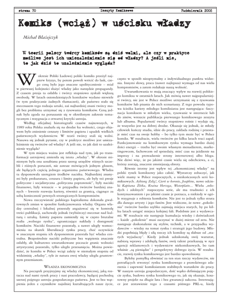 Zeszyty Komiksowe strona 70 Październik 2008 Komiks (wciąż) w uścisku władzy Michał Błażejczyk W teorii polscy twórcy komiksów są dziś wolni, ale czy w praktyce możliwe jest ich uniezależnienie się od władzy? A jeśli nie, to jak dziś to uzależnienie wygląda? W okresie Polski Ludowej polski komiks przeżył najpierw kryzys, by potem powoli wrócić do łask, czego ceną było jego znaczne upolitycznienie – miał w pierwszej kolejności służyć władzy jako narzędzie propagandy. Z czasem presja ta osłabła i twórcy stopniowo zyskali większą swobodę. W latach osiemdziesiątych komiksów wydano niewiele (w tym praktycznie żadnych tłumaczeń), ale państwo stało się mecenasem tego rodzaju sztuki, zaś najbardziej znani twórcy mogli bez problemu utrzymać się z rysowania komiksów. Ceną jednak była zgoda na poruszanie się w określonym zakresie tematycznym i rezygnacja z otwartej krytyki ustroju. Według oficjalnej historiografii czasów najnowszych, w 1989 roku Polska znalazła się na drodze ku wolności, czego objawem było zniesienie cenzury i limitów papieru i upadek wielkich państwowych wydawnictw. W teorii twórcy stali się wolni. Nasuwa się jednak pytanie, czy w praktyce możliwe jest uniezależnienie się twórców od władzy? A jeśli nie, to jak dziś to uzależnienie wygląda? W tym miejscu ważna jest refleksja nad tym, jak po transformacji ustrojowej zmieniła się istota „władzy”. W okresie minionym była ona uosabiana przez szereg urzędów różnych szczebli i różnych poruczeń, nie zawsze mówiących jednym głosem, ale będących częścią jednego organizmu państwowego. Władza ta dysponowała szeregiem środków nacisku. Najbardziej znanymi były prokuratura, cenzura i limity papieru, ale były też presje polityczne i socjalistyczna „polityczna poprawność”, były naciski finansowe, były wreszcie – w przypadku twórców bardziej znanych – kwestie rozwoju kariery, również za granicą, ciągnące za sobą konieczność pewnych strategicznych kompromisów. Nowa rzeczywistość polskiego kapitalizmu dokonała gwałtownych zmian w sposobie funkcjonowania władzy. Organa władzy centralnej i lokalnej przestały angażować się w kontrolę treści publikacji, zachowały jednak (wybiórczy) mecenat nad kulturą i sztuką. Limity papieru zamieniły się w często brutalne realia „wolnego rynku”, ograniczające nakłady i dostępność komiksów. Naciski finansowe pozostały, a nawet uległy wzmocnieniu na skutek liberalizacji rynku pracy, choć oczywiście w znacznym stopniu ich dysponentem przestała być władza centralna. Bezpośrednie naciski polityczne bez wątpienia znacznie osłabły, ale kulturowo uwarunkowane poczucie granic wolności artystycznej pozostało, tylko uległo przesunięciu. Można powiedzieć, że komiks w Polsce wciąż zależy w niemałym stopniu od widzimisię „władzy”, tyle że natura owej władzy uległa gruntownym przemianom. WŁADZA EKONOMICZNA Na początek przyjrzyjmy się władzy ekonomicznej, jaką roztacza nad nami rynek pracy i nasi pracodawcy, będącej pochodną szerzej pojętego ustroju gospodarczego państwa. Jest to bez wątpienia jeden z czynników najsilniej kształtujących nasze życie, często w sposób nieoptymalny z indywidualnego punktu widzenia. Innymi słowy, praca (nawet najlepsza) wymaga od nas wielu kompromisów, a zatem redukuje naszą wolność. Uwarunkowania te mają znaczący wpływ na rozwój polskiego komiksu w ostatnich latach. Jak mówią nawet najpopularniejsi twórcy, nie jest w Polsce możliwe utrzymanie się z rysowania komiksów lub pisania do nich scenariuszy. Z tego powodu typowa ścieżka kariery młodego komiksiarza jest następująca: fascynacja komiksem w młodym wieku, rysowanie w internecie lub do zinów, wreszcie publikacja pierwszego komiksowego zeszytu lub albumu. Popularność twórcy stopniowo rośnie i wydaje się, że wszystko jest na dobrej drodze. Okazuje się jednak, że młody człowiek kończy studia, idzie do pracy, zakłada rodzinę i przestaje mieć czas na swoje hobby – bo tylko tym może być w Polsce komiks. W rezultacie, wielu twórców po kilku latach traci zapał. Funkcjonowanie na komiksowym rynku wymaga bardzo dużej ilości energii – trzeba być swoim własnym menadżerem, marketingowcem, fachowcem od sprzedaży, mieć czas na jeżdżenie na imprezy i na prowadzenie strony internetowej albo bloga. Nie dziwi więc, że po jakimś czasie wielu się odechciewa, a ci, którzy zostają, znacznie zmniejszają obroty. Równie istotny jest wpływ tej „ekonomicznej władzy” na polski rynek komiksowy jako całość. Wystarczy zobaczyć, jak wiele mamy w Polsce rozpoczętych, a nieskończonych serii komiksowych. Achtung Zelig!, Cierń w koronie, Josephine, nowe odcinki Kapitana Żbika, Kraina Herzoga, Westerplatte... Wielu „młodych i zdolnych” rozpoczyna serie, ale ma trudności z ich kontynuowaniem i po jakimś czasie je porzuca, a niekiedy w ogóle rezygnuje z robienia komiksów. Nie jest to jednak tylko strata dla danego artysty i jego fanów. Jest widoczne, że nowe „pokolenia” twórców bardzo szybko zajmują miejsca starych, by po kilku latach ustąpić miejsca kolejnej fali. Podobnie jest z wydawcami. W rezultacie nie następuje kumulacja wiedzy i doświadczeń – każde „pokolenie” musi zaczynać w dużej mierze od zera. Nie następuje doskonalenie się stylów, technik, a w przypadku wydawców – wiedzy na temat rynku i strategii jego budowy. Młodzi popełniają błędy i siłą rzeczy ich komiksy są słabsze od „starych wyjadaczy”. Kiedy jednak udoskonalą swój warsztat, nabiorą wprawy i zdobędą fanów, swój talent przekazują w ręce agencji reklamowych i wydawnictw niekomiksowych, bo tam właśnie „są pieniądze” i perspektywy dobrego życia. W rezultacie, rozwój rynku komiksowego jest bardzo spowolniony. Byłoby pomyłką obwiniać za ten stan rzeczy wydawców, nie potraf