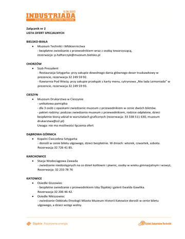 Załącznik nr 2 LISTA OFERT SPECJALNYCH BIELSKO-BIAŁA Muzeum Techniki i Włókiennictwa - bezpłatne zwiedzanie z przewodnikiem wraz z osobą towarzyszącą, rezerwacja: [email protected] CHORZÓW Szyb Prezydent - Restauracja Sztygarka: przy zakupie dowolnego dania głównego deser truskawkowy w prezencie, rezerwacja 32 249 59 92. - Kawiarnia Pod Wieżą: przy zakupie przekąski z karty menu, cytrynowa „Nie lada Lemoniada” w prezencie, rezerwacja 32 249 59 93. CIESZYN Muzeum Drukarstwa w Cieszynie - unikatowa pamiątka - dla 3 osób z opaskami zwiedzanie muzeum z przewodnikiem w cenie dwóch biletów. - pakiet rodziny: podczas zwiedzania muzeum z przewodnikiem, rodzice odpłatnie, dzieci bezpłatnie biorą udział w warsztatach graficznych (rezerwacja: 33 338 511 630, muzeum [email protected]) Uwaga: nie ma możliwości łączenia ofert DĄBROWA GÓRNICA Kopalni Ćwiczebna Sztygarka - dorośli w cenie biletu ulgowego, dzieci bezpłatnie. W dniach: wtorek, czwartek, sobota. Rezerwacja 32 726 41 85. KARCHOWICE Stacja Wodociągowa Zawada - zwiedzanie niedostępnych na co dzień kotłowni i piwnic, osoby w wieku gimnazjalnym i wzwyż, Rezerwacja: 32 233 78 76 KATOWICE Osiedle Giszowiec - bezpłatne zwiedzanie z przewodnikiem Izby Śląskiej i galerii Ewalda Gawlika. Rezerwacja 32 206 46 42. Osiedle Nikiszowiec - zwiedzanie Oddziału Etnologii Miasta Muzeum Historii Katowice dorośli w cenie biletu ulgowego, a dzieci wstęp wolny. MYSŁOWICE Centralne Muzeum Pożarnictwa - bezpłatne zwiedzanie muzeum. - dodatkowa projekcja filmu lub bajek dla dzieci. Rezerwacja [email protected], 32 222 37 33 wew. 28 - bezpłatna lekcja muzealna. Rezerwacja: [email protected], 32 222 37 33 wew. 28 PSZCZYNA Muzeum Prasy Śląskiej - bilety dla dorosłych w cenie biletów ulgowych, a dzieci do 15 roku życia wejście za darmo. RADZIONKÓW Muzeum Chleba, Szkoły i Ciekawostek - upominek Rezerwacja: 32 387 17 60 (jeśli zwiedzanie ma być razem z wypiekiem bułek) RUDY Zabytkowa Stacja Wąskotorowa - bilety w cenie 7 zł na każdy pociąg w sobotę lub niedzielę. Pociągi uruchamiane są w wypadku zebrania się minimum 10 dorosłych. TARNOWSKIE GÓRY Zabytkowa Kopalnia Srebra - pamiątka z kopalni TYCHY Browar Obywatelski - 20% rabatu w restauracji Con Amore z wyłączeniem alkoholi Tyskie Browarium - osoba towarzysząca wchodzi za darmo Rezerwacja [email protected], 32 327 84 30. Uwaga: muzeum jest dostępne tylko dla osób pełnoletnich. USTROŃ Muzeum Ustrońskie im. Jana Jarockiego - foldery tematyczne - bilet w cenie biletu ulgowego - seans filmowy ZAWIERCIE Huta Szkła Zawiercie - bezpłatne zwiedzanie dla posiadacza opaski i 3 osób towarzyszących. Rezerwacja: 32 672 16 41 wew. 253 lub 104. ŻYWIEC Muzeum Browaru Żywiec - bilety w cenie 15 zł Rezerwacja: [email protected] lub 33 861 96 27.