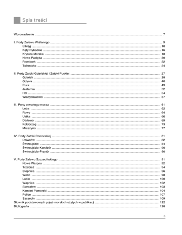 Spis treci Wprowadzenie ...................................................................................................................................................... 7 I. Porty Zalewu Wilanego .................................................................................................................................... 9 Elblg ........................................................................................................................................................ 10 Kty Rybackie ........................................................................................................................................... 16 Krynica Morska ........................................................................................................................................ 18 Nowa Paska .......................................................................................................................................... 20 Frombork .................................................................................................................................................. 22 Tolkmicko ................................................................................................................................................. 24 II. Porty Zatoki Gdaskiej i Zatoki Puckiej .......................................................................................................... Gdask ..................................................................................................................................................... Gdynia ...................................................................................................................................................... Puck ......................................................................................................................................................... Jastarnia ................................................................................................................................................... Hel ............................................................................................................................................................ Wadysawowo ......................................................................................................................................... 27 28 40 49 52 54 57 III. Porty otwartego morza .................................................................................................................................. eba ......................................................................................................................................................... Rowy ........................................................................................................................................................ Ustka ........................................................................................................................................................ Darowo .................................................................................................................................................... Koobrzeg ................................................................................................................................................. Mrzeyno .................................................................................................................................................. 61 62 64 66 69 73 77 IV. Porty Zatoki Pomorskiej ................................................................................................................................ Dziwnów ................................................................................................................................................... winoujcie .............................................................................................................................................. winoujcie-Karsibór ................................................................................................................................ winoujcie-Przytór .................................................................................................................................. 81 82 84 90 90 V. Porty Zalewu Szczeciskiego ........................................................................................................................ 91 Nowe Warpno .......................................................................................................................................... 92 Trzebie ................................................................................................................................................... 94 Stepnica ................................................................................................................................................... 96 Wolin ........................................................................................................................................................ 98 Lubin ...................................................................................................................................................... 100 Wapnica ................................................................................................................................................. 102 Sierosaw ................................................................................................................................................ 103 Kamie Pomorski ................................................................................................................................... 104 Police ..................................................................................................................................................... 107 Szczecin .......................................................................................................................