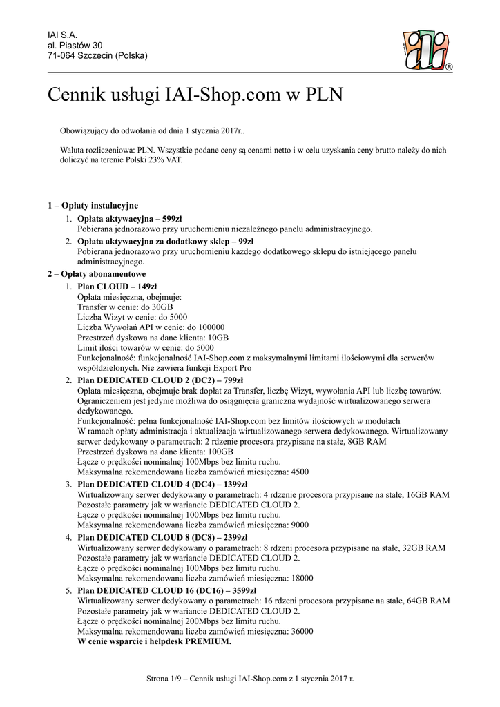 IAI S.A. al. Piastów 30 71-064 Szczecin (Polska) Cennik usługi IAI-Shop.com w PLN Obowiązujący do odwołania od dnia 1 stycznia 2017r.. Waluta rozliczeniowa: PLN. Wszystkie podane ceny są cenami netto i w celu uzyskania ceny brutto należy do nich doliczyć na terenie Polski 23% VAT. 1 – Opłaty instalacyjne 1. Opłata aktywacyjna – 599zł Pobierana jednorazowo przy uruchomieniu niezależnego panelu administracyjnego. 2. Opłata aktywacyjna za dodatkowy sklep – 99zł Pobierana jednorazowo przy uruchomieniu każdego dodatkowego sklepu do istniejącego panelu administracyjnego. 2 – Opłaty abonamentowe 1. Plan CLOUD – 149zł Opłata miesięczna, obejmuje: Transfer w cenie: do 30GB Liczba Wizyt w cenie: do 5000 Liczba Wywołań API w cenie: do 100000 Przestrzeń dyskowa na dane klienta: 10GB Limit ilości towarów w cenie: do 5000 Funkcjonalność: funkcjonalność IAI-Shop.com z maksymalnymi limitami ilościowymi dla serwerów współdzielonych. Nie zawiera funkcji Export Pro 2. Plan DEDICATED CLOUD 2 (DC2) – 799zł Opłata miesięczna, obejmuje brak dopłat za Transfer, liczbę Wizyt, wywołania API lub liczbę towarów. Ograniczeniem jest jedynie możliwa do osiągnięcia graniczna wydajność wirtualizowanego serwera dedykowanego. Funkcjonalność: pełna funkcjonalność IAI-Shop.com bez limitów ilościowych w modułach W ramach opłaty administracja i aktualizacja wirtualizowanego serwera dedykowanego. Wirtualizowany serwer dedykowany o parametrach: 2 rdzenie procesora przypisane na stałe, 8GB RAM Przestrzeń dyskowa na dane klienta: 100GB Łącze o prędkości nominalnej 100Mbps bez limitu ruchu. Maksymalna rekomendowana liczba zamówień miesięczna: 4500 3. Plan DEDICATED CLOUD 4 (DC4) – 1399zł Wirtualizowany serwer dedykowany o parametrach: 4 rdzenie procesora przypisane na stałe, 16GB RAM Pozostałe parametry jak w wariancie DEDICATED CLOUD 2. Łącze o prędkości nominalnej 100Mbps bez limitu ruchu. Maksymalna rekomendowana liczba zamówień miesięczna: 9000 4. Plan DEDICATED CLOUD 8 (DC8) – 2399zł Wirtualizowany serwer dedykowany o parametrach: 8 rdzeni procesora przypisane na stałe, 32GB RAM Pozostałe parametry jak w wariancie DEDICATED CLOUD 2. Łącze o prędkości nominalnej 100Mbps bez limitu ruchu. Maksymalna rekomendowana liczba zamówień miesięczna: 18000 5. Plan DEDICATED CLOUD 16 (DC16) – 3599zł Wirtualizowany serwer dedykowany o parametrach: 16 rdzeni procesora przypisane na stałe, 64GB RAM Pozostałe parametry jak w wariancie DEDICATED CLOUD 2. Łącze o prędkości nominalnej 200Mbps bez limitu ruchu. Maksymalna rekomendowana liczba zamówień miesięczna: 36000 W cenie wsparcie i helpdesk PREMIUM. Strona 1/9 – Cennik usługi IAI-Shop.com z 1 stycznia 2017 r. IAI S.A. al. Piastów 30 71-064 Szczecin (Polska) 6. Plan DEDICATED CLOUD 32 (DC32) – 5999zł Wirtualizowany serwer dedykowany o parametrach: 32 rdzenie procesora przypisane na stałe, 128GB RAM. Pozostałe parametry jak w wariancie DEDICATED CLOUD 2. Łącze o prędkości nominalnej 500Mbps bez limitu ruchu. Maksymalna rekomendowana liczba zamówień miesięczna: 72000 W cenie wsparcie i helpdesk PREMIUM. 7. Plan DEDICATED CLOUD 64 (DC64) – 9999zł Wirtualizowany serwer dedykowany o parametrach: 64 rdzenie procesora przypisane na stałe, 256GB RAM Pozostałe parametry jak w wariancie DEDICATED CLOUD 2. Łącze o prędkości nominalnej 500Mbps bez limitu ruchu. Maksymalna rekomendowana liczba zamówień miesięczna: 144000 W cenie wsparcie i helpdesk PREMIUM. 3 – Dopłaty i pakiety do abonamentu CLOUD ponad limit w ramach abonamentu 1. Dopłata za każdy rozpoczęty 1GB ruchu 0,50zł 2. Dopłata za każde rozpoczęte 1000 wizyt – 15,0zł Wizyty naliczane są także dla każdego zamówienia z aukcji lub Amazon. 1 zamówienie = 20 wizyt 3. Dopłata za każde rozpoczęte 10000 wywołań API ponad limit - 10zł 4. Dopłata za każde rozpoczęte 5000 dodatkowych towarów ponad limit w ramach abonamentu CLOUD – 50zł 5. Pakiet 3000 zamówień z aukcji – 400zł Pakiet dla dużych sprzedawców na marketplace. Pozwala po wykupieniu na obniżenie do 500zł dopłat w abonamencie CLOUD. Po wykupieniu pakietu, do maksymalnie 3000 zamówień z aukcji lub Amazon nie są naliczane wizyty dodatkowe, czyli nie pojawiają się za nie dopłaty. Pakiet polecany jest tym, którzy mają dużo zamówień z aukcji lub Amazon, a nie chcą wykupować abonamentu DEDICATED CLOUD. Minimalny okres korzystania z tej usługi wynosi 30 dni. Wizyty nie są naliczane od momentu wykupienia, nie wpływając na dopłaty za zamówienia naliczone wcześniej w danym okresie rozliczeniowym. Pakiet nie wpływa na inne limity. 6. Dopłata za każdy rozpoczęty 1GB danych ponad limit objętości danych – 2,50zł. 4 – Dopłaty i pakiety do abonamentu DEDICATED CLOUD ponad limit w ramach abonamentu 1. Dopłata za każdy rozpoczęty 1GB danych ponad limit objętości danych – 2,50zł. 5 – Pakiety wdrożeniowe 1. Pakiet wdrożeniowy BASIC – 1899zł Zawiera pakiet 20 roboczogodzin do wykorzystania przez 90 dni od momentu zatwierdzenia zlecenia, na pracę zespołu wdrożeniowego na przygotowanie projektu strony i kodowanie maski w oparciu o projekt sklepu w formacie PSD, importy danych i szkolenia. W przypadku dostarczeniu projektu sklepu wykonanego przez klienta, cały czas przeznaczony jest na kodowanie i w przypadku jego niewykorzystania może być zamieniony na inne prace graficzne. Do pakietu dodawane są gratis 2h na Project Management i komunikację projektową (łącznie pakiet zawiera 22 roboczogodziny). 2. Pakiet wdrożeniowy ADVANCED – 3299zł Obejmuje ten sam zakres usług co w pakiecie wdrożeniowym BASIC, ale zawiera 35 roboczogodzin zespołu wdrożeniowego, pozwalając skorzystać również z usług importu i szkolenia. Do pakietu dodawane są gratis 3,5h na Project Management i komunikację projektową (łącznie pakiet zawiera 38,5 roboczogodziny). 3. Pakiet wdrożeniowy SOPHISTICATE