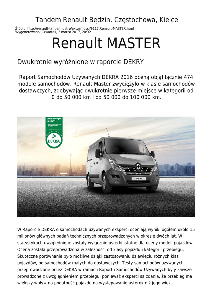 Tandem Renault Będzin, Częstochowa, Kielce Źródło: http://renault-tandem.pl/tre/aktualnosci/9117,Renault-MASTER.html Wygenerowano: Czwartek, 2 marca 2017, 20:32 Renault MASTER Dwukrotnie wyróżnione w raporcie DEKRY Raport Samochodów Używanych DEKRA 2016 oceną objął łącznie 474 modele samochodów. Renault Master zwyciężyło w klasie samochodów dostawczych, zdobywając dwukrotnie pierwsze miejsce w kategorii od 0 do 50 000 km i od 50 000 do 100 000 km. W Raporcie DEKRA o samochodach używanych eksperci oceniają wyniki ogółem około 15 milionów głównych badań technicznych przeprowadzonych w okresie dwóch lat. W statystykach uwzględnione zostały wyłącznie usterki istotne dla oceny modeli pojazdów. Ocena została przeprowadzona w zależności od klasy pojazdu i kategorii przebiegu. Skuteczne porównanie było możliwe dzięki zastosowaniu dziewięciu różnych klas pojazdów, od samochodów małych do dostawczych. Testy samochodów używanych przeprowadzane przez DEKRA w ramach Raportu Samochodów Używanych były zawsze prowadzone z uwzględnieniem przebiegu, ponieważ eksperci są zdania, że przebieg ma większy wpływ na podatność pojazdu na występowanie usterek niż jego wiek. Gama Mastera jest tworzona „na miarę” i obejmuje w Polsce ponad 150 wersji : 4 długości, 3 wysokości, 4 klasy ładowności a także wersje: furgon, furgon brygadowy, podwozie z kabiną, podwozie z podwójną kabiną, platforma z kabiną, wywrotki, kontenery, wersje z przednim i tylnym napędem, o objętości użytecznej od 8 do 22 m3. Do sukcesu Renault na rynku samochodów specjalistycznych znacznie przyczynia się także sieć PRO+, 17 wyspecjalizowanych punktów sprzedaży i serwisu, dysponujących m.in. parkiem modyfikowanych samochodów pokazowych, dopasowaną ofertą finansowania pojazdów oraz specjalnym programem obsługowym, kierowanym do przedsiębiorców. Doceń jego dynamiczną linię Pozwól się uwieść nowemu stylowi Renault MASTER. Nasi projektanci odświeżyli jego linię, aby nadać mu bardziej dynamiczny charakter. ● Odkryj jego design Skonfiguruj swój idealny samochód Skonfiguruj Renault MASTER, aby zaspokajał twoje potrzeby. Możesz wybrać spośród ponad 1000 wersji. To niewiarygodny wybór konfiguracje, które spełniają wymagania Twojej działalności. ● Wybierz wystrój wnętrza Bądź zawsze w kontakcie niezależnie od miejsca Kabina twojego Renault MASTER dla Twojej wygody zamienia się w prawdziwe biuro. Można w niej pogodzić w pracy przenośny komputer, tablet i smartfon. ● Bądź zawsze w kontakcie ze światem Podróżuj spokojnie Elektroniczny system kontroli toru jazdy ESC najnowszej generacji z funkcją Extended Grip zapewnia ci optymalną przyczepność oraz kontrolę ładunku... Renault MASTER został wyposażony w rozwiązania gwarantujące twoje bezpieczeństwo. ● Jedź bezpiecznie.