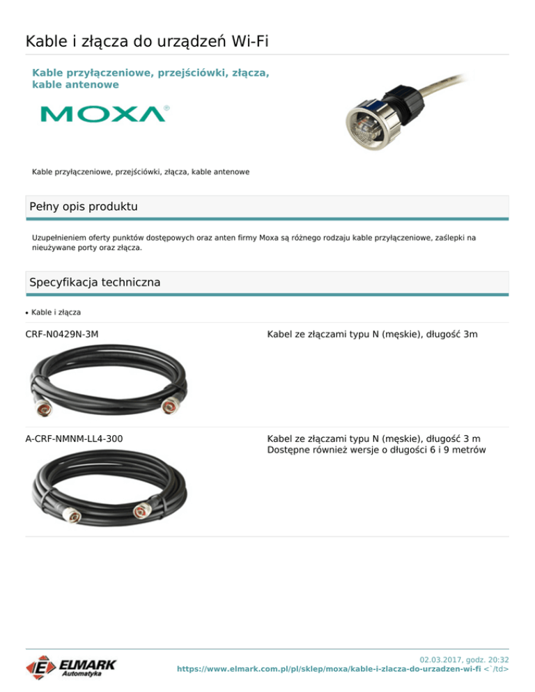 Kable i złącza do urządzeń Wi-Fi Kable przyłączeniowe, przejściówki, złącza, kable antenowe Kable przyłączeniowe, przejściówki, złącza, kable antenowe Pełny opis produktu Uzupełnieniem oferty punktów dostępowych oraz anten firmy Moxa są różnego rodzaju kable przyłączeniowe, zaślepki na nieużywane porty oraz złącza. Specyfikacja techniczna ● Kable i złącza CRF-N0429N-3M Kabel ze złączami typu N (męskie), długość 3m A-CRF-NMNM-LL4-300 Kabel ze złączami typu N (męskie), długość 3 m Dostępne również wersje o długości 6 i 9 metrów 02.03.2017, godz. 20:32 https://www.elmark.com.pl/pl/sklep/moxa/kable-i-zlacza-do-urzadzen-wi-fi <`/td> A-CRF-RMNM-L1-300 Kabel ze złączami N (męskie) oraz RP-SMA (męskie) Dostępne również wersje o długości 6 i 9 metrów CRF-N0117SA-3M Kabel typu CFD200 ze złączami N (męskie) oraz RP-SMA (męskie), długość 3 m CRF-SMA(M)/N(M)-300 Kabel typu CFD200 ze złączami N (męskie) oraz SMA (męskie), długość 3 m A-CRF-RFRM-S1-060 Kabel ze złączami RP-SMA (męskie) oraz RP-SMA (żeńskie), długość 0.6 m 02.03.2017, godz. 20:32 https://www.elmark.com.pl/pl/sklep/moxa/kable-i-zlacza-do-urzadzen-wi-fi <`/td> A-PLG-WPRJ Wtyczka RJ45 (wodoodporna) Do AWK-4121 oraz AWK-6222 A-CAP-WPRJ45-MC Zaślepka na port RJ45 (zakrecany) Do modeli AWK-4121 oraz AWK-6222 M12A-5P-IP68 Wtyczka M12 (5-pin, żeńska, A-codec) M12A-8PMM-IP68 Wtyczka M12 (A, 8-pin, męska) Pasuje do AWK-4121 oraz AWK-6222 02.03.2017, godz. 20:32 https://www.elmark.com.pl/pl/sklep/moxa/kable-i-zlacza-do-urzadzen-wi-fi <`/td> A-CAP-N-M Zaślepka na złącze antenowe typu N Pasuje do AWK-4121 oraz AWK-6222 A-CAP-M12F-M Zaślepka na złącze M12 (żeńskie) Pasuje do AWK-4121 AWK-6222 TN-5516-8PoE TN-5516 TN-5508 TN-5305 TN-5308 TN-5510 TN-5508-4PoE TN-5308-4poE A-CAP-M12M-M Zaślepka na złącze M12 (męskie) Pasuje do AWK-4121 AWK-6222 TN-5516-8PoE TN-5516 TN-5508 TN-5305 TN-5308 TN-5510 TN-5508-4PoE TN-5308-4poE A-TRM-50-NM Terminator (rezystor) 50 Ohm, N(male) Pasuje do AWK-4121 oraz AWK-6222 02.03.2017, godz. 20:32 https://www.elmark.com.pl/pl/sklep/moxa/kable-i-zlacza-do-urzadzen-wi-fi <`/td> A-TRM-50-RM Terminator (rezystor) 50 Ohm, RP-SMA (male) Pasuje do AWK-3121 oraz AWK-5222 A-SA-NMNF-01 Ogranicznik przepięć Złącza N-męski i N-żeńskie, Pasuje do: AWK-3121 AWK-4121 AWK-5222 AWK-6222 Modele Symbol Opis A-CRF-NMNM-LL4-300 Kabel ze złączami N-type (męskie) - N-type (męskie), długość 3m A-CRF-NMNM-LL4-600 Kabel ze złączami N-type (męskie) - N-type (męskie), długość 6m A-CRF-NMNM-LL4-900 Kabel ze złączami N-type (męskie) - N-type (męskie), długość 9m CRF-N0117SA-3M N Male toRP SMA Male CONN Kabel, złącza N-type (męskie) - RP-SMA (męskie), długość 3m CRF-N0429N-3M N Male to N Male CONN Kabel, złącza N (męskie) - N (męskie), długość 3m A-CAP-WPRJ45-MC Zaślepka M na port RJ45 A-CAP-N-M Zaślepka na złącze antenowe typu N M12A-5P-IP68 LTW12-05BFFA-SL8001 Wtyczka M12 (5-pin, żeńska, A-codec), IP68 A-CRF-RMNM-L1-300 Kabel LMR-195 ze złączami N (męskie) oraz RP-SMA (męskie), długość 3 m A-CRF-RMNM-L1-600 Kabel LMR-195 ze złączami N (męskie) oraz RP-SMA (męskie), długość 6 m A-CRF-RMNM-L1-900 Kabel LMR-195 ze złączami N (męskie) oraz RP-SMA (męskie), długość 9 m 02.03.2017, godz. 20:32 https://www.elmark.com.pl/pl/sklep/moxa/kable-i-zlacza-do-urzadzen-wi-fi <`/td> Symbol Opis A-TRM-50-NM Terminator (rezystor) 50 Ohm, N(male) A-TRM-50-RM Terminator (rezystor) 50 Ohm, RP-SMA (male) A-SA-NMNF-01 Ogranicznik przepięcia, 0 - 6 GHz, złącza N (męskie) oraz N (żeńskie) A-CAP-M12M-M Zaślepka na port M12 (męski) A-CAP-M12F-M Zaślepka na port M12 (żeński) A-CRF-QMAMNM-R2-50 Kabel antenowy 50 cm, złącza QMA (męskie) i N-type (męskie) A-CRF-QMAMSF-R2-50 Kabel antenowy 50 cm, złącza QMA (męskie) i SMA (żeńskie) A-CRF-RFRM-S1-060 Kabel ze złączami RP-SMA (męskie) - RP-SMA (żeńskie), długość 60 cm 02.03.2017, godz. 20:32 https://www.elmark.com.pl/pl/sklep/moxa/kable-i-zlacza-do-urzadzen-wi-fi <`/td>