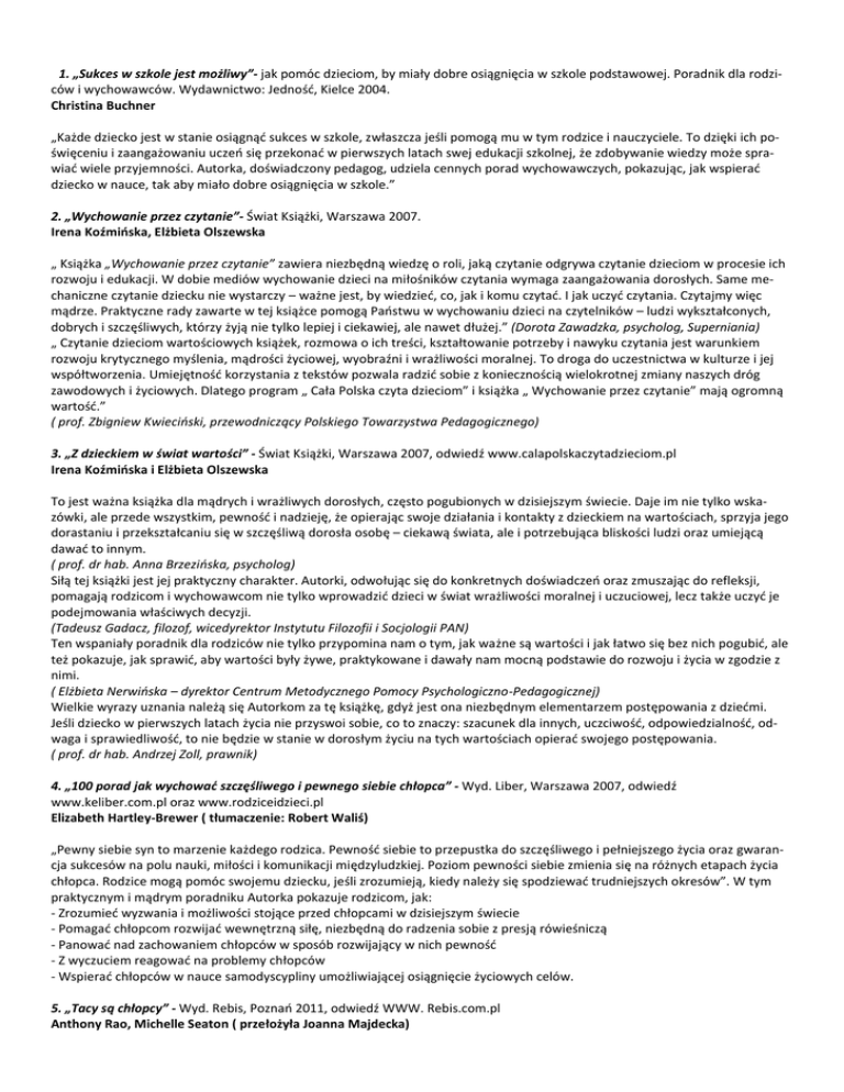 1. „Sukces w szkole jest możliwy”- jak pomóc dzieciom, by miały dobre osiągnięcia w szkole podstawowej. Poradnik dla rodziców i wychowawców. Wydawnictwo: Jedność, Kielce 2004. Christina Buchner „Każde dziecko jest w stanie osiągnąć sukces w szkole, zwłaszcza jeśli pomogą mu w tym rodzice i nauczyciele. To dzięki ich poświęceniu i zaangażowaniu uczeń się przekonać w pierwszych latach swej edukacji szkolnej, że zdobywanie wiedzy może sprawiać wiele przyjemności. Autorka, doświadczony pedagog, udziela cennych porad wychowawczych, pokazując, jak wspierać dziecko w nauce, tak aby miało dobre osiągnięcia w szkole.” 2. „Wychowanie przez czytanie”- Świat Książki, Warszawa 2007. Irena Koźmińska, Elżbieta Olszewska „ Książka „Wychowanie przez czytanie” zawiera niezbędną wiedzę o roli, jaką czytanie odgrywa czytanie dzieciom w procesie ich rozwoju i edukacji. W dobie mediów wychowanie dzieci na miłośników czytania wymaga zaangażowania dorosłych. Same mechaniczne czytanie dziecku nie wystarczy – ważne jest, by wiedzieć, co, jak i komu czytać. I jak uczyć czytania. Czytajmy więc mądrze. Praktyczne rady zawarte w tej książce pomogą Państwu w wychowaniu dzieci na czytelników – ludzi wykształconych, dobrych i szczęśliwych, którzy żyją nie tylko lepiej i ciekawiej, ale nawet dłużej.” (Dorota Zawadzka, psycholog, Superniania) „ Czytanie dzieciom wartościowych książek, rozmowa o ich treści, kształtowanie potrzeby i nawyku czytania jest warunkiem rozwoju krytycznego myślenia, mądrości życiowej, wyobraźni i wrażliwości moralnej. To droga do uczestnictwa w kulturze i jej współtworzenia. Umiejętność korzystania z tekstów pozwala radzić sobie z koniecznością wielokrotnej zmiany naszych dróg zawodowych i życiowych. Dlatego program „ Cała Polska czyta dzieciom” i książka „ Wychowanie przez czytanie” mają ogromną wartość.” ( prof. Zbigniew Kwieciński, przewodniczący Polskiego Towarzystwa Pedagogicznego) 3. „Z dzieckiem w świat wartości” - Świat Książki, Warszawa 2007, odwiedź www.calapolskaczytadzieciom.pl Irena Koźmińska i Elżbieta Olszewska To jest ważna książka dla mądrych i wrażliwych dorosłych, często pogubionych w dzisiejszym świecie. Daje im nie tylko wskazówki, ale przede wszystkim, pewność i nadzieję, że opierając swoje działania i kontakty z dzieckiem na wartościach, sprzyja jego dorastaniu i przekształcaniu się w szczęśliwą dorosła osobę – ciekawą świata, ale i potrzebująca bliskości ludzi oraz umiejącą dawać to innym. ( prof. dr hab. Anna Brzezińska, psycholog) Siłą tej książki jest jej praktyczny charakter. Autorki, odwołując się do konkretnych doświadczeń oraz zmuszając do refleksji, pomagają rodzicom i wychowawcom nie tylko wprowadzić dzieci w świat wrażliwości moralnej i uczuciowej, lecz także uczyć je podejmowania właściwych decyzji. (Tadeusz Gadacz, filozof, wicedyrektor Instytutu Filozofii i Socjologii PAN) Ten wspaniały poradnik dla rodziców nie tylko przypomina nam o tym, jak ważne są wartości i jak łatwo się bez nich pogubić, ale też pokazuje, jak sprawić, aby wartości były żywe, praktykowane i dawały nam mocną podstawie do rozwoju i życia w zgodzie z nimi. ( Elżbieta Nerwińska – dyrektor Centrum Metodycznego Pomocy Psychologiczno-Pedagogicznej) Wielkie wyrazy uznania należą się Autorkom za tę książkę, gdyż jest ona niezbędnym elementarzem postępowania z dziećmi. Jeśli dziecko w pierwszych latach życia nie przyswoi sobie, co to znaczy: szacunek dla innych, uczciwość, odpowiedzialność, odwaga i sprawiedliwość, to nie będzie w stanie w dorosłym życiu na tych wartościach opierać swojego postępowania. ( prof. dr hab. Andrzej Zoll, prawnik) 4. „100 porad jak wychować szczęśliwego i pewnego siebie chłopca” - Wyd. Liber, Warszawa 2007, odwiedź www.keliber.com.pl oraz www.rodziceidzieci.pl Elizabeth Hartley-Brewer ( tłumaczenie: Robert Waliś) „Pewny siebie syn to marzenie każdego rodzica. Pewność siebie to przepustka do szczęśliwego i pełniejszego życia oraz gwarancja sukcesów na polu nauki, miłości i komunikacji międzyludzkiej. Poziom pewności siebie zmienia się na różnych etapach życia chłopca. Rodzice mogą pomóc swojemu dziecku, jeśli zrozumieją, kiedy należy się spodziewać trudniejszych okresów”. W tym praktycznym i mądrym poradniku Autorka pokazuje rodzicom, jak: - Zrozumieć wyzwania i możliwości stojące przed chłopcami w dzisiejszym świecie - Pomagać chłopcom rozwijać wewnętrzną siłę, niezbędną do radzenia sobie z presją rówieśniczą - Panować nad zachowaniem chłopców w sposób rozwijający w nich pewność - Z wyczuciem reagować na problemy chłopców - Wspierać chłopców w nauce samodyscypliny umożliwiającej osiągnięcie życiowych celów. 5. „Tacy są chłopcy” - Wyd. Rebis, Poznań 2011, odwiedź WWW. Rebis.com.pl Anthony Rao, Michelle Seaton ( przełożyła Joanna Majdecka) „W dzisiejszych czasach presja na odnoszenie sukcesów dosięga już nie tylko dorosłych, lecz także dzieci. Mali chłopcy nierzadko przeżywają trudności: mają kłopoty z nauką lub zachowaniem. Są częstymi gośćmi w poradniach i kandydatami do terapii zaburzeń rozwoju. Doktor A. Rao napisał wspaniały poradnik mówiący o tym, jak przebiega rozwój chłopców, czego można się spodziewać i jak sobie radzić z problemami: brakiem koncentracji, nadpobudliwością, lękliwością czy agresją. To świetna lektura dla rodziców obawiających się o swoich małych urwisów, a także nauczycieli, pedagogów i psychologów dziecięcych – pomaga przejść przez ciężkie etapy i z ufnością patrzeć w przyszłość. Mądra i wiarygodna książka. Przywraca wiarę w to, że chłopcy mimo wzlotów i upadków rozwijają się prawidłowo. Z pewnością pomoże wszystkim rodzicom, których synowie pr