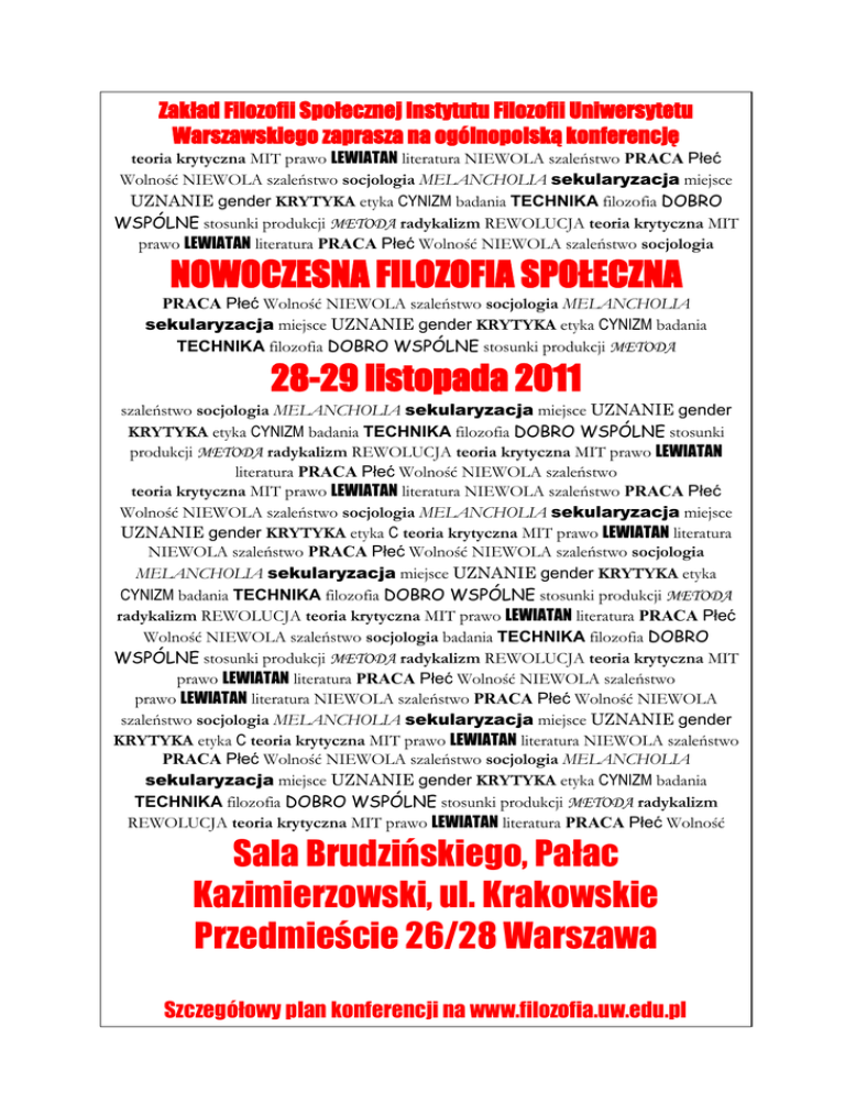 PRACA Płeć Wolność NIEWOLA szaleństwo socjologia MELANCHOLIA Zakład Filozofii Społecznej Instytutu Filozofii Uniwersytetu sekularyzacja miejsce UZNANIE gender KRYTYKA etyka CYNIZM badania Warszawskiego na ogólnopolską TECHNIKA filozofia DOBROzaprasza WSPÓLNE stosunki produkcjikonferencję METODA radykalizm teoria krytyczna MIT prawo LEWIATAN literatura NIEWOLA szaleństwo PRACA Płeć REWOLUCJA teoria krytyczna MIT prawo LEWIATAN literatura PRACA Płeć Wolność Wolność NIEWOLA szaleństwo MELANCHOLIA socjologia MELANCHOLIA sekularyzacja miejsce NIEWOLA szaleństwo socjologia sekularyzacja miejsce UZNANIE UZNANIE gender KRYTYKA CYNIZM badania TECHNIKA filozofia WSPÓLNE DOBRO gender KRYTYKA etyka CYNIZM etyka badania TECHNIKA filozofia DOBRO WSPÓLNE stosunki produkcjiradykalizm METODA radykalizm REWOLUCJA teoria krytyczna MIT stosunki produkcji METODA REWOLUCJA teoria krytyczna MIT prawo prawo LEWIATAN Wolność NIEWOLA NIEWOLA szaleństwo socjologia LEWIATAN literatura literatura PRACAPRACA Płeć Płeć Wolność szaleństwo socjologia MELANCHOLIA sekularyzacja miejsce UZNANIE gender KRYTYKA etyka CYNIZM badania TECHNIKA filozofia DOBRO WSPÓLNE stosunki produkcji METODA radykalizm PRACA Płeć krytyczna Wolność NIEWOLA szaleństwo socjologia REWOLUCJA teoria MIT prawo LEWIATAN literaturaMELANCHOLIA PRACA Płeć Wolność sekularyzacja miejsce UZNANIE gender KRYTYKA etyka NIEWOLA szaleństwo socjologia MELANCHOLIA sekularyzacjaCYNIZM miejsce badania UZNANIE TECHNIKA filozofia DOBRO WSPÓLNE stosunki produkcji METODA gender KRYTYKA etyka CYNIZM badania TECHNIKA filozofia DOBRO WSPÓLNE stosunki produkcji METODA radykalizm REWOLUCJA teoria krytyczna MIT prawo LEWIATAN literatura PRACA Płeć Wolność NIEWOLA szaleństwo socjologia szaleństwo socjologia MELANCHOLIA sekularyzacja miejsce UZNANIE MELANCHOLIA sekularyzacja miejsce UZNANIE gender KRYTYKA etykagender CYNIZM KRYTYKA etyka filozofia CYNIZM DOBRO badania TECHNIKA stosunki badania TECHNIKA WSPÓLNEfilozofia stosunkiDOBRO produkcjiWSPÓLNE METODA radykalizm produkcji METODA radykalizmMIT REWOLUCJA teoria krytyczna prawo LEWIATAN REWOLUCJA teoria krytyczna prawo LEWIATAN literatura MIT NIEWOLA szaleństwo literatura PRACA Płeć Wolność NIEWOLA szaleństwo PRACA Płeć Wolność NIEWOLA szaleństwo socjologia MELANCHOLIA teoria krytycznamiejsce MIT prawo LEWIATAN literatura szaleństwo PRACA Płeć sekularyzacja UZNANIE gender NIEWOLA KRYTYKA etyka CYNIZM badania Wolność NIEWOLA szaleństwo socjologia MELANCHOLIA sekularyzacja miejsce TECHNIKA filozofia DOBRO WSPÓLNE stosunki produkcji METODA radykalizm UZNANIE gender KRYTYKAMIT etykaprawo C teoria krytyczna MIT prawo LEWIATAN REWOLUCJA teoria krytyczna LEWIATAN literatura PRACA Płećliteratura Wolność NIEWOLA szaleństwo PRACA Płeć Wolność NIEWOLA szaleństwo socjologia NIEWOLA szaleństwo socjologia MELANCHOLIA sekularyzacja miejsce UZNANIE MELANCHOLIA sekularyzacja miejsce UZNANIE gender KRYTYKA etyka gender KRYTYKA etyka CYNIZM badania TECHNIKA filozofia DOBRO WSPÓLNE CYNIZMprodukcji badania TECHNIKA filozofia DOBRO WSPÓLNE stosunki produkcjiMIT METODA stosunki METODA radykalizm REWOLUCJA teoria krytyczna prawo radykalizm REWOLUCJA teoria krytyczna MIT prawo LEWIATAN literatura PRACA Płeć LEWIATAN literatura PRACA Płeć Wolność NIEWOLA szaleństwo socjologia Wolność NIEWOLA szaleństwo socjologia badania TECHNIKA filozofia DOBRO MELANCHOLIA sekularyzacja miejsce UZNANIE gender KRYTYKA etyka CYNIZM WSPÓLNE stosunki produkcji METODA radykalizm REWOLUCJA teoria krytyczna MIT badania TECHNIKA filozofia DOBRO WSPÓLNE stosunki produkcji METODA radykalizm prawoteoria LEWIATAN literatura PRACA Wolność NIEWOLA szaleństwo REWOLUCJA krytyczna MIT prawoPłeć LEWIATAN literatura PRACA Płeć Wolność prawo LEWIATAN literatura NIEWOLA szaleństwo PRACA Płeć Wolność NIEWOLA NIEWOLA szaleństwo socjologia MELANCHOLIA sekularyzacja miejsce UZNANIE szaleństwo socjologia MELANCHOLIA miejsceDOBRO UZNANIE gender gender KRYTYKA etyka CYNIZM badaniasekularyzacja TECHNIKA filozofia WSPÓLNE KRYTYKA etyka CMETODA teoria krytyczna MIT prawo LEWIATAN literatura NIEWOLAMIT szaleństwo stosunki produkcji radykalizm REWOLUCJA teoria krytyczna prawo PRACA Płeć Wolność NIEWOLA szaleństwo socjologia MELANCHOLIA LEWIATAN literatura PRACA Płeć Wolność NIEWOLA szaleństwo socjologia sekularyzacja miejsce UZNANIE gender KRYTYKA CYNIZMetyka badania MELANCHOLIA sekularyzacja miejsce UZNANIE gender etyka KRYTYKA CYNIZM TECHNIKA filozofia DOBRO WSPÓLNE stosunki produkcji METODA radykalizm REWOLUCJAFILOZOFIA teoria krytyczna MIT prawo LEWIATAN literatura PRACA Płeć Wolność NOWOCZESNA SPOŁECZNA NOWOCZESNA FILOZOFIA SPOŁECZNA 28-29 listopada 2011 Sala Brudzińskiego, Pałac I dzień, 28. 11. 2011 Kazimierzowski, ul. Krakowskie 10.00 – prof. Aleksander Ochocki, otwarcie konferencji, referat wprowadzający Przedmieście 26/28 Warszawa NOWOCZESNA FILOZOFIA SPOŁECZNA NOWOCZESNA FILOZOFIA SPOŁECZNA Szczegółowy plan konferencji na www.filozofia.uw.edu.pl NOWOCZESNA FILOZOFIA SPOŁECZNA I dzień, 28. 11. 2011 10.00 – prof. Aleksander Ochocki, otwarcie konferencji, referat wprowadzający 10.20 – I sesja, poprowadzi: prof. Jerzy Kochan, referat otwierający: Nie ma wolności. Nie ma nawet niewoli 10.40 – Maciej Kassner, Krytyka systemu pracy najemnej w poglądach Johna Deweya i Bertranda Russella 11.00 – dyskusja 11.40 – przerwa kawowa 12.00 – Krzysztof Król, Praca poza miejscem pracy 12.20 – Maciej Kostyra, Cynizm w procesie nowoczesnego uspołecznienia 12.40 – Piotr Rosół, Hansa Jonasa krytyka technicznej utopii 13.00 – dyskusja 13.40 – 15.00 – przerwa 15.00 – II sesja, poprowadzi: prof. Andrzej Kaniowski, referat otwierający: Jürgen Habermas o konstytucji europejskiej 15.20 – Wiktor Marzec, Filozofia tego, co polityczne E. Laclau’ a, a empiryczne badania społeczne 15. 40 - Rafał Ilnicki, Kultura jako podsystem techniki 16