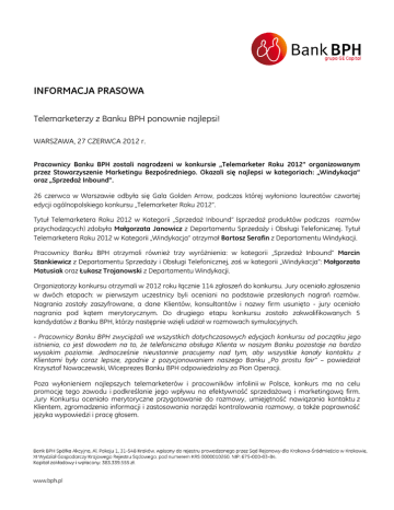 INFORMACJA PRASOWA Telemarketerzy z Banku BPH ponownie najlepsi! WARSZAWA, 27 CZERWCA 2012 r. Pracownicy Banku BPH zostali nagrodzeni w konkursie „Telemarketer Roku 2012” organizowanym przez Stowarzyszenie Marketingu Bezpośredniego. Okazali się najlepsi w kategoriach: „Windykacja” oraz „Sprzedaż Inbound”. 26 czerwca w Warszawie odbyła się Gala Golden Arrow, podczas której wyłoniono laureatów czwartej edycji ogólnopolskiego konkursu „Telemarketer Roku 2012”. Tytuł Telemarketera Roku 2012 w Kategorii „Sprzedaż Inbound” (sprzedaż produktów podczas rozmów przychodzących) zdobyła Małgorzata Janowicz z Departamentu Sprzedaży i Obsługi Telefonicznej. Tytuł Telemarketera Roku 2012 w Kategorii „Windykacja” otrzymał Bartosz Serafin z Departamentu Windykacji. Pracownicy Banku BPH otrzymali również trzy wyróżnienia: w kategorii „Sprzedaż Inbound” Marcin Stankiewicz z Departamentu Sprzedaży i Obsługi Telefonicznej, zaś w kategorii „Windykacja”: Małgorzata Matusiak oraz Łukasz Trojanowski z Departamentu Windykacji. Organizatorzy konkursu otrzymali w 2012 roku łącznie 114 zgłoszeń do konkursu. Jury oceniało zgłoszenia w dwóch etapach: w pierwszym uczestnicy byli oceniani na podstawie przesłanych nagrań rozmów. Nagrania zostały zaszyfrowane, a dane Klientów, konsultantów i nazwy firm usunięto - jury oceniało nagrania pod kątem merytorycznym. Do drugiego etapu konkursu zostało zakwalifikowanych 5 kandydatów z Banku BPH, którzy następnie wzięli udział w rozmowach symulacyjnych. - Pracownicy Banku BPH zwyciężali we wszystkich dotychczasowych edycjach konkursu od początku jego istnienia, co jest dowodem na to, że telefoniczna obsługa Klienta w naszym Banku pozostaje na bardzo wysokim poziomie. Jednocześnie nieustannie pracujemy nad tym, aby wszystkie kanały kontaktu z Klientami były coraz lepsze, zgodnie z pozycjonowaniem naszego Banku „Po prostu fair” – powiedział Krzysztof Nowaczewski, Wiceprezes Banku BPH odpowiedzialny za Pion Operacji. Poza wyłonieniem najlepszych telemarketerów i pracowników infolinii w Polsce, konkurs ma na celu promocję tego zawodu i podkreślanie jego wpływu na efektywność sprzedażową i marketingową firm. Jury Konkursu oceniało merytoryczne przygotowanie do rozmowy, umiejętność nawiązania kontaktu z Klientem, zgromadzenia informacji i zastosowania narzędzi kontrolowania rozmowy, a także poprawność języka wypowiedzi i pracę głosem. *** Bank BPH oferuje swoje produkty i usługi Klientom indywidualnym, małym i średnim przedsiębiorstwom oraz Klientom korporacyjnym. Bogata oferta Banku zawiera m.in.: kredyty, w tym gotówkowe i hipoteczne, konta osobiste, rachunki oszczędnościowe i depozytowe oraz karty kredytowe. Bank BPH prowadzi również działalność w zakresie zintegrowanych usług maklerskich, bankowości skarbowej oraz zarządzania aktywami poprzez spółkę zależną BPH TFI. Klienci Banku mogą korzystać z sieci blisko 300 oddziałów własnych, a także placówek partnerskich i agencji uniwersalnych, jak również z nowoczesnej bankowości internetowej oraz telefonicznej. Bank BPH jest obecny na polskim rynku od ponad 20 lat. Jest spółką publiczną notowaną na Giełdzie Papierów Wartościowych w Warszawie i wchodzi w skład indeksu Respect. Siedzibą prawną Banku BPH jest Kraków, biuro centrali znajduje się w Warszawie, a główne centra operacyjne w Gdańsku i Krakowie. Bank BPH wchodzi w skład grupy kapitałowej GE, jednej z największych korporacji na świecie. Karolina Tomczyk, Specjalista ds. Public Relations Departament Public Relations Bank BPH e-mail: [email protected] Telefon: +48 22 531 84 80