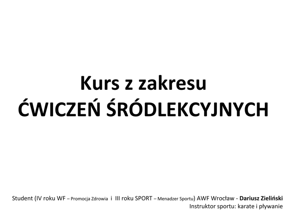 Kurs z zakresu ĆWICZEŃ ŚRÓDLEKCYJNYCH Student (IV roku WF – Promocja Zdrowia i III roku SPORT – Menadzer Sportu) AWF Wrocław - Dariusz Zieliński Instruktor sportu: karate i pływanie O czym będziemy rozmawiać ?? 1. Cel kursu. (Wprowadzenie) 2. Cele ćwiczeń śródlekcyjnych. 3. Efekty stosowania ćwiczeń śródlekcyjnych. 4. Organizacja ćwiczeń śródlekcyjnych. 5. Tok ćwiczeń śródlekcyjnych. 6. Ćwiczenia praktyczne. Kryteria zaliczenia 1. AKTYWNOŚĆ podczas części teoretycznej i praktycznej. 2. Przygotowanie i przedstawienie zestawu ćwiczeń śródlekcyjnych. 3. Zaliczenie testu końcowego. Osoby niezaangażowane lub utrudniające prowadzenie kursu zostaną wyproszone. Cele kursu Zdobycie wiedzy i umiejętności, niezbędnych w (prawidłowym) prowadzeniu ćwiczeń śródlekcyjnych. Zdobycie uprawnień: "SZKOLNEGO ANIMATORA ĆWICZEŃ ŚRÓDLEKCYJNYCH" – które będą uprawniać do prowadzenia tych ćwiczeń w klasie. Czym są ćwiczenia śródlekcyjne? Cele ćwiczeń śródlekcyjnych ???? Głównym celem ćwiczeń śródlekcyjnych jest: osiągnięcie stanu psychicznego i fizycznego odprężenia, a nie rozwijanie sprawności motorycznej. Funkcje ćwiczeń śródlekcyjnych funkcja relaksacyjna, która polega na przeciwdziałaniu negatywnym skutkom znużenia i zmęczenia gromadzonego w ciągu dnia pracy, poprzez odwrócenie uwagi od zagadnień związanych z lekcją następuje odprężenie nerwowo – psychiczne organizmu; funkcja stymulacyjna, której istota polega na ożywieniu czynności wegetatywnych organizmu, pobudzeniu czynności układów oddychania i krążenia, analizatorów wzroku i słuchu; funkcja korekcyjna, która polega na korygowaniu postawy ciała poprzez przyjmowanie prawidłowej sylwetki; funkcja dydaktyczna Wskazania organizacyjno – metodyczne 1. Ćwiczenia śródlekcyjne można organizować na każdej lekcji w momencie, kiedy zauważy się pierwsze objawy zmęczenia i znużenia. (Nauczyciel o tym decyduje) 2. Czas trwania przerwy przeznaczonej na przeprowadzenie ćwiczeń wynosi 2 – 3 minuty. 3. Ćwiczenia śródlekcyjne przeprowadza się zawsze przy otwartych oknach, a w pomieszczeniach o zanieczyszczonej podłodze należy unikać biegów, skoków oraz innego rodzaju ćwiczeń, które sprzyjałyby powstawaniu kurzu i wdychaniu go w czasie i po ćwiczeniach. 4. Niewielka ilość wolnego miejsca w klasie w znacznym stopniu ogranicza rozmach i dynamikę ruchów, dlatego zestawy ćwiczeń powinny być proste i łatwe do wykonania nawet na niewielkiej przestrzeni. 5. Biorąc pod uwagę że ćwiczenia odbywają się w klasie nie na sali gimnastycznej należy wykorzystać dostępne przybory lekcyjne / szkolne. Wskazania organizacyjno – metodyczne c.d 6. Biorąc pod uwagę relaksacyjną funkcję przerw śródlekcyjnych należy dobierać ćwiczenia atrakcyjne, proste i znane, aby nie obciążać nadmiernie układu nerwowego na lekcji. Dążyć w czasie wykonywania ćwiczeń do wytworzenia atmosfery radości, pogody i swobody ruchu. 7. Przy opracowywaniu zestawów ćwiczeń śródlekcyjnych, oprócz uwzględniania specyficznych warunków pomieszczenia klasowego, należy brać pod uwagę treści programowe (wychowania fizycznego). 8. Wśród ćwiczeń śródlekcyjnych powinny znaleźć się takie ćwiczenia, których wykonanie powoduje pracę mięśni szczególnie odpowiedzialnych za przyjmowanie prawidłowej postawy ciała podczas stania, czy siedzenia. 9. Radzi się wprowadzenie metody ścisłej łącząc ją w dalszym ciągu ze wspólną zabawą, która dostarczy wiele emocji i uśmiechu na twarzy. 10. Muzyka jako element wyjątkowo atrakcyjny i odprężający psychicznie powinna być wprowadzana w czasie ćwiczeń śródlekcyjnych w każdej formie, wzbogaca ona przerwę śródlekcyjną, poprzez wytworzenie odpowiedniego nastroju oraz rozładowuje napięcia emocjonalne. Tok ćwiczeń śródlekcyjnych ćwiczenia szyi (skłony głowy w przód, w tył i w bok, skręty i krążenia), ćwiczenia ramion (skurcze poziome i pionowe ramion, wymachy, rzuty, wyprosty, wznosy, krążenia jedno i oburącz), ćwiczenia tułowia (skłony tułowia w przód i w tył, skłony tułowia w bok, skręty tułowia), ćwiczenia nóg (chód, biegi, podskoki jednonóż i obunóż, wymachy nóg, zeskoki, przechodzenie nad przeszkodami, ćwiczenia stóp), ćwiczenia oddechowe (ćwiczenia z głębokimi wdechami i wydechami, wdech nosem i wydech ustami). Ćwiczenia praktyczne W grupach opracuj zestaw ćwiczeń śródlekcyjnych, spełniający wszystkie wytyczne i będący zgodny z tokiem ćwiczeń śródlekcyjnych. ćwiczenia ramion ćwiczenia tułowia ćwiczenia szyi ćwiczenia nóg ćwiczenia oddechowe PREZENTACJE Dziękuje i Źródła Teksy: www.lider.pl www.edukacja.edux.pl J. Bielski: „Życie jest ruchem” R. Demetr: „Wesołe ćwiczenia” Obrazy: www.kwejk.pl www.deviantart.com
