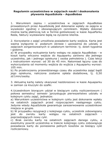 Regulamin uczestnictwa w zajęciach nauki i doskonalenia pływania AquaSzkoła - AquaBobas 1. Warunkiem zapisu i uczestnictwa w zajęciach AquaBobas prowadzonych przez AquaSzkołę jest dokonanie wpłaty za zajęcia w wysokości zgodnej z obowiązującym cennikiem. Wpłaty dokonać można kartą płatniczą lub w formie gotówkowej w kasie AquaParku Reda, faktury wystawiane będą na życzenie klienta. 2. Korzystanie z zajęć umożliwia posiadanie karty wejścia. Karta jest ważna wyłącznie w podanym okresie i upoważnia do udziału w zajęciach zorganiozwanych w ustalonym terminie: tj. dzień tygodnia i godzina. a) W przypadku wykupienia karty wstępu na zajęcia AquaBobas - w koszt karty wliczono wejście do Aquaparku zarówno dla jednego uczestnika, jak i jednego opiekuna ( osoba pełnoletnia ). Czas lekcji z instruktorem wynosi: od 30 do 45 min. Natomiast łączny czas do wykorzystania od momentu wejścia do wyjścia z Aquaparku wynosi: 105 min. b) Po przekroczeniu przewidzianego czasu dla uczestnika zajęć bądź jego opiekuna, naliczona zostanie opłata dodatkowa, tj. 0,50 zł/1min/osoby. 3. Aktualną kartę należy okazywać każdorazowo w kasie Aquaparku w zamian za kluczyki do szafki. 4.Uczestnikom biorącym udział w bieżącym cyklu rozliczeniowym ( połowa semestru/ semestr )przysługuje pierwszeństwo udziału w kolejnym cyklu zajęć, jednakże: a) Warunkiem uczestnictwa w kolejnym cyklu jest dokonanie wpłaty na ostatnich zajęciach przed rozpoczęciem następnego cyklu. Jedynie wtedy AquaSzkoła gwarantuje zarezerwowanie uczestnikowi miejsca w grupie. b) W przypadku rezygnacji z kolejnego cyklu, uczestnik zobowiązany jest do zwrotu karty wstępu na ostatnich zajęciach poprzedzających nowy cykl. c) Brak zwrotu karty na ostatnich zajęciach danego cyklu, a ewentulny powrót uczestnika w trakcie kolejnego cyklu zobowiązuje posiadacza karty do poniesienia pełnych kosztów za bieżący cykl rozliczeniowy. 5. Za niewykorzystane i opuszczone zajęcia grupowe, nie przewiduje się zwrotu gotówki. Niedopuszczalne jest także przekazanie karty innemu uczestnikowi niż wskazana osoba – uczestnik zajęć. a) AquaSzkoła nie przewiduje możliwości odrabiania i przenoszenia na inny termin opuszczonych zajęć przez uczestnika. b) W przypadku braku możliwości stawienia się uczestnika na zajęciach dopuszczalne jest wykorzystanie opuszczonych zajęć w formie wejścia na teren Aquaparku - przez uczestnika i jego piekuna każdorazowo na 105 min w wybranych dniach - z wyłączeniem weekendów i świąt w godzinach 9 - 21:00 w terminie ważności karty AquaBobas. 6. Zajęcia odbywają się raz w tygodniu. 7. Zajęcia odbywają się na basenie pływackim, głębokość 90cm – 135cm. 8. Zajęcia obywają się w grupach do 10 osób. 9. Rodzic/opiekun uczestnika zajęć AquaBobas zobowiązany jest aktywnie uczestniczyć w zajęciach wraz z podopiecznym. 10. Uczestnicy zajęć zobowiązani kąpielowego, klapek, ręcznika. są do posiadania: stroju 11. Zajęcia mogą być poprowadzone przez innego instruktora niż ustalony w grafiku. 12. Zajęcia mogą być przełożone lub odwołane przez dyrekcję Aquaparku; ewentualne przerwy będą odrabiane w innym terminie. 13. Za bezpieczeństwo uczestników podczas zajęć, odpowiedzialność ponoszą instruktorzy/trenerzy pływania; Jednakże za bezpieczeństwo dzieci w szatni i na terenie Aquaparku odpowiedzialność ponoszą opiekunowie uczestników. 15. Za szkody wyrządzone przez dzieci odpowiadają ich opiekunowie prawni. 16. AquaSzkoła nie ponosi odpowiedzialności za zagubione lub pozostawione rzeczy na terenie Aquaparku. 17. Warunkiem uczestnictwa w zajęciach jest dobry stan zdrowia i brak przeciwwskazań zdrowotnych do pływania. Za zatajenie lub nieujawnienie informacji o stanie zdrowia i przeciwwskazaniach do uczestniczenia w zajęciach odpowiedzialność ponoszą pełnoletni uczestnicy, a w przypadku dzieci ich opiekunowie prawni lub osoby pod opieką których uczestniczą w zajęciach. 18. AquaSzkoła zastrzega sobie prawo do dokumentowania postępów uczestników zajęć poprzez wykonywanie zdjęć i filmów z zajęć oraz zamieszczania ich na stronie www.aquaparkreda.pl/ oraz na kanałach społecznościowych Aquaparku. 19. Zapisanie się na zajęcia oraz uiszczenie opłaty jest jednoznaczne z akceptacją wszystkich postanowień regulaminu nauki i doskonalenia pływania AquaSzkoła - AquaBobas oraz regulaminu Aquapark Reda.