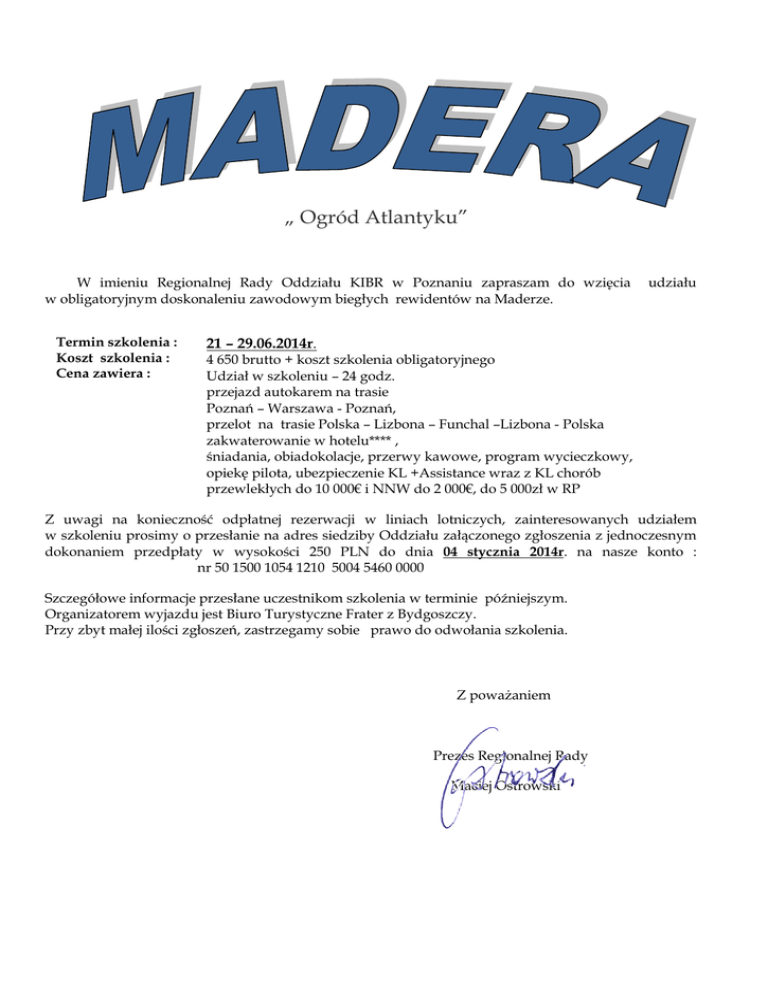 „ Ogród Atlantyku” W imieniu Regionalnej Rady Oddziału KIBR w Poznaniu zapraszam do wzięcia w obligatoryjnym doskonaleniu zawodowym biegłych rewidentów na Maderze. Termin szkolenia : Koszt szkolenia : Cena zawiera : udziału 21 – 29.06.2014r. 4 650 brutto + koszt szkolenia obligatoryjnego Udział w szkoleniu – 24 godz. przejazd autokarem na trasie Poznań – Warszawa - Poznań, przelot na trasie Polska – Lizbona – Funchal –Lizbona - Polska zakwaterowanie w hotelu**** , śniadania, obiadokolacje, przerwy kawowe, program wycieczkowy, opiekę pilota, ubezpieczenie KL +Assistance wraz z KL chorób przewlekłych do 10 000€ i NNW do 2 000€, do 5 000zł w RP Z uwagi na konieczność odpłatnej rezerwacji w liniach lotniczych, zainteresowanych udziałem w szkoleniu prosimy o przesłanie na adres siedziby Oddziału załączonego zgłoszenia z jednoczesnym dokonaniem przedpłaty w wysokości 250 PLN do dnia 04 stycznia 2014r. na nasze konto : nr 50 1500 1054 1210 5004 5460 0000 Szczegółowe informacje przesłane uczestnikom szkolenia w terminie późniejszym. Organizatorem wyjazdu jest Biuro Turystyczne Frater z Bydgoszczy. Przy zbyt małej ilości zgłoszeń, zastrzegamy sobie prawo do odwołania szkolenia. Z poważaniem Prezes Regionalnej Rady Maciej Ostrowski