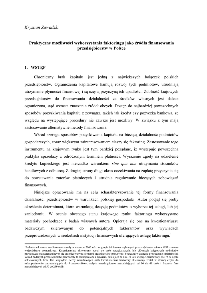 Krystian Zawadzki Praktyczne możliwości wykorzystania faktoringu jako źródła finansowania przedsiębiorstw w Polsce 1. WSTĘP Chroniczny brak kapitału jest jedną z największych bolączek polskich przedsiębiorstw. Ograniczenia kapitałowe hamują rozwój tych podmiotów, utrudniają utrzymanie płynności finansowej i są częstą przyczyną ich upadłości. Zdolność krajowych przedsiębiorstw do finansowania działalności ze środków własnych jest dalece ograniczona, stąd wzrasta znaczenie źródeł obcych. Dostęp do najbardziej powszechnych sposobów pozyskiwania kapitału z zewnątrz, takich jak kredyt czy pożyczka bankowa, ze względu na występujące procedury nie zawsze jest możliwy. W związku z tym mają zastosowanie alternatywne metody finansowania. Wśród szeregu sposobów pozyskiwania kapitału na bieżącą działalność podmiotów gospodarczych, coraz większym zainteresowaniem cieszy się faktoring. Zastosowanie tego instrumentu na krajowym rynku jest tym bardziej pożądane, iż występuje powszechna praktyka sprzedaży z odroczonym terminem płatności. Wyrażenie zgody na udzielenie kredytu kupieckiego jest nierzadko warunkiem sine qua non utrzymania stosunków handlowych z odbiorcą. Z drugiej strony długi okres oczekiwania na zapłatę przyczynia się do powstawania zatorów płatniczych i utrudnia regulowanie bieżących zobowiązań finansowych. Niniejsze opracowanie ma na celu scharakteryzowanie tej formy finansowania działalności przedsiębiorstw w warunkach polskiej gospodarki. Autor podjął się próby określenia determinant, które warunkują decyzję podmiotów o wyborze tej usługi, lub jej zaniechaniu. W ocenie obecnego stanu krajowego rynku faktoringu wykorzystano materiały pochodzące z badań własnych autora. Opierają się one na kwestionariuszu badawczym skierowanym do potencjalnych faktorantów oraz wywiadach przeprowadzonych w siedzibach instytucji finansowych oferujących usługę faktoringu.1 1 Badania ankietowe zrealizowane zostały w czerwcu 2006 roku w grupie 90 losowo wybranych przedsiębiorstw sektora MSP z terenu województwa pomorskiego. Kwestionariusz skierowany został do osób zarządzających, lub głównych księgowych podmiotów prywatnych charakteryzujących się zróżnicowanymi formami organizacyjno-prawnymi i branżami w zakresie prowadzonej działalności. Wśród badanych przedsiębiorstw przeważały te zaznajomione z rynkiem, działające na nim 10 lat i więcej. Obejmowały one 75 % ogółu ankietowanych firm. Pod względem liczby zatrudnionych osób kwestionariusz badawczy skierowany został w równej części do mikropodmiotów zatrudniających do 9 pracowników, małych przedsiębiorstw zatrudniających od 10 do 49 osób i średnich firm zatrudniających od 50 do 249 osób. 2. CZYNNIKI WARUNKUJĄCE WYBÓR USŁUGI FAKTORINGU NA POLSKIM RYNKU Warunki gospodarki rynkowej powodują, iż pojawia się konieczność posługiwania się nowoczesnymi instrumentami, wspomagającymi proces zarządzania finansami w przedsiębiorstwie. Kluczowa dla zwiększania potencjału ekonomicznego i poprawy wartości rynkowej podmiotów gospodarczych okazuje się umiejętność pozyskiwania i właściwego doboru źródeł finansowania. Możliwości, jakie daje w tym zakresie rynek finansowy są coraz większe – nie oznacza to jednak, iż wszystkie źródła pozyskiwania kapitałów mogą być przez zarządzających równie skutecznie wykorzystywane. Wybór optymalnego sposobu finansowania winien być zawsze poprzedzony gruntowną analizą opłacalności poszczególnych przedsięwzięć. Uwaga ta odnosi się również do faktoringu, którego skuteczne wykorzystanie obwarowane jest pewnymi warunkami. Przede wszystkim instrument ten nie jest przeznaczony dla wszystkich przedsiębiorstw bez wyjątku. Nie należy go traktować na równi z innymi formami finansowania, gdyż jego zalety nie kończą się na wspomaganiu podmiotów gospodarczych w niezbędny kapitał. Z drugiej strony nieumiejętne zastosowanie faktoringu może okazać się kosztowne i przyczynić się do pogłębienia istniejących problemów finansowych. Przykładowo bezzasadne mogłoby się okazać wykorzystanie faktoringu przez podmioty sporadycznie stosujące kredyty kupieckie, charakteryzujące się wysokim poziomem kapitału obrotowego i ponoszące niewielkie koszty administracyjne swej działalności. Jeśli jednak tylko zastosowanie tej usługi jest celowe, korzyści i satysfakcja mogą być znaczące. Pomimo trójpodmiotowości, umowa faktoringu może przynieść wymierne profity wszystkim zainteresowanym stronom. Instytucje faktoringowe mają szansę pozyskać nowych, solidnych partnerów gospodarczych, z którymi prowadzić będą wieloletnią, owocną współpracę. Zwiększenie się liczby klientów przekłada się na wzrost obrotów i dochodów, tym bardziej, że oprócz standardowych opłat i prowizji od udzielonych dostawcy kredytów i zaliczek, faktorzy mogą liczyć na profity z tytułu świadczenia dodatkowych usług. Dłużnicy mogą negocjować dłuższe okresy spłaty zobowiązań, a także -jeżeli faktor jest bankiem - ubiegać się o kredyty przyznawane na preferencyjnych warunkach. Wskazując na motywy zainteresowania faktoringiem przez potencjalnych faktorantów, należy uwzględnić:2 - negatywne skutki opóźnień w płatnościach, - wzrost zapotrzebowania na kapitał obrotowy z powodu wydłużenia się terminów płatności, - możliwość prowadzenia skutecznej walki z konkurencją, - potrzebę finansowania umów handlowych przy braku własnych środków, - konieczność udzielania kredytów kupieckich, - bardziej efektywne zarządzanie finansami. Na rynku widoczna jest tendencja do wydłużania cykli rozliczeniowych wynikających z umów sprzedaży towarów lub usług. Potwierdzają to przeprowadzone przez autora badania, z których wyeliminowano na wstępie podmioty z zasady nie stosujące odroczonej płatności. W tej grupie znala