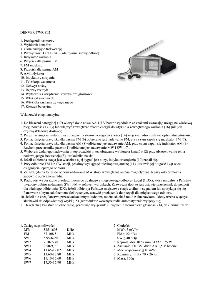 DENVER TWR-802 1. Przełącznik taśmowy 2. Wybierak kanałów 3. Okna nadające frekwencję 3. Przełącznik DX/LOCAL (zdalny/miejscowy odbiór) 5. Indykator zasilania 6. Przycisk dla pasma FM 7. FM indykator 8. Przycisk dla pasma AM 9. AM indykator 10. Indykatory strojenia 11. Teleskopowa antena 12. Uchwyt nośny 13. Ręczny rzemyk 14. Wyłącznik i urządzenie sterownicze głośności 15. Wtyk od słuchawek 16. Wtyk dla zasilania zewnętrznego 17. Kieszeń bateryjna Wskazówki eksploatacyjne: 1. Do kieszeni bateryjnej (17) włożyć dwie nowe AA 1,5 V baterie zgodnie z ze znakami zwracając uwagę na właściwą biegunowość (+) i (-) lub włączyć zewnętrzne źródło energii do wtyki dla zewnętrznego zasilania (16) (nie jest częścią składową dostawy). 2. Przez naciśnięcie wyłącznika i urządzenia sterowniczego głośności (14) włączyć radio i ustawić optymalną głośność. 3. Po naciśnięciu przycisku dla pasma FM (6) odbierane jest nadawanie FM, przy czym zapali się indykator FM (7). 4. Po naciśnięciu przycisku dla pasma AM (8) odbierane jest nadawanie AM, przy czym zapali się indykator AM (9). Ruchem przełącznika pasem (1) odbierane jest nadawanie MW i SW 1-7 . 5. Wyborem żądanego nadawania przeprowadzić przez obracanie wybieraka kanałów (2) przy obserwowaniu okna nadawającego frekwencję (3) i wskaźnika na skali. 6. Jeżeli odbierana stacja jest właściwa a jej sygnał jest silny, indykator strojenia (10) zapali się. 7. Przy odbiorze FM lub SW stacji, prosimy wyciągnąć teleskopową antenę (11) i ustawić jej długość i kąt w celu osiągnięcia lepszego odbioru. 8. Ze względu na to, że do odboru nadawania MW służy wewnętrzna antena magnetyczna, lepszy odbiór można zapewnić obracaniem radia. 9. Radio jest wyposażone przełącznikiem do zdalnego i miejscowego odbioru (Local & DX), który umożliwia Państwu wygodny odbiór nadawania SW i FM w różnych warunkach. Zazwyczaj dobrze jest ustawić przełącznik do pozycji dla zdalnego odbierania (DX); jeżeli odbierają Państwo miejscowe stacje z silnym sygnałem lub spotykają się się Państwo z silnym zakłóceniem elektrycznym, ustawić przełącznik do pozycji dla miejscowego odbioru. 10. Jeżeli nie chcą Państwo przeszkadzać innym ludziom, można słuchać radio z słuchawkami, kiedy trzeba włączyć słuchawki do odpowiedniej wtyki (15) (reproduktor wewnątrz radia automatycznie wyłączy się). 11. Jeżeli chcą Państwo słuchać radio, przesunąć wyłącznik i urządzenie sterownicze głośności (14) w kierunku w dół. 1. Zasięg częstotliwości: MW 525-1605 FM 87-108,5 SW1 5,95-6-20 SW2 7,10-7-30 SW3 9,50-9,90 SW4 11,65-12,02 SW5 13,60-13,80 SW6 15,10-15,60 SW7 17,50-17,90 KHz MHz MHz MHz MHz MHz MHz MHz MHz 2. Czułość: MW≤ 3 mV/m FM ≤ 22 dBμ SW ≤ 40 dBμ 3. Reproduktor: Φ 57 mm / 4 Ω / 0,25 W 4. Zasilanie: DC 3V, dwie AA 1,5 V baterie 5. Moc wyjściowa: ≤ 10 mW 6. Rozmiary: 110 x 70 x 26 mm 7. Masa: 150g