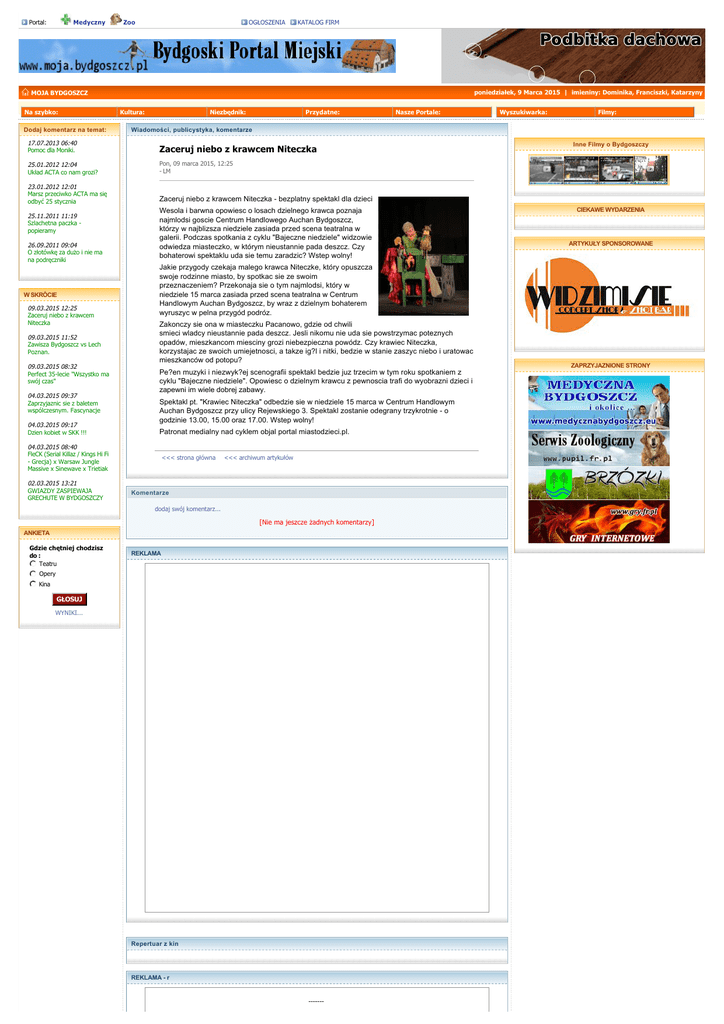 Portal: Medyczny Zoo OGŁOSZENIA KATALOG FIRM poniedziałek, 9 Marca 2015 | imieniny: Dominika, Franciszki, Katarzyny MOJA BYDGOSZCZ Na szybko: Kultura: Niezbędnik: Przydatne: Nasze Portale: Wyszukiwarka: Filmy: Dodaj komentarz na temat: Wiadomości, publicystyka, komentarze 17.07.2013 06:40 Pomoc dla Moniki. Zaceruj niebo z krawcem Niteczka 25.01.2012 12:04 Układ ACTA co nam grozi? Pon, 09 marca 2015, 12:25 - LM 23.01.2012 12:01 Marsz przeciwko ACTA ma się odbyć 25 stycznia Zaceruj niebo z krawcem Niteczka - bezplatny spektakl dla dzieci Inne Filmy o Bydgoszczy CIEKAWE WYDARZENIA Wesola i barwna opowiesc o losach dzielnego krawca poznaja najmlodsi goscie Centrum Handlowego Auchan Bydgoszcz, którzy w najblizsza niedziele zasiada przed scena teatralna w galerii. Podczas spotkania z cyklu "Bajeczne niedziele" widzowie odwiedza miasteczko, w którym nieustannie pada deszcz. Czy bohaterowi spektaklu uda sie temu zaradzic? Wstep wolny! 25.11.2011 11:19 Szlachetna paczka popieramy 26.09.2011 09:04 O złotówkę za dużo i nie ma na podręczniki ARTYKUŁY SPONSOROWANE Jakie przygody czekaja malego krawca Niteczke, który opuszcza swoje rodzinne miasto, by spotkac sie ze swoim przeznaczeniem? Przekonaja sie o tym najmlodsi, który w niedziele 15 marca zasiada przed scena teatralna w Centrum Handlowym Auchan Bydgoszcz, by wraz z dzielnym bohaterem wyruszyc w pelna przygód podróz. W SKRÓCIE 09.03.2015 12:25 Zaceruj niebo z krawcem Niteczka Zakonczy sie ona w miasteczku Pacanowo, gdzie od chwili smieci wladcy nieustannie pada deszcz. Jesli nikomu nie uda sie powstrzymac poteznych opadów, mieszkancom miesciny grozi niebezpieczna powódz. Czy krawiec Niteczka, korzystajac ze swoich umiejetnosci, a takze ig?l i nitki, bedzie w stanie zaszyc niebo i uratowac mieszkanców od potopu? 09.03.2015 11:52 Zawisza Bydgoszcz vs Lech Poznan. 09.03.2015 08:32 Perfect 35-lecie "Wszystko ma swój czas" ZAPRZYJAZNIONE STRONY Pe?en muzyki i niezwyk?ej scenografii spektakl bedzie juz trzecim w tym roku spotkaniem z cyklu "Bajeczne niedziele". Opowiesc o dzielnym krawcu z pewnoscia trafi do wyobrazni dzieci i zapewni im wiele dobrej zabawy. 04.03.2015 09:37 Zaprzyjaznic sie z baletem wspólczesnym. Fascynacje Spektakl pt. "Krawiec Niteczka" odbedzie sie w niedziele 15 marca w Centrum Handlowym Auchan Bydgoszcz przy ulicy Rejewskiego 3. Spektakl zostanie odegrany trzykrotnie - o godzinie 13.00, 15.00 oraz 17.00. Wstep wolny! 04.03.2015 09:17 Dzien kobiet w SKK !!! Patronat medialny nad cyklem objal portal miastodzieci.pl. 04.03.2015 08:40 FleCK (Serial Killaz / Kings Hi Fi - Grecja) x Warsaw Jungle Massive x Sinewave x Trietiak <<< strona główna <<< archiwum artykułów 02.03.2015 13:21 GWIAZDY ZASPIEWAJA GRECHUTE W BYDGOSZCZY Komentarze dodaj swój komentarz... [Nie ma jeszcze żadnych komentarzy] ANKIETA Gdzie chętniej chodzisz do : Teatru REKLAMA Opery Kina GŁOSUJ WYNIKI... Repertuar z kin REKLAMA - r ------- ------- 1 --- 2--- 3--- 4--- 5--- 6--- 7--- 8--- 9--- 10--- : : o portalu : : kontakt : : cennik : : (c) Copyright 2015 Internetowy Portal Miejski - www.moja.bydgoszcz.pl