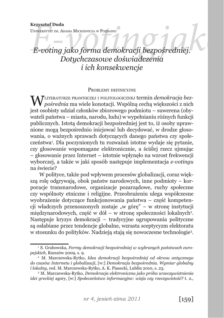 E-voting jako Krzysztof Duda Uniwersytet im. Adama Mickiewicza w Poznaniu E-voting jako forma demokracji bezpośredniej. Dotychczasowe doświadczenia i ich konsekwencje Problemy definicyjne literaturze prawniczej i politologicznej termin demokracja bezpośrednia ma wiele konotacji. Wspólną cechą większości z nich jest osobisty udział członków zbiorowego podmiotu – suwerena (obywateli państwa – miasta, narodu, ludu) w wypełnianiu różnych funkcji publicznych. Istotą demokracji bezpośredniej jest to, iż osoby uprawnione mogą bezpośrednio inicjować lub decydować, w drodze głosowania, o ważnych sprawach dotyczących danego państwa czy społeczeństwa1. Dla poczynionych tu rozważań istotne wydaje się pytanie, czy głosowanie wspomagane elektronicznie, a ściślej rzecz ujmując – głosowanie przez Internet – istotnie wpłynęło na wzrost frekwencji wyborczej, a także w jaki sposób następuje implementacja e-votingu na świecie? W polityce, także pod wpływem procesów globalizacji, coraz większą rolę odgrywają, obok państw narodowych, inne podmioty – korporacje transnarodowe, organizacje pozarządowe, ruchy społeczne czy wspólnoty etniczne i religijne. Przeobrażeniu ulega współczesne wyobrażenie dotyczące funkcjonowania państwa – część kompetencji władczych przenoszonych zostaje „w górę” – w stronę instytucji międzynarodowych, część w dół – w stronę społeczności lokalnych2. Następuje kryzys demokracji – tradycyjne ugrupowania polityczne są osłabiane przez tendencje globalne, wzrasta sceptycyzm elektoratu w stosunku do polityków. Nadzieją stają się nowoczesne technologie3. W 1 S. Grabowska, Formy demokracji bezpośredniej w wybranych państwach europejskich, Rzeszów 2009, s. 9. 2 M. Marczewska-Rytko, Idea demokracji bezpośredniej od okresu antycznego do czasów Internetu i globalizacji, [w:] Demokracja bezpośrednia. Wymiar globalny i lokalny, red. M. Marczewska-Rytko, A. K. Piasecki, Lublin 2010, s. 23. 3 M. Marczewska-Rytko, Demokracja elektroniczna jako próba urzeczywistnienia idei greckiej agory, [w:] Społeczeństwo informacyjne: wizja czy rzeczywistość? t. 2., nr 4, jesień-zima 2011 [159] Krzysztof Duda Pomagają one w informowaniu obywateli i ułatwiają im partycypację polityczną4. Ale czy na pewno? Wraz z pojęciem demokracji elektronicznej równolegle używa się takich pojęć jak teledemokracja, demokracja cyfrowa czy cyberdemokracja. Na poziomie semantycznym proponowane są też nowe pojęcia: wirtualna demokracja, elektroniczna republika czy e-demokracja5. Niezależnie od przyjętej perspektywy i zakresu samego pojęcia, wspólna dla tych koncepcji jest wiara, że rozmaite funkcje nowych technologii – interaktywność, szybszy tryb przekazywania informacji, możliwość komunikacji zwrotnej – mogą pozytywnie oddziaływać na mechanizmy demokratyczne. Zwolennicy demokratyzacji elektronicznej chcą tworzyć nowe i alternatywne (względem środków masowego przekazu) kanały informacji i komunikacji między społecznościami a jej reprezentantami6. E-demokrację można zdefiniować jako zastosowanie technologii informacyjno-telekomunikacyjnych dla zwiększenia uczestnictwa obywateli w procesach demokratycznych, zarówno w ujęciu ilościowym, jak i w formie realnego wpływu wywieranego przez jednostki na funkcjonowanie instytucji publicznych7. Podstawowym medium, które może zostać wykorzystane w tym względzie jest Internet. W definicji Organizacji Współpracy Gospodarczej i Rozwoju (OECD) przyjmuje się trzy poziomy e-demokracji8: informowania, konsultowania oraz aktywnego uczestnictwa w życiu politycznym. Co więcej, e-demokracja to działania dwojakiego rodzaju – odgórne, do których zalicza się inicjatywy rządu, władz lokalnych – oraz oddolne, czyli inicjatywy podejmowane przez obywateli czy organizacje społeczne. Wartymi uwagi przykładami konsultowania się władz z obywatelami są Islandia i Wielka Brytania. W pierwszym z wymienionych państw, po kryzysie gospodarczym, od 2009 r. trwają prace nad uchwaleniem nowej konstytucji. W ich toku obywatele mieli możliwość składania własnych propozycji, między innymi przez specjalnie do tego celu stworzoną stronę internetową oraz portale społecznościored. L. H. Haber, Kraków 2004, s. 137 i nast. 4 R. Dahl, Demokracja i jej krytycy, Kraków 1995, s. 467. 5 D. Grodzka, E-demokracja, „Infos” 2009, nr 14 (61), s. 1. 6 M. Nowina-Konopka, Społeczeństwo informacyjne a teorie demokracji, [w:] Społeczeństwo informacyjne: istota, rozwój, wyzwania, red. T. Białobłocki, J. Moroz, M. Nowina-Konopka, L. W. Zacher, Warszawa 2006, s. 93. 7 Szerzej: M. Marczewska-Rytko, Idea…, op. cit., s. 25. 8 D. Grodzka, E-demokracja..., op. cit., s. 2. [160] refleksje E-voting jako forma demokracji bezpośredniej. Dotychczasowe doświadczenia... we, do 25-osobowej komisji, która formalnie tworzyła ten akt. Od kilku lat próbuje się także wdrożyć system konsultowania aktów prawnych w brytyjskim parlamencie. W tym celu uruchomiono specjalne forum, na którym użytkownicy mogą zgłaszać swoje uwagi związane z pracami wybranych komisji parlamentu. Z pojęciem e-demokracji bezpośrednio związane jest pojęcie e-votingu, które m.in. dotyczy głosowania za pomocą maszyny elektronicznej w lokalu wyborczym, ale także głosowania w specjalnych kioskach internetowych umieszczonych w różnych miejscach publicznych, przy użyciu telefonu komórkowego (z wykorzystaniem wiadomości SMS) lub komputera podłączonego do Internetu, a także elektronicznej inicjatywy ustawodawczej. Wybory elektroniczne to pojęcie obejmujące szeroki zakres zastosowań technik informatycznych w referendach oraz wyborach powszechnych, zakłada bowiem9: elektroniczną wizualizację wyników wyborów – systemy komputerowe pełnią rolę pomocniczą przy ich prezentacji; głosowanie wspomagane elektronicznie – systemy komputerowe są głównym narz