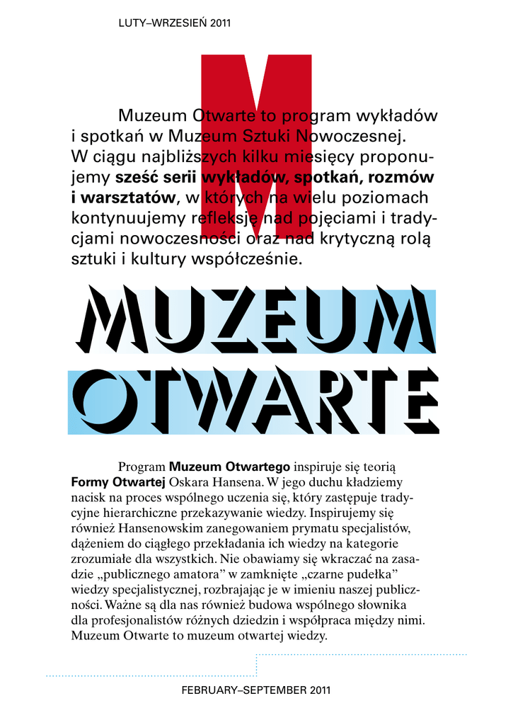 luty–wrzesień 2011 Muzeum Otwarte to program wykładów i spotkań w Muzeum Sztuki Nowoczesnej. W ciągu najbliższych kilku miesięcy proponujemy sześć serii wykładów, spotkań, rozmów i warsztatów, w których na wielu poziomach kontynuujemy refleksję nad pojęciami i tradycjami nowoczesności oraz nad krytyczną rolą sztuki i kultury współcześnie. Muzeum Otwarte Program Muzeum Otwartego inspiruje się teorią Formy Otwartej Oskara Hansena. W jego duchu kładziemy nacisk na proces wspólnego uczenia się, który zastępuje trady cyjne hierarchiczne przekazywanie wiedzy. Inspirujemy się również Hansenowskim zanegowaniem prymatu specjalistów, dążeniem do ciągłego przekładania ich wiedzy na kategorie zrozumiałe dla wszystkich. Nie obawiamy się wkraczać na zasa dzie „publicznego amatora” w zamknięte „czarne pudełka” wiedzy specjalistycznej, rozbrajając je w imieniu naszej publicz ności. Ważne są dla nas również budowa wspólnego słownika dla profesjonalistów różnych dziedzin i współpraca między nimi. Muzeum Otwarte to muzeum otwartej wiedzy. february–september 2011 Muzeum Otwarte jest eksperymentem na wielu poziomach. Cykle wykładów, tematycznie bardzo różnorodne, są otwarte na korekty, krytykę i współudział słuchaczy — traktujemy je jako niedomknięte, stale szukające nowych interpretacji. The Open Museum is a program of lectures and meetings in the Museum of Modern Art in Warsaw. Within the next few months we offer you a series of lectures, meetings, talks, and workshops where, on a variety of levels, we aim to continue our reflection on the notions, tasks, scope, and traditions of modernity, as well as on the critical role of art and culture in contemporary times. The program of the Open Museum has been inspired by Oskar Hansen’s theory of the Open Form. It is in this spirit that we focus on the process of mutual learning which replaces the traditional means of the hierarchical transfer of knowledge. We also draw inspiration on Hansen’s negation of the superiority of specialists and his desire to translate expert knowledge into categories understandable by all. We have no fear of adopting the role of a “public amateur” and as such intruding into the “black boxes” of expert wisdom, dismantling them on behalf of our own public. It is also important for us to work on building a common vocabulary for professionals from different disciplines and facilitating their collaboration. An open museum is a museum of open knowledge. The Open Museum is to be an experiment on many different levels. The series of lectures, thematically extremely diverse, shall be open to corrections, criticism and participation. They are intended to be never closed and constantly seeking new interpretations. Workshops for children and young people have been entrusted to the students and practitioners of Hansen’s tradition. Here the methods of Open Form will be put to a practical test; Wiktor Gutt will conduct CHILDREN’S INITIATIONS, Grzegorz Kowalski will encourage junior high school students to perform the famous exercise COMMON AREA, PRIVATE AREA, while Zbigniew Libera will together with young adults from high schools perform ACTIONS WITH A CAMERA. In the series WHERE IS THE MUSEUM? prepared by Joanna Mytkowska and Sebastian Cichocki, we take the perspective of our newly-established institution to pose questions about the role of a museum. Edwin Bendyk, on the other hand, will devote his CONSPIRACY OF CULTURE series to dwell on the issue of why culture has legitimised neo-liberalism. MISTER WARSAW 50 YEARS LATER, a series of meetings of Tomasz Fudala with the youngest generation of Polish architecture historians and critics, will present phenomena which the two groups deem the most crucial in Polish architecture design of the time of communism. The project continues our focus on architecture, which is of paramount importance for us on account of the debate generated by the future building of our Museum. With two other projects - The performative turn. On the relations between theatre, dance and visual arts by Ana Janevski and Joanna Warsza as well as RE:FORM. BETWEEN CINEMA AND ART by Łukasz Ronduda and Kuba Mikurda we open the Museum up to the realms of theatre, dance and film. The future Museum is designed for a wide public and therefore we want to enter new ter ritories and seek new audiences. We never tire of more philosophical debates about history and the present; this year, in a series of lectures and meetings titled AFTER THE END OF THE PHOTO STORY, Krzysztof Pijarski will address questions from the frontiers of visual arts, photography, and contemporary philosophy. Unlike the program of exhibitions, research or publications of the Museum, the cur rent program of lectures, meetings and workshops is scheduled for only a few months ahead. We try not to adopt long-term assumptions and plans as ongoing questions change too dynamically to be held within a fixed agenda. Apart from the series of lectures, meetings and workshops introduced here, our Museum plans to host many events of which we will keep you posted through the Museum’s website www.artmuseum.pl, via Facebook and museum newsletters, which you can obtain after logging on our website. Everyone is most welcome! Warsztaty dla dzieci i młodzieży zdecydowaliśmy się powierzyć bezpośrednim uczniom i kontynuatorom tradycji Hansenowskiej. Tutaj metody Formy Otwartej zostaną praktycznie przećwiczone: Wiktor Gutt poprowadzi Inicjacje dziecięce, Grzegorz Kowalski zaprosi młodzież gimnazjalną do wykonania słynnego ćwiczenia Obszar wspólny, obszar własny, a Zbigniew Libera wspólnie z młodzieżą licealną zrealizuje Działania z kamerą. W cyklu Gdzie jest muzeum?, przygotowanym przez Joannę Mytkowską i Sebastiana Cichockiego, z perspektywy naszej nowo powstającej instytucji stawiamy pytanie o krytyczną rolę muzeów w obrębie współczesnej kultury. Z kolei Edwin B
