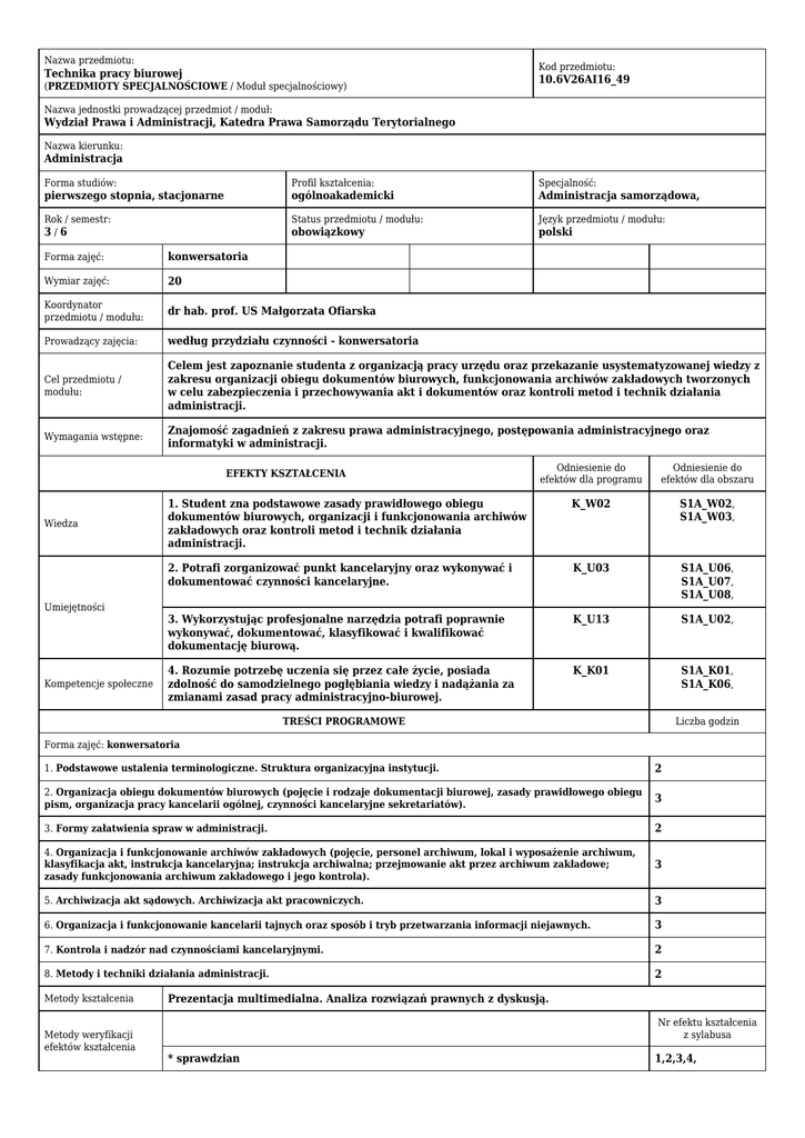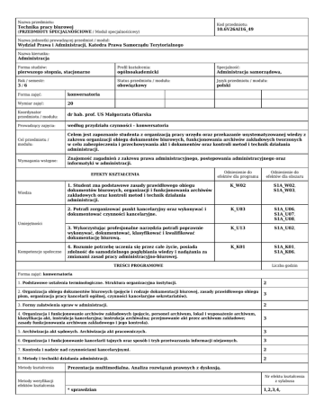 Nazwa przedmiotu: Kod przedmiotu: Technika pracy biurowej (PRZEDMIOTY SPECJALNOŚCIOWE / Moduł specjalnościowy) 10.6V26AI16_49 Nazwa jednostki prowadzącej przedmiot / moduł: Wydział Prawa i Administracji, Katedra Prawa Samorządu Terytorialnego Nazwa kierunku: Administracja Forma studiów: Profil kształcenia: Specjalność: pierwszego stopnia, stacjonarne ogólnoakademicki Administracja samorządowa, Rok / semestr: 3/6 Status przedmiotu / modułu: Język przedmiotu / modułu: obowiązkowy polski Forma zajęć: konwersatoria Wymiar zajęć: 20 Koordynator przedmiotu / modułu: dr hab. prof. US Małgorzata Ofiarska Prowadzący zajęcia: według przydziału czynności - konwersatoria Cel przedmiotu / modułu: Celem jest zapoznanie studenta z organizacją pracy urzędu oraz przekazanie usystematyzowanej wiedzy z zakresu organizacji obiegu dokumentów biurowych, funkcjonowania archiwów zakładowych tworzonych w celu zabezpieczenia i przechowywania akt i dokumentów oraz kontroli metod i technik działania administracji. Wymagania wstępne: Znajomość zagadnień z zakresu prawa administracyjnego, postępowania administracyjnego oraz informatyki w administracji. Odniesienie do efektów dla programu Odniesienie do efektów dla obszaru 1. Student zna podstawowe zasady prawidłowego obiegu dokumentów biurowych, organizacji i funkcjonowania archiwów zakładowych oraz kontroli metod i technik działania administracji. K_W02 S1A_W02, S1A_W03, 2. Potrafi zorganizować punkt kancelaryjny oraz wykonywać i dokumentować czynności kancelaryjne. K_U03 S1A_U06, S1A_U07, S1A_U08, 3. Wykorzystując profesjonalne narzędzia potrafi poprawnie wykonywać, dokumentować, klasyfikować i kwalifikować dokumentację biurową. K_U13 S1A_U02, 4. Rozumie potrzebę uczenia się przez całe życie, posiada zdolność do samodzielnego pogłębiania wiedzy i nadążania za zmianami zasad pracy administracyjno-biurowej. K_K01 S1A_K01, S1A_K06, EFEKTY KSZTAŁCENIA Wiedza Umiejętności Kompetencje społeczne TREŚCI PROGRAMOWE Liczba godzin Forma zajęć: konwersatoria 1. Podstawowe ustalenia terminologiczne. Struktura organizacyjna instytucji. 2 2. Organizacja obiegu dokumentów biurowych (pojęcie i rodzaje dokumentacji biurowej, zasady prawidłowego obiegu pism, organizacja pracy kancelarii ogólnej, czynności kancelaryjne sekretariatów). 3 3. Formy załatwienia spraw w administracji. 2 4. Organizacja i funkcjonowanie archiwów zakładowych (pojęcie, personel archiwum, lokal i wyposażenie archiwum, klasyfikacja akt, instrukcja kancelaryjna; instrukcja archiwalna; przejmowanie akt przez archiwum zakładowe; zasady funkcjonowania archiwum zakładowego i jego kontrola). 3 5. Archiwizacja akt sądowych. Archiwizacja akt pracowniczych. 3 6. Organizacja i funkcjonowanie kancelarii tajnych oraz sposób i tryb przetwarzania informacji niejawnych. 3 7. Kontrola i nadzór nad czynnościami kancelaryjnymi. 2 8. Metody i techniki działania administracji. 2 Metody kształcenia Metody weryfikacji efektów kształcenia Prezentacja multimedialna. Analiza rozwiązań prawnych z dyskusją. Nr efektu kształcenia z sylabusa * sprawdzian 1,2,3,4, Forma i warunki zaliczenia Zaliczenie na ocenę. Zaliczenie na podstawie obecności, aktywności i pozytywnego wyniku sprawdzianu. Sprawdzian obejmuje znajomość zagadnień omówionych w trakcie zajęć oraz zalecanej literatury przedmiotu. Sprawdzian ma formę testu. Test jednokrotnego wyboru obejmuje 30 pytań. Student wybiera dla każdego zagadnienia 1 odpowiedź spośród proponowanych 3 wersji. Każda prawidłowa odpowiedź umożliwia uzyskanie 1 punktu. Prawidłowo rozwiązany test umożliwia uzyskanie 30 punktów. Zasady oceniania testu są następujące: - 29-30 pkt - bardzo dobry, - 27-28 pkt - dobry plus, - 25-26 pkt - dobry, 22-24 pkt - dostateczny plus, - 18-21 pkt - dostateczny, - poniżej 18 pkt - niedostateczny. Literatura podstawowa Zacharko L., Zacharko E. (2005): Organizacja pracy administracyjno-biurowej. Zagadnienia prawne. Wyższa Szkoła Administracji Bielsko-Biała Literatura uzupełniająca Mitura E. (red.) (2009): Organizacja pracy biurowej. Difin Kral P. (2011): Nowa instrukcja kancelaryjna z komentarzem i instruktażem sporządzania dla organów jednostek samorządu terytorialnego lub rządowej administracji zespolonej w województwie oraz obsługujących je urzędów. ODDK Gdańsk Nawrocki S., Sierpowski S. (red.) (2004): Metodyka pracy archiwalnej. Wydawnictwo Naukowe UAM Poznań NAKŁAD PRACY STUDENTA: Liczba godzin Zajęcia dydaktyczne 20 Udział w konsultacjach 6 Zdawanie egzaminu lub/i zaliczenia 1 Przygotowanie się do zajęć 5 Studiowanie literatury 10 Przygotowanie się do egzaminu lub/i zaliczenia 8 ŁĄCZNY nakład pracy studenta w godz. 50 Liczba punktów ECTS 2