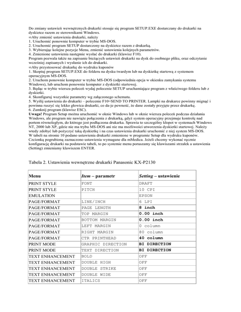 Do zmiany ustawień wewnętrznych drukarki stosuje się program SETUP.EXE dostarczany do drukarki na dyskietce razem ze sterownikami Windows. • Aby zmienić ustawienia drukarki, należy 1. Uruchomić ponownie komputer w trybie MS-DOS. 2. Uruchomić program SETUP dostarczony na dyskietce razem z drukarką. 3. Wybierając kolejne pozycje Menu, zmienić ustawienia kolejnych parametrów. 4. Zmienione ustawienia następnie wysłać do drukarki (klawisz F10). Program pozwala także na zapisanie bieżących ustawień drukarki na dysk do osobnego pliku, oraz odczytanie wcześniej zapisanych i wysłanie ich do drukarki. • Aby przystosować drukarkę do wydruku kuponów 1. Skopiuj program SETUP.EXE do folderu na dysku twardym lub na dyskietkę startową z systemem operacyjnym MS-DOS. 2. Uruchom ponownie komputer w trybie MS-DOS (odpowiednia opcja w okienku zamykania systemu Windows), lub uruchom ponownie komputer z dyskietki startowej. 3. Będąc w trybie wiersza poleceń wydaj polecenie SETUP uruchamiające program z właściwego folderu lub z dyskietki. 4. Skonfiguruj wszystkie parametry wg załączonego schematu. 5. Wyślij ustawienia do drukarki – polecenie F10=SEND TO PRINTER. Lampki na drukarce powinny mignąć i powinna ruszyć się lekko głowica drukarki, co da-je pewność, że dane zostały przyjęte przez drukarkę. 6. Zamknij program (klawisz ESC). Uwaga! Program Setup można uruchomić w oknie Windows lub w oknie wiersza poleceń podczas działania Windows, ale program nie nawiąże połączenia z drukarką, gdyż system operacyjny przejmuje kontrolę nad portem równoległym, do którego jest podłączona drukarka. Sprawia to szczególny kłopot w systemach Windows NT, 2000 lub XP, gdzie nie ma trybu MS-DOS ani nie ma możliwości utworzenia dyskietki startowej. Należy wtedy zdobyć lub pożyczyć taką dyskietkę i na czas ustawienia drukarki uruchomić z niej system MS-DOS. W tabeli na stronie 10 podano ustawienia drukarki zmienione w programie Setup dla wydruku kuponów. Czcionką pogrubioną zaznaczono ustawienia wymagane dla mMedica. Jeżeli chcemy wykonać ręcznie konfigurację drukarki na podstawie tabeli, to po systemie menu poruszamy się klawiszami strzałek a ustawienia (Setting) zmieniamy klawiszem ENTER. Tabela 2. Ustawienia wewnętrzne drukarki Panasonic KX-P2130 Menu Item – parametr Setting – ustawienie PRINT STYLE PRINT STYLE EMULATION PAGE/FORMAT PAGE/FORMAT PAGE/FORMAT PAGE/FORMAT PAGE/FORMAT PAGE/FORMAT PAGE/FORMAT PRINT MODE PRINT MODE TEXT ENHANCEMENT TEXT ENHANCEMENT TEXT ENHANCEMENT TEXT ENHANCEMENT TEXT ENHANCEMENT FONT PITCH DRAFT 10 CPI EPSON 6 LPI 8 inch 0.00 inch 0.00 inch LINE/INCH PAGE LENGTH TOP MARGIN BOTTOM MARGIN LEFT MARGIN RIGHT MARGIN CTR PRINTHEAD GRAPHIC DIRECTION TEXT DIRECTION BOLD DOUBLE HIGH DOUBLE STRIKE DOUBLE WIDE ITALICS 0 column 80 column 40 column BI DIRECTION BI DIRECTION OFF OFF OFF OFF OFF TEXT ENHANCEMENT TEXT ENHANCEMENT TEXT ENHANCEMENT CHARACTER SET CHARACTER SET CHARACTER SET INSTALL INSTALL INSTALL INSTALL INSTALL INSTALL INSTALL INSTALL INSTALL INSTALL INSTALL INSTALL T.O.F. SETTING T.O.F. SETTING OUTLINE SHADOW ZERO FONT COUNTRY CHARACTER SET CODE PAGE AGM/IBM AUTO CR/IBM AUTO LF AUTO LOADING PAPER OUT DETECT SUPER QUIET MODE TEAR OFF CSF MODE(OPTION) DOWNLOAD COLOUR AUTO ON LINE DATA LENGTH TRACTOR FRICTION T.O.F. SETTING (Single sheet) CUT SHEET FEEDER OFF OFF NORMAL U.S.A. GRAPHIC 2 PC852 OFF OFF OFF ON ON OFF AUTO OFF OFF BLACK ON 8 BITS 0 inch 0 inch 0 inch (Built-in & Option) Zmienione ustawienia należy wysłać do drukarki (klawisz F10 – polecenie SEND TO PRINTER). Można je też zapisać na dyskietkę (klawisz F3 – polecenie SAVE TO DISK).