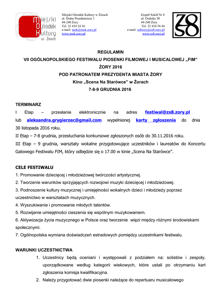 Miejski Ośrodek Kultury w Żorach ul. Dolne Przedmieście 1 44-240 Żory Tel. 32 434 24 36 e-mail: [email protected] www.mok.zory.pl Zespół Szkół Nr 8 ul. Osińska 50 44-240 Żory Tel. 32 434 54 44 e-mail: [email protected] www.zs8.zory.pl REGULAMIN VII OGÓLNOPOLSKIEGO FESTIWALU PIOSENKI FILMOWEJ I MUSICALOWEJ „FIM” ŻORY 2016 POD PATRONATEM PREZYDENTA MIASTA ŻORY Kino „Scena Na Starówce” w Żorach 7-8-9 GRUDNIA 2016 TERMINARZ I lub Etap – przesłanie elektronicznie [email protected] na adres wypełnionej [email protected] karty zgłoszenia do dnia 30 listopada 2016 roku. II Etap – 7-8 grudnia, przesłuchania konkursowe zgłoszonych osób do 30.11.2016 roku. III Etap – 9 grudnia, warsztaty wokalne przygotowujące uczestników i laureatów do Koncertu Galowego Festiwalu FIM, który odbędzie się o 17.00 w kinie „Scena Na Starówce”. CELE FESTIWALU 1. Promowanie dziecięcej i młodzieżowej twórczości artystycznej. 2. Tworzenie warunków sprzyjających rozwojowi muzyki dziecięcej i młodzieżowej. 3. Podnoszenie kultury muzycznej i umiejętności wokalnych dzieci i młodzieży poprzez uczestnictwo w warsztatach muzycznych. 4. Wyszukiwanie i promowanie młodych talentów. 5. Rozwijanie umiejętności cieszenia się wspólnym muzykowaniem. 6. Aktywizacja życia muzycznego w Polsce oraz tworzenie więzi między różnymi środowiskami społecznymi. 7. Ogólnopolska wymiana doświadczeń estradowych pomiędzy uczestnikami festiwalu. WARUNKI UCZESTNICTWA 1. Uczestnicy będą oceniani i występowali z podziałem na: solistów i zespoły, uporządkowane według kategorii wiekowych, które ustali po otrzymaniu kart zgłoszenia komisja kwalifikacyjna. 2. Należy przygotować dwie piosenki należące do repertuaru musicalowego Miejski Ośrodek Kultury w Żorach ul. Dolne Przedmieście 1 44-240 Żory Tel. 32 434 24 36 e-mail: [email protected] www.mok.zory.pl Zespół Szkół Nr 8 ul. Osińska 50 44-240 Żory Tel. 32 434 54 44 e-mail: [email protected] www.zs8.zory.pl lub filmowego (bajki, filmy, seriale, musicale). 3. Podkłady do wykonywanych utworów przygotowują sami uczestnicy na pendrive. Prosimy, aby folder zawierający podkład był opisany: Nazwisko, imię, wiek, tytuły podkładów. 4. Piosenki mogą być wykonywane w języku oryginalnym lub języku polskim. 5. Do dnia 30 listopada 2016 r. należy przesłać elektronicznie prawidłowo wypełnioną kartę zgłoszenia. 6. Organizatorzy do dnia 04 grudnia 2016 r. poinformują elektronicznie i zaproszą uczestników, którzy zakwalifikowali się do części konkursowej festiwalu oraz prześlą program festiwalu. 7. Udział w festiwalu jest bezpłatny. 8. Wszyscy uczestnicy przystępujący do festiwalu wyrażają zgodę na udział w finale festiwalu 9 grudnia o godzinie 17.00 w kinie „Scena Na Starówce”. 9. Osoby, które po zapoznaniu się z harmonogramem festiwalu stwierdzą, że ze względu na odległe miejsce zamieszkania od Żor chcą skorzystać z noclegu lub wyżywienia proponujemy wybór na: www.zory.naszemiasto.pl 10. Pierwszego i drugiego dnia festiwalu (7-8 grudnia) należy przyjeżdżać na przesłuchania wg harmonogramu podanego uczestnikowi. Należy zgłaszać się 20 min przed wyznaczonym terminem. 11. Instytucje delegujące, uczestnicy sami pokrywają koszty przejazdu i ubezpieczenia. JURY W skład jury wchodzą osoby związane ze światem artystycznym, muzycznym oraz w zależności od zapotrzebowania fachowcy językowi. Jury oceni: o dobór repertuaru, o warsztat wokalny, o poprawność językową, o wyraz artystyczny, o interpretację piosenki. Miejski Ośrodek Kultury w Żorach ul. Dolne Przedmieście 1 44-240 Żory Tel. 32 434 24 36 e-mail: [email protected] www.mok.zory.pl Zespół Szkół Nr 8 ul. Osińska 50 44-240 Żory Tel. 32 434 54 44 e-mail: [email protected] www.zs8.zory.pl Decyzje podjęte przez jury są nieodwołalne i ostateczne. NAGRODY Wszyscy uczestnicy otrzymują dyplomy. Instruktorzy i opiekunowie podziękowania za przygotowanie uczestnika do festiwalu. Jury w poszczególnych kategoriach przyzna I, II i III miejsce. Jeśli jednak uzna za konieczne pominąć któreś z miejsc lub dodać wyróżnienie to ma takie prawo. WAŻNE! Uczestnik przystępując do festiwalu zgadza się na: o nieodpłatne wykorzystanie rejestracji festiwalu i umieszczenie go na stronie www, o przetwarzanie danych osobowych uczestników na potrzeby festiwalu, o rozstrzyganie wszelkich spraw nie ujętych regulaminem oraz jego interpretacje organizatorom festiwalu, o Jurorzy podczas przesłuchań 9 grudnia mają prawo przerwać występ uczestnika, o Wszelkie pytania i wątpliwości kierować do koordynatora festiwalu: Aleksandry Grygierzec (tel. 601510751) na adres e- mail: [email protected] lub [email protected] ( temat: FIM).