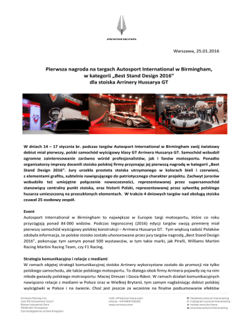 Warszawa, 25.01.2016 Pierwsza nagroda na targach Autosport International w Birmingham, w kategorii „Best Stand Design 2016” dla stoiska Arrinery Hussarya GT W dniach 14 – 17 stycznia br. podczas targów Autosport International w Birmingham swój światowy debiut miał pierwszy, polski samochód wyścigowy klasy GT Arrinera Hussarya GT. Samochód wzbudził ogromne zainteresowanie zarówno wśród profesjonalistów, jak i fanów motosportu. Ponadto organizatorzy imprezy docenili stoisko polskiej firmy przyznając jej pierwszą nagrodę w kategorii „Best Stand Design 2016”. Jury urzekła prostota stoiska utrzymanego w kolorach bieli i czerwieni, z elementami grafitu, subtelnie nawiązującego do patriotycznego charakter projektu. Zachwyt jurorów wzbudziło też umiejętne połączenie nowoczesności, reprezentowanej przez supersamochód stanowiący centralny punkt stoiska, oraz historii Polski, reprezentowanej przez sylwetkę polskiego husarza umieszczoną na przeszklonych elementach. W trakcie 4 dniowych targów nad obsługą stoiska czuwał 25 osobowy zespół. Event Autosport International w Birmingham to największe w Europie targi motosportu, które co roku przyciągają ponad 84 000 widzów. Podczas tegorocznej (2016) edycji targów swoją premierę miał pierwszy samochód wyścigowy polskiej konstrukcji – Arrinera Hussarya GT. Tym większą radość Polaków zdobyła informacja, że polskie stoisko zostało uhonorowane przez jury targów nagrodą „Best Stand Design 2016”, pokonując tym samym ponad 500 wystawców, w tym takie marki, jak Pirelli, Williams Martini Racing Martini Racing Team, czy F1 Racing. Strategia komunikacyjna i relacje z mediami W ramach objętej strategii komunikacyjnej stoisko Arrinery wykorzystane zostało do promocji nie tylko polskiego samochodu, ale także polskiego motosportu. To dlatego obok firmy Arrinera pojawiły się na nim młode gwiazdy polskiego motrosportu: Maciej Dreszer i Gosia Rdest. W ramach działań komunikacyjnych nawiązano relacje z mediami w Polsce oraz w Wielkiej Brytanii, tym samym nagłaśniając debiut polskiej wyścigówki w Polsce i na świecie. Choć jest jeszcze za wcześnie na finalne podsumowanie efektów medialnych, już widać, że będą one rewelacyjne. W 2 dniu targów agencji udało się wygenerować kilkadziesiąt publikacji o polskim stoisku w mediach zagranicznych i ponad 100 publikacji w mediach w Polsce, w tym w telewizji oraz w mediach opiniotwórczych – nie tylko motoryzacyjnych. Liczby te stale rosną. Digital Premierę Arrinery Hussarya GT wsparto także intensywną komunikacją ze społecznością fanów motosportu na FB poprzez dwa kanały: polsko- i angielskojęzyczny. Kanał www.facebook.com/arrinera.automotive, przed targami liczył 39 000 fanów, w 3 dniu targów odnotował wzrost liczby fanów o ok. 4000, a w czwartym dniu przekroczył zasięg 1 miliona użytkowników. Angielskojęzyczny profil www.facebook.com/arrineraracing został założony tuz przed targami i cały czas dynamicznie rośnie.