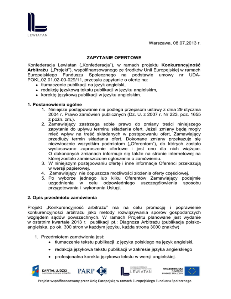Warszawa, 08.07.2013 r. ZAPYTANIE OFERTOWE Konfederacja Lewiatan („Konfederacja”), w ramach projektu Konkurencyjność Arbitrażu („Projekt”), współfinansowanego ze środków Unii Europejskiej w ramach Europejskiego Funduszu Społecznego na podstawie umowy nr UDAPOKL.02.01.02-00-029/11, przesyła zapytanie o ofertę na: tłumaczenie publikacji na język angielski, redakcję językową tekstu publikacji w języku angielskim, korektę językową publikacji w języku angielskim. 1. Postanowienia ogólne 1. Niniejsze postępowanie nie podlega przepisom ustawy z dnia 29 stycznia 2004 r. Prawo zamówień publicznych (Dz. U. z 2007 r. Nr 223, poz. 1655 z późn. zm.). 2. Zamawiający zastrzega sobie prawo do zmiany treści niniejszego zapytania do upływu terminu składania ofert. Jeżeli zmiany będą mogły mieć wpływ na treść składanych w postępowaniu ofert, Zamawiający przedłuży termin składania ofert. Dokonane zmiany przekazuje się niezwłocznie wszystkim podmiotom („Oferentom”), do których zostało wystosowane zaproszenie ofertowe i jest ono dla nich wiążące. O dokonanych zmianach informuje się także na stronie internetowej na której zostało zamieszczone ogłoszenie o zamówieniu. 3. W niniejszym postępowaniu ofertę i inne informacje Oferenci przekazują w wersji papierowej. 4. Zamawiający nie dopuszcza możliwości złożenia oferty częściowej. 5. Po wyborze jednego lub kilku Oferentów Zamawiający podejmie uzgodnienia w celu odpowiedniego uszczegółowienia sposobu przygotowania i wykonania Usługi. 2. Opis przedmiotu zamówienia Projekt „Konkurencyjność arbitrażu” ma na celu promocję i poprawienie konkurencyjności arbitrażu jako metody rozwiązywania sporów gospodarczych względem sądów powszechnych. W ramach Projektu planowane jest wydanie w ostatnim kwartale 2013 r. publikacji pt.: Diagnoza Arbitrażu (publikacja polskoangielska, po ok. 300 stron w każdym języku, każda strona 3000 znaków) 1. Przedmiotem zamówienia jest: tłumaczenie tekstu publikacji z języka polskiego na język angielski, redakcja językowa tekstu publikacji w zakresie języka angielskiego profesjonalna korekta językowa tekstu w wersji angielskiej. Projekt współfinansowany przez Unię Europejską w ramach Europejskiego Funduszu Społecznego 2. Zamawiający nie jest w stanie jednoznacznie przewidzieć na ten moment, ile stron będzie zawierała publikacja. Zakładane jest ok. 300 stron maszynopisu, tj. 3000 znaków na stronę w każdym języku. 3. Efekty pracy (tłumaczenie, redakcja i korekta) powinna być wykonana w formie elektronicznej w formacie MS Word. 4. Termin realizacji usługi nie może być dłuższy niż: a) 7 dni kalendarzowych na 100 stron maszynopisu b) 1 dzień kalendarzowy na każde 15 stron maszynopisu. 5. Wybrany Oferent przeniesie na Zamawiającego autorskie prawa majątkowe. 6. Z wybranym do realizacji przedmiotu zamówienia Oferentem zostanie zawarta umowa. Kod Wspólnego Słownika Zamówień: CPV 795, 798 3. Termin złożenia oferty (data wpływu) - 23 lipca 2013 r. Do wyboru zostaną dopuszczone jedynie te oferty które wpłyną do Zamawiającego w powyższym terminie. 4. Oferta 1. Warunki formalne W ofercie Oferent jest obowiązany przedłożyć: a. identyfikację Oferenta, w tym nr KRS lub nr ewid. dział. gospodarczej; nr NIP, Regon oraz poświadczoną za zgodność z oryginałem kopię w/w dokumentów. Odpis KRS lub CEIDG - nie starsze niż 3 m-ce na dzień składania oferty . b. określenie statusu podatkowego Oferenta: podatnik VAT: TAK/NIE, c. prezentację kwalifikacji i doświadczenia Oferenta (przez podanie ilości publikacji oraz przedmiotu/charakteru) w zakresie: i. tłumaczenia z języka polskiego na język angielski tekstów pisanych językiem prawnym (akty prawne, wyroki) oraz językiem prawniczym obejmujących postępowania sporne z zakresu spraw cywilnych, takich jak: glosy, komentarze prawnicze, artykuły, książki prawnicze; ii. redakcji i korekty tekstów angielskich pisanych językiem prawniczym oraz prawnym obejmujących postępowania sporne d. e. f. g. z zakresu spraw cywilnych takich jak: glosy, komentarze prawnicze, artykuły, książki prawnicze. wskazanie osoby/osób które wykonają usługę wraz z opisem jego/ich doświadczeń, tak jak w lit. c pkt i; zgodnie z Załącznikiem nr 2 do niniejszego zapytania cenę brutto za jedną stronę maszynopisu (3000 znaków) obejmującą usługę łącznie: tłumaczenia, redakcji oraz korekty. Podana cena musi obejmować wszystkie koszty, jeżeli Oferent do ceny dolicza podatek od towarów i usług cena powinna uwzględniać wartość tego podatku; termin związania ofertą (minimum 45 dni) do oferty Oferent obowiązany jest dołączyć oświadczenie o braku powiązań osobowych i kapitałowych z Zamawiającym o treści zgodnej z Załącznikiem nr 1 do niniejszego zapytania. 5. Kryteria wyboru Wykonawcy 1. Warunkiem rozpatrzenia oferty jest jej formalna zgodność z pkt. 3 i 4 oraz zgodność oferowanej usługi z opisem przedmiotu zamówienia (pkt. 2). Niespełnienie przez Oferenta któregokolwiek z powyższych warunków powoduje odrzucenie złożonej oferty. 2. Oferty dopuszczone do rozpatrzenia zostaną ocenione w skali 1 - 100 pkt.) w sposób następujący: a. doświadczenie osób które będą tłumaczyły dokumentację, za każdą pozycję z zakresu dokumentacji prawnej (akt prawny, wyrok) zostanie przyznane 20 pkt, łącznie nie więcej niż 100 pkt – waga 25 % b. doświadczenie osób które będą tłumaczyły dokumentację, za każdą pozycję z zakresu dokumentacji prawniczej (książki prawnicze, komentarze prawnicze, artykuły prawnicze, glosy, inne prawnicze) zostanie przyznane: po 7 punktów za pierwsze trzy pozycje po 5 punktów za każdą następną łącznie nie więcej niż 100 punktów, – waga 15 % c. cena - waga 60% - przy czym najwyższą liczbę punktów otrzyma oferta zawierająca najniższą cenę brutto, a każda następna zgodnie ze wzore