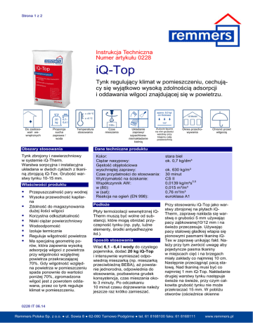 Strona 1 z 2 Instrukcja Techniczna Numer artykułu 0228 iQ-Top Tynk regulujący klimat w pomieszczeniu, cechujący się wyjątkowo wysoką zdolnością adsorpcji i oddawania wilgoci znajdującej się w powietrzu. Do zastosowań wewnętrznych Proporcja sucha zaprawa / woda Temperatura stosowania Obszary stosowania Tynk zbrojony i nawierzchniowy w systemie iQ-Therm. Warstwa sorpcyjna i instalacyjna układana w dwóch cyklach z tkaniną zbrojącą iQ-Tex. Grubość warstwy tynku 10-15 mm. Właściwości produktu Przepuszczalność pary wodnej Wysoka przewodność kapilarna Zdolność do magazynowania dużej ilości wilgoci Korzystna odkształcalność Niski ciężar powierzchniowy Wodoodporność Izoluje termicznie Reguluje wilgotność powietrza Ma specjalną geometrię porów, która zapewnia wysoką adsorpcję wilgoci z powietrza przy wilgotności względnej powietrza przekraczającej 70%. Gdy wilgotność względna powietrza w pomieszczeniu spada ponownie do wartości poniżej 70%, zgromadzona wilgoć jest z powrotem oddawana, przez co tynk reguluje klimat w pomieszczeniu. Czas mieszania Układanie zaprawy/ szpachlowanie/nakładanie kielnią Zużycie łączne na mm grubości warstwy przy klejeniu całą powierzchnią Okres przechowywania Chronić przed wilgocią Dane techniczne produktu Kolor: Ciężar nasypowy: Gęstość objętościowa wyschniętej zaprawy: Czas przydatności do stosowania: Wytrzymałość na ściskanie: Współczynnik AW: w (80): w (sat): Reakcja na ogień (EN 998): Podłoże Płyty termoizolacji wewnętrznej iQTherm muszą być wolne od substancji, które mogą obniżać przyczepność tynku (np. pyły, luźne elementy, środki antyadhezyjne itd.). Sposób stosowania Wlać 6,1 - 6,4 l wody do czystego pojemnika, dodać 20 kg iQ-Top i intensywnie wymieszać odpowiednią mieszarką (np. mieszarką przeciwbieżną BEBA), aż powstanie jednorodna, odpowiednia do stosowania, pozbawiona grudek konsystencja, czas mieszania około 3 minuty. Po odczekaniu 10 minut czasu dojrzewania należy jeszcze raz krótko zamieszać. stara biel ok. 0,7 kg/dm³ ok. 630 kg/m³ 30 minut CS II 0,5 0,0139 kg/m²s 0,015 m³/m³ 0,76 m³/m³ euroklasa A1 Przy stosowaniu iQ-Top jako warstwy zbrojonej na płytach iQTherm, zaprawę nakłada się warstwą o grubości 5 mm używając pacy ząbkowanej10/12 mm i na świeżo przeczesuje. Używając pacy stalowej gładkiej wtapia się pionowymi pasmami tkaninę iQTex w zaprawę unikając fałd. Należy przy tym zwrócić uwagę aby pojedyncze pasma tkaniny w miejscach cięć i na brzegach miały zakłady co najmniej 10 cm. Następnie przeciągnąć pacą stalową. Nad tkaniną musi być co najmniej 1 mm iQ-Top. Nakładanie drugiej warstwy tynku następuje świeże na świeże, przy czym całkowita grubość tynku nie może przekraczać 15 mm. W pobliżu otworów (ościeżnice okienne 0228 IT 06.14 Remmers Polska Sp. z o.o. ● ul. Sowia 8 ● 62-080 Tarnowo Podgórne ● tel. 61 8168100 faks: 61 8168111 www.remmers.pl Strona 2 z 2 i drzwiowe) należy dodatkowo wykonać zbrojenie ukośne, które leży nad zbrojeniem powierzchniowym. Należy zwrócić uwagę, aby pasma tkaniny szczelnie przylegały w pobliżu narożników otworów. Świeżo ułożony tynk iQ-Top natychmiast ściągnąć w jedną stronę zwilżoną łatą ząbkowaną a następnie w drugą stronę łatą aluminiową, pozostawiając szorstką powierzchnię. Po wystarczającym stężeniu przetrzeć powierzchnię pacą filcową. Nakładanie iQ-Fill może nastąpić najwcześniej po 24 godzinach. Wskazówki Stężałej zaprawy nie wolno ponownie zarabiać dodając wody lub świeżej zaprawy. Nie należy stosować w temperaturze poniżej +5°C i powyżej +30°C. Podane wskazówki czasowe odnoszą się do temperatury +20°C i wilgotności względnej powietrza 65%. Niższe temperatury wydłużają a wyższe skracają czasy przydatności do stosowania i wiązania zaprawy. Tynk należy chronić przed zbyt szybkim odparowaniem wody, przeciągami i obciążeniem termicznym, jeżeli to konieczne spryskiwać wodą. Powierzchnia tynku powinna być pozbawiona rys, rysy włoskowe/skurczowe nie mają znaczenia i nie mogą być uznane za wady ponieważ nie wpływają negatywnie na techniczną wartość tynku. Narzędzia, czyszczenie Mieszarka podwójna BEBA, paca stalowa, łata ząbkowana, łata aluminiowa, miotła, kielnia, paca filcowa. Narzędzia czyścić na świeżo wodą. Rodzaj opakowania, zużycie, składowanie Rodzaj opakowania: Worek papierowy 20 kg Zużycie suchej zaprawy: Ok. 6 kg/m² na każdy cm grubości Składowanie: W miejscu suchym, w zamkniętych opakowaniach – ok. 12 miesięcy. Bezpieczeństwo, ochrona środowiska, usuwanie Bliższe informacje na temat bezpieczeństwa w czasie transportu, przechowywania, stosowania produktu oraz jego usuwania i ochrony środowiska zawarte są w aktualnej karcie charakterystyki. _________________________________ Remmers Baustofftechnik GmbH Bernhard - Remmers - Str.13 D – 49624 Löningen 09 GBI P44 EN 998-1: 2010-12 iQ-Top Zaprawa przebadana pod kątem przydatności do stosowania, o gęstości objętościowej stwardniałej i wyschniętej zaprawy ≤ 1300 kg/m³ ________________________________ Reakcja na ogień: Wytrzymałość na odrywanie: Euroklasa A1 ≥ 0,08 N/mm² (przełom B) Nasiąkliwość: W0 Przepuszczalność pary wodnej: µ ≤ 12 Przewodność cieplna (λ10,dry): ≤ 0,11 W/(m*K) dla P=50% Trwałość: (odporność na mróz) Substancje niebezpieczne: Odporny pod warunkiem stosowania zgodnie z Instrukcją Techniczną NPD Powyższe wskazówki zostały zestawione w naszym dziale produkcji według najnowszego stanu wiedzy i techniki stosowania. Ponieważ rodzaje zastosowań i sposób użycia są poza naszą kontrolą, z treści tej instrukcji nie wynika żadna odpowiedzialność producenta. Wskazówki wykraczające poza zawartość tej instrukcji lub wskazówki różniące się od treści instrukcji wymagają pisemnego potwierdzenia przez zak