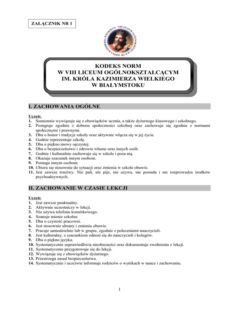 ZAŁĄCZNIK NR 1 KODEKS NORM W VIII LICEUM OGÓLNOKSZTAŁCĄCYM IM. KRÓLA KAZIMIERZA WIELKIEGO W BIAŁYMSTOKU I. ZACHOWANIA OGÓLNE Uczeń: 1. Sumiennie wywiązuje się z obowiązków ucznia, a także dyżurnego klasowego i szkolnego. 2. Postępuje zgodnie z dobrem społeczności szkolnej oraz zachowuje się zgodnie z normami społecznymi i prawnymi. 3. Dba o honor i tradycje szkoły oraz aktywnie włącza się w jej życie. 4. Godnie reprezentuje szkołę. 5. Dba o piękno mowy ojczystej. 6. Dba o bezpieczeństwo i zdrowie własne oraz innych osób. 7. Godnie i kulturalnie zachowuje się w szkole i poza nią. 8. Okazuje szacunek innym osobom. 9. Pomaga innym osobom. 10. Ubiera się stosownie do sytuacji oraz zmienia w szkole obuwie. 11. Jest zawsze trzeźwy. Nie pali, nie pije, nie używa, nie posiada i nie rozprowadza środków psychoaktywnych. II. ZACHOWANIE W CZASIE LEKCJI Uczeń: 1. Jest zawsze punktualny. 2. Aktywnie uczestniczy w lekcji. 3. Nie używa telefonu komórkowego. 4. Szanuje mienie szkolne. 5. Dba o czystość pracowni. 6. Jest stosownie ubrany i zmienia obuwie. 7. Pracuje samodzielnie lub w grupie, zgodnie z poleceniami nauczycieli. 8. Jest kulturalny, z szacunkiem odnosi się do nauczycieli i kolegów. 9. Dba o piękno języka. 10. Systematycznie usprawiedliwia nieobecności oraz dokumentuje zwolnienia z lekcji. 11. Systematycznie przygotowuje się do lekcji. 12. Wywiązuje się z obowiązków dyżurnego. 13. Przestrzega zasad bezpieczeństwa. 14. Systematycznie i uczciwie informuje rodziców o wynikach w nauce i zachowaniu. 1 III. ZACHOWANIE W CZASIE PRZERW Uczeń: 1. Jest trzeźwy i wolny od środków psychoaktywnych (nie pali papierosów i e-papierosów, nie pije alkoholu, nie używa i nie rozprowadza środków psychoaktywnych, nie posiada przy sobie żadnych z wyżej wymienionych środków). 2. Jest życzliwy w stosunku do innych osób, dba o bezpieczną i miłą atmosferę w szkole. 3. Przebywa na terenie szkoły i nie opuszcza go bez wiedzy i zgody wychowawcy/nauczyciela, dyrekcji lub pedagoga szkolnego. 4. Dba o czystość terenu szkoły oraz internatu szkolnego. 5. Dba o mienie szkolne oraz internatu szkolnego. 6. Nie wprowadza na teren szkoły osób spoza placówki. 7. Zachowuje się kulturalne oraz dba o kulturę języka. IV. ZACHOWANIE POZA SZKOŁĄ Uczeń: 1. Jest trzeźwy i wolny od środków psychoaktywnych. 2. Szanuje język polski. 3. Punktualnie rozpoczyna zajęcia pozaszkolne. 4. Z szacunkiem i życzliwością odnosi się do innych osób. 5. Godnie reprezentuje szkołę. 6. Szanuje mienie publiczne. 7. Ubiera się stosownie do sytuacji. 8. Przestrzega zasad dobrego wychowania, zachowuje się zgodnie z normami społecznymi i prawnymi. V. WYMAGANIA WZGLĘDEM NAUCZYCIELA Nauczyciel: 1. Zobowiązany jest postępować zgodnie z etyką zawodu. 2. Buduje relacje z uczniami i ich rodzicami, nauczycielami oraz innymi pracownikami szkoły, dbając o swój autorytet i dobry wizerunek szkoły. 3. Zobowiązany jest przestrzegać procedur Szkolnego Systemu Nagród i Konsekwencji. 4. Niezwłocznie wpisuje do dziennika elektronicznego informację o fakcie łamania przez ucznia/klasę norm wraz z datą zdarzenia. 5. Systematycznie wpisuje pozytywne uwagi o uczniach (ich osiągnięciach, udziale w pracach na rzecz szkoły, itp.). 6. Wychowawca odnotowuje w dzienniku elektronicznym podejmowane wobec ucznia i jego rodziców działania, zgodnie ze Szkolnym Systemem Nagród i Konsekwencji. 7. Na bieżąco uzupełnia dziennik elektroniczny oraz przesyła Dyrekcji Szkoły cotygodniowy raport. 8. Ocenia zgodnie z Wewnątrzszkolnym i Przedmiotowym Systemem Oceniania. 9. Zwalnia ucznia z lekcji za zgodą wychowawcy lub Dyrektora Szkoły, w nagłych przypadkach (np. choroba lub zdarzenie losowe) według zalecenia pielęgniarki szkolnej, po czym przekazuje informację o fakcie wychowawcy. 10. Wychowawca usprawiedliwia nieobecności uczniów zgodnie z procedurami dotyczącymi monitorowania frekwencji. 11. Wychowawca systematycznie kontaktuje się z rodzicami/opiekunami prawnymi uczniów. 12. Aktywnie uczestniczy w pracach zespołu wychowawczego oraz przedmiotowego. 2 VI. OCZEKIWANIA WZGLĘDEM RODZICÓW/OPIEKUNÓW PRAWNYCH Rodzic/opiekun prawny: 1. Dba, by jego dziecko realizowało obowiązek nauki. 2. Regularnie usprawiedliwia nieobecności dziecka w ciągu dwóch tygodni, podając ich powody oraz dokładne daty, a w przypadku pojedynczych absencji - konkretną godzinę lekcyjną. 3. Niezwłocznie informuje wychowawcę o nieobecności dłuższej niż 5 dni (np. pobyt w szpitalu, wypadek losowy). 4. Wcześniej powiadamia wychowawcę o zwolnieniu dziecka z lekcji (osobiście, pisemnie, poprzez dziennik elektroniczny lub telefonicznie). 5. Uczestniczy we wszystkich wywiadówkach oraz niezwłocznie przychodzi do szkoły na prośbę wychowawcy, pedagoga szkolnego lub Dyrekcji. 6. Przekazuje wychowawcy/pedagogowi szkolnemu wszelkie istotne informacje, które mogą wpływać na funkcjonowanie dziecka w szkole. 7. Współpracuje z wychowawcą, pedagogiem szkolnym oraz powołanym przez Dyrekcję zespołem wychowawczym w sytuacji, gdy uczeń nie przestrzega norm szkolnych, zagrożony jest narkomanią, demoralizacją lub przestępczością. VII. SZKOLNY SYSTEM KONSEKWENCJI (SzSK) W przypadku nieprzestrzegania przez ucznia zasad obowiązujących w szkole stosuje się wobec niego następujące stopniowane konsekwencje: 1. Rozmowa wychowawcy z uczniem na temat jego zachowania, udzielenie uczniowi ustnego upomnienia. 2. Upomnienie wychowawcy na forum klasy. 3. Rozmowa wychowawcy i pedagoga szkolnego z uczniem (z wpisem do dziennika). Ocena zachowania: dobre. 4. Pisemna nagana wychowawcy z adnotacją w dzienniku elektronicznym i z pisemną informacją przekazaną rodzicom/opiekunom prawnym. 5. Spotkanie ucznia oraz jego rodziców/opiekunów prawnych z wychowawcą i pedagogiem szkolnym. Rozmowa wychowawcza o konsekwencjach dalszego nieprzestrzegania norm, z wpisem do dziennika i podpisaniem kontr