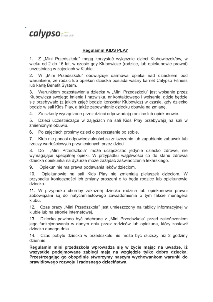 Regulamin KIDS PLAY 1. Z „Mini Przedszkola” mogą korzystać wyłącznie dzieci Klubowiczek/ów, w wieku od 2 do 16 lat, w czasie gdy Klubowicze (rodzice, lub opiekunowie prawni) uczestniczą w zajęciach w Klubie. 2. W „Mini Przedszkolu” obowiązuje darmowa opieka nad dzieckiem pod warunkiem, że rodzic lub opiekun dziecka posiada ważny karnet Calypso Fitness lub kartę Benefit System. 3. Warunkiem pozostawienia dziecka w „Mini Przedszkolu” jest wpisanie przez Klubowicza swojego imienia i nazwiska, nr kontaktowego i wpisanie, gdzie będzie się przebywało (z jakich zajęć będzie korzystał Klubowicz) w czasie, gdy dziecko będzie w sali Kids Play, a także zapewnienie dziecku obuwia na zmianę. 4. Za szkody wyrządzone przez dzieci odpowiadają rodzice lub opiekunowie. 5. Dzieci uczestniczące w zajęciach na sali Kids Play przebywają na sali w zmienionym obuwiu. 6. Po zajęciach prosimy dzieci o posprzątanie po sobie. 7. Klub nie ponosi odpowiedzialności za zniszczenie lub zagubienie zabawek lub rzeczy wartościowych przyniesionych przez dzieci. 8. Do „Mini Przedszkola” może uczęszczać jedynie dziecko zdrowe, nie wymagające specjalnej opieki. W przypadku wątpliwości co do stanu zdrowia dziecka opiekunka na dyżurze może zażądać zaświadczenia lekarskiego. 9. Opiekun nie ma prawa podawania leków dzieciom. 10. Opiekunowie na sali Kids Play nie zmieniają pieluszek dzieciom. W przypadku konieczności ich zmiany proszeni o to będą rodzice lub opiekunowie dziecka. 11. W przypadku choroby zakaźnej dziecka rodzice lub opiekunowie prawni zobowiązani są do natychmiastowego zawiadomienia o tym fakcie menagera klubu. 12. Czas pracy „Mini Przedszkola” jest umieszczony na tablicy informacyjnej w klubie lub na stronie internetowej. 13. Dziecko powinno być odebrane z „Mini Przedszkola” przed zakończeniem jego funkcjonowania w danym dniu przez rodziców lub opiekuna, który zostawił dziecko danego dnia. 14. Czas pobytu dziecka w przedszkolu nie może być dłuższy niż 2 godziny dziennie. Regulamin mini przedszkola wprowadza się w życie mając na uwadze, iż wszystkie podejmowane zabiegi mają na względzie tylko dobro dziecka. Przestrzegając go obopólnie stworzymy naszym wychowankom warunki do prawidłowego rozwoju i radosnego dzieciństwa.