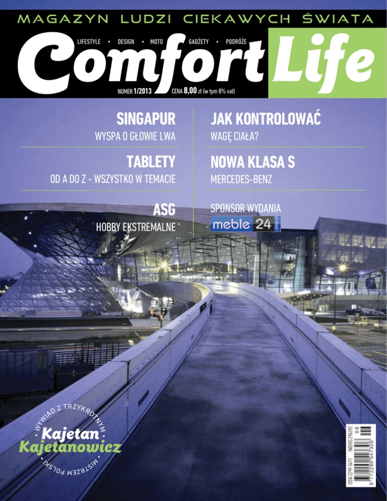 omfort Life C Magazyn Lifestyle • ludzi design ciekawych • moto Numer 1/2013 • gadżety • świata podróże Cena 8,00 zł (w tym 8% vat) Singapur wyspa o głowie lwa Tablety od A do Z - wszystko w temacie ASG Jak kontrolować wagę ciała? Nowa klasa s Mercedes-benz Sponsor wydania Z TRZYKRO •M IS I• • Indeks 296392 YM • WY Kajetan Kajetanowicz ISSn 2299-5471 D IA TN W hobby ekstremalne TR ZEM POLS K adresy Comfort Life Dziękujemy za współpracę firmom: Apart Sp. z o.o. Formacja "SZERSZEŃ" www.kajto.pl ul. Stara Droga 3 ul. Plac Wolności 12 62-002 Suchy Las k. Poznania 21 – 500 Biała Podlaska www.apart.pl www.asg-szerszen Biuro Podróży SPECIAL TRIPS Havas PR 08-110 Siedlce ul. Marynarska 11, Warszawa 02-674 www.polmos-siedlce.com.pl ul. Zamkowa 21A/6 www.havaspr.pl Podlaska Wytwórnia Wódek S.A. ul. Kolejowa 10 Mercedes-Benz Polska Salon Łóżka Prawdziwe Sp. z o.o. ul. Gottlieba Daimlera 1, 02-460 Warszawa ul. Sportowa 1 De`Longhi Polska Sp. zo.o. www.media.daimler.com 05-075 Warszawa-Wesoła Ursynów Buisness Park ul. Puławska 303 Partner of Promotion Sp. z o.o. 02-785 Warszawa ul. Belgradzka 8 lok. 01 www.delonghi.com 02-793 Warszawa 83-110 Tczew www.specialtrips.pl www.realbeds.pl www.partnersi.com.pl REKLAMA 122