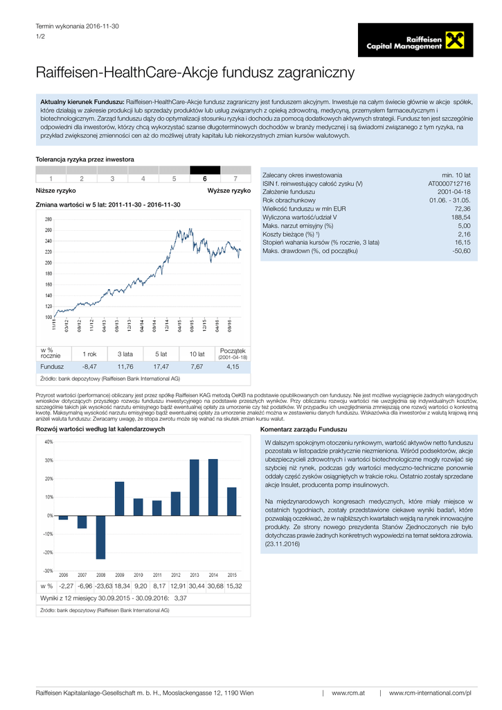 Termin wykonania 2016-11-30 1/2 Raiffeisen-HealthCare-Akcje fundusz zagraniczny Aktualny kierunek Funduszu: Raiffeisen-HealthCare-Akcje fundusz zagraniczny jest funduszem akcyjnym. Inwestuje na całym świecie głównie w akcje spółek, które działają w zakresie produkcji lub sprzedaży produktów lub usług związanych z opieką zdrowotną, medycyną, przemysłem farmaceutycznym i biotechnologicznym. Zarząd funduszu dąży do optymalizacji stosunku ryzyka i dochodu za pomocą dodatkowych aktywnych strategii. Fundusz ten jest szczególnie odpowiedni dla inwestorów, którzy chcą wykorzystać szanse długoterminowych dochodów w branży medycznej i są świadomi związanego z tym ryzyka, na przykład zwiększonej zmienności cen aż do możliwej utraty kapitału lub niekorzystnych zmian kursów walutowych. Tolerancja ryzyka przez inwestora Niższe ryzyko Wyższe ryzyko Zmiana wartości w 5 lat: 2011-11-30 - 2016-11-30 w% rocznie 1 rok 3 lata 5 lat 10 lat (2001-04-18) Fundusz -8,47 11,76 17,47 7,67 4,15 Zalecany okres inwestowania ISIN f. reinwestujący całość zysku (V) Założenie funduszu Rok obrachunkowy Wielkość funduszu w mln EUR Wyliczona wartość/udział V Maks. narzut emisyjny (%) Koszty bieżące (%) ¹) Stopień wahania kursów (% rocznie, 3 lata) Maks. drawdown (%, od początku) min. 10 lat AT0000712716 2001-04-18 01.06. - 31.05. 72,36 188,54 5,00 2,16 16,15 -50,60 Początek Żródło: bank depozytowy (Raiffeisen Bank International AG) Przyrost wartości (performance) obliczany jest przez spółkę Raiffeisen KAG metodą OeKB na podstawie opublikowanych cen funduszy. Nie jest możliwe wyciągnięcie żadnych wiarygodnych wniosków dotyczących przyszłego rozwoju funduszu inwestycyjnego na podstawie przeszłych wyników. Przy obliczaniu rozwoju wartości nie uwzględnia się indywidualnych kosztów, szczególnie takich jak wysokość narzutu emisyjnego bądź ewentualnej opłaty za umorzenie czy też podatków. W przypadku ich uwzględnienia zmniejszają one rozwój wartości o konkretną kwotę. Maksymalną wysokość narzutu emisyjnego bądź ewentualnej opłaty za umorzenie znaleźć można w zestawieniu danych funduszu. Wskazówka dla inwestorów z walutą krajową inną aniżeli waluta funduszu: Zwracamy uwagę, że stopa zwrotu może się wahać na skutek zmian kursu walut. Rozwój wartości według lat kalendarzowych Komentarz zarządu Funduszu W dalszym spokojnym otoczeniu rynkowym, wartość aktywów netto funduszu pozostała w listopadzie praktycznie niezmieniona. Wśród podsektorów, akcje ubezpieczycieli zdrowotnych i wartości biotechnologiczne mogły rozwijać się szybciej niż rynek, podczas gdy wartości medyczno-techniczne ponownie oddały część zysków osiągniętych w trakcie roku. Ostatnio zostały sprzedane akcje Insulet, producenta pomp insulinowych. Na międzynarodowych kongresach medycznych, które miały miejsce w ostatnich tygodniach, zostały przedstawione ciekawe wyniki badań, które pozwalają oczekiwać, że w najbliższych kwartałach wejdą na rynek innowacyjne produkty. Ze strony nowego prezydenta Stanów Zjednoczonych nie było dotychczas prawie żadnych konkretnych wypowiedzi na temat sektora zdrowia. (23.11.2016) w % -2,27 -6,96 -23,63 18,34 9,20 8,17 12,91 30,44 30,68 15,32 Wyniki z 12 miesięcy 30.09.2015 - 30.09.2016: 3,37 Żródło: bank depozytowy (Raiffeisen Bank International AG) Raiffeisen Kapitalanlage-Gesellschaft m. b. H., Mooslackengasse 12, 1190 Wien | www.rcm.at | www.rcm-international.com/pl Termin wykonania 2016-11-30 2/2 Raiffeisen-HealthCare-Akcje fundusz zagraniczny Struktura funduszy według regionów Struktura funduszu wg walut papierów wartościowych Największe pozycje akcji Pfizer Inc 6,26% UnitedHealth Group Inc 4,92% Roche Holding AG 4,45% Johnson & Johnson 4,34% Merck & Co Inc 3,88% Gilead Sciences Inc 3,81% AbbVie Inc 3,45% Amgen Inc 3,30% Novartis AG 2,97% Sanofi 2,85% Struktura pap. wartościowych wg kraju siedziby ¹) Wykazane w tym miejscu koszty są kosztami szacunkowymi, gdyż w porównaniu z analizą historyczną dają one bardziej wiarygodny obraz rozwoju wartości kosztów w przyszłości. Szacunkowe „Koszty bieżące“ zawierają wynagrodzenie administracyjne i wszystkie opłaty. Koszty transakcji zagranicznych i opłaty uzależnione od powodzenia nie są częścią „opłat bieżących”. „Koszty bieżące“ mogą być każdego roku różne. Roczne sprawozdanie funduszu za każdy rok obrachunkowy zawiera szczegóły dotyczące dokładnej wysokości obliczonych kosztów (podpunkt „Koszty”). W ramach strategii inwestycyjnej możliwe są inwestycje głównie w instrumenty pochodne (z uwzględnie-niem związanego z tym ryzyka). Fundusz wykazuje większą zmienność, tj. wartości udziałów ulegają dużym wahaniom w górę i w dół w krótkich okresach, przy czym nie można wykluczyć również strat kapitałowych. Jest to komunikat marketingowy. Wszystkie dane i informacje zostały zestawione i sprawdzone z największą starannością, a także z wykorzystaniem wiarygodnych źródeł. Niniejsze informacje są aktualne na dzień sporządzania aktualizacji. Nie ponosi się odpowiedzialności ani nie gwarantuje poprawności i kompletności informacji. Opublikowane prospekty lub informacje dla inwestorów zgodnie z § 21 ustawy zarządzających alternatywnymi funduszami inwestycyjnymi (AIFMG) oraz dokumenty informacyjne dla klienta (kluczowe informacje dla inwestorów) funduszy Raiffeisen Investment-Gesellschaft mbH, zatwierdzonych do dystrybucji w Polsce, są dostępne pod adresem www.rcm-international.com/pl, a także w siedzibie Raiffeisen Bank Polska S.A., ul. Piękna 20, 00-549 Warszawa, w języku angielskim i polskim. Raiffeisen Kapitalanlage-Gesellschaft m. b. H., Mooslackengasse 12, 1190 Wien | www.rcm.at | www.rcm-international.com/pl