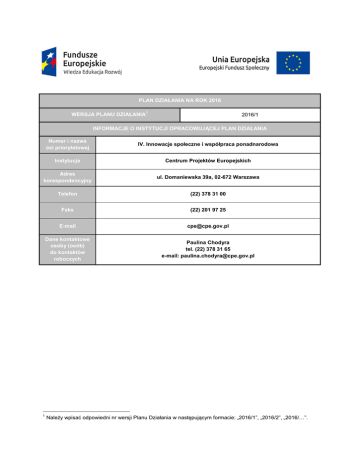 PLAN DZIAŁANIA NA ROK 2016 WERSJA PLANU DZIAŁANIA 1 2016/1 INFORMACJE O INSTYTUCJI OPRACOWUJĄCEJ PLAN DZIAŁANIA Numer i nazwa osi priorytetowej IV. Innowacje społeczne i współpraca ponadnarodowa Instytucja Centrum Projektów Europejskich Adres korespondencyjny ul. Domaniewska 39a, 02-672 Warszawa Telefon (22) 378 31 00 Faks (22) 201 97 25 E-mail [email protected] Dane kontaktowe osoby (osób) do kontaktów roboczych Paulina Chodyra tel. (22) 378 31 65 e-mail: [email protected] 1 Należy wpisać odpowiedni nr wersji Planu Działania w następującym formacie: „2016/1”, „2016/2”, „2016/…”. 4.3 Współpraca ponadnarodowa DZIAŁANIE/PODDZIAŁANIE PO WER FISZKA KONKURSU PODSTAWOWE INFORMACJE O KONKURSIE Wdrożenie nowych rozwiązań, w szczególności z zakresu aktywizacji zawodowej, kształcenia przez całe życie i tworzenia oraz realizacji polityk publicznych, dzięki współpracy z partnerami zagranicznymi. Cel szczegółowy PO WER, w ramach którego realizowane będą 2 projekty Tematy konkursu: 1. Promowanie trwałego i wysokiej jakości zatrudnienia oraz wsparcie mobilności pracowników. 2. Wspieranie włączenia społecznego i walka z ubóstwem. 3. Inwestowanie w edukację, umiejętności i uczenie się przez całe życie. 4. Wzmacnianie publicznej. potencjału instytucjonalnego i skuteczności administracji Wszystkie priorytety inwestycyjne określone w celach tematycznych 8 - 11. Priorytet inwestycyjny Lp. konkursu 3 Planowany miesiąc rozpoczęcia naboru wniosków o 3 dofinansowanie 1 Planowany kwartał ogłoszenia konkursu 2 3 4 I x II 5 6 7 III 8 9 IV 10 11 12 X Czy w ramach konkursu będą wybierane projekty grantowe? TAK Planowana alokacja (PLN) NIE X 20 000 000, 00 PLN Wymagany wkład własny beneficjenta TAK X NIE Minimalny udział wkładu własnego w finansowaniu wydatków kwalifikowalnych projektu 3% W przypadku konkursów na projekty koncepcyjne w wierszu Cel szczegółowy, w ramach którego realizowane będą projekty należy opisać również zasadnicze założenia interwencji publicznej, której wsparcie zaplanowano poprzez realizację projektów, które mają zostać wybrane w ramach konkursu. W przypadku konkursów na projekty innowacyjne i współpracy ponadnarodowej w wierszu Cel szczegółowy, w ramach którego realizowane będą projekty należy uwzględnić również temat/tematy, w ramach których projekty będą wybierane. 2 3 Zaznaczyć właściwe pole z nr. miesiąca znakiem „X”, uwzględniając fakt, że zgodnie z art. 47 ust. 3 ustawy z dnia 11 lipca 2014 r. o zasadach realizacji programów w zakresie polityki spójności finansowanych w perspektywie finansowej 2014–2020 (Dz. U. poz. 1146, z późn. zm.) aktualizacja harmonogramu naborów wniosków o dofinansowanie nie może dotyczyć naboru, którego przeprowadzenie zaplanowano w terminie nie dłuższym niż 3 miesiące, licząc od dnia aktualizacji. Natomiast zgodnie z podrozdziałem 7.2 pkt 6 Wytycznych w zakresie trybu wyboru projektów na lata 2014-2020 dniem aktualizacji harmonogramu jest dzień jego publikacji na stronie internetowej IZ PO WER oraz na portalu internetowym, o którym mowa w art. 115 ust. 1 lit. b rozporządzenia ogólnego. 2 Typ/typy projektów przewidziane do realizacji w ramach konkursu 1. Rozszerzenie standardowych projektów (realizowanych również w ramach regionalnych programów operacyjnych) o komponent ponadnarodowy. ZAKŁADANE EFEKTY KONKURSU WYRAŻONE WSKAŹNIKAMI (W PODZIALE NA PŁEĆ I OGÓŁEM) WSKAŹNIKI REZULTATU Wartość docelowa wskaźnika 4 Nazwa wskaźnika W podziale na : Ogółem w konkursie Kobiety Mężczyzn 1. Liczba instytucji, które wdrożyły nowe rozwiązania dzięki współpracy z partnerem zagranicznym. 13 WSKAŹNIKI PRODUKTU Wartość docelowa wskaźnika 5 Nazwa wskaźnika W podziale na : Ogółem w konkursie Kobiety Mężczyzn 1. Liczba instytucji, które podjęły współpracę z partnerem zagranicznym w programie. 15 SZCZEGÓŁOWE KRYTERIA WYBORU PROJEKTÓW KRYTERIA WARUNKUJĄCE (dotyczy konkursów z etapem preselekcji) nd. Uzasadnienie: KRYTERIA DOSTĘPU 1. 6 Wnioskodawca podpisał umowę o dofinansowanie projektu standardowego , realizowanego w zakresie celów tematycznych 8-11, współfinansowanego z Europejskiego Funduszu Społecznego, w ramach Programu Operacyjnego Wiedza Edukacja Rozwój lub Regionalnego Programu Operacyjnego, w perspektywie finansowej 2014-2020. Rozbicie wartości docelowych na płeć jest nieobowiązkowe – wypełniane w zależności od specyfiki wsparcia, typu projektów przewidzianych do realizacji w ramach konkursu oraz zidentyfikowanego problemu, który projekty mają rozwiązać lub złagodzić. 4 5 Rozbicie wartości docelowych na płeć jest nieobowiązkowe – wypełniane w zależności od specyfiki wsparcia, typu projektów przewidzianych do realizacji w ramach konkursu oraz zidentyfikowanego problemu, który projekty mają rozwiązać lub złagodzić. 6 W przypadku państwowych jednostek budżetowych - porozumienie o dofinansowanie projektu standardowego. 3 Specyfika typu projektu przewidzianego do realizacji w ramach niniejszego konkursu, tj. rozszerzenia projektu standardowego o komponent ponadnarodowy polega na realizacji współpracy ponadnarodowej w odniesieniu do projektu standardowego. W związku z powyższym niezbędne jest, aby przed złożeniem wniosku o dofinansowanie w ramach niniejszego konkursu, wnioskodawca miał już podpisaną umowę o dofinansowanie projektu standardowego. Uzasadnienie: W celu umożliwienia realizacji rozszerzeń o komponent ponadnarodowy jak najszerszemu gronu beneficjentów projektów standardowych, tematy w niniejszym konkursie obejmują pełne spektrum obszarowe przewidziane w celach tematycznych 8 -11. Uwzględnienie regionalnych programów operacyjnych wynika z założeń programowych. Stosuje się do tematu/tematów (nr) 1- 4 Dodatkowo, Beneficjent zobowiązany jest do wpisania w treści wniosku, w ramach którego priorytetu inwestycyjnego skła