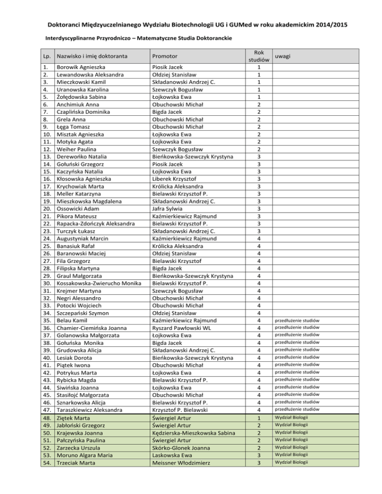 Doktoranci Międzyuczelnianego Wydziału Biotechnologii UG i GUMed w roku akademickim 2014/2015 Interdyscyplinarne Przyrodniczo – Matematyczne Studia Doktoranckie Lp. Nazwisko i imię doktoranta Promotor 1. 2. 3. 4. 5. 6. 7. 8. 9. 10. 11. 12. 13. 14. 15. 16. 17. 18. 19. 20. 21. 22. 23. 24. 25. 26. 27. 28. 29. 30. 31. 32. 33. 34. 35. 36. 37. 38. 39. 40. 41. 42. 43. 44. 45. 46. 47. 48. 49. 50. 51. 52. 53. 54. Piosik Jacek Ołdziej Stanisław Składanowski Andrzej C. Szewczyk Bogusław Łojkowska Ewa Obuchowski Michał Bigda Jacek Obuchowski Michał Obuchowski Michał Łojkowska Ewa Łojkowska Ewa Szewczyk Bogusław Bieńkowska-Szewczyk Krystyna Piosik Jacek Łojkowska Ewa Liberek Krzysztof Królicka Aleksandra Bielawski Krzysztof P. Składanowski Andrzej C. Jafra Sylwia Kaźmierkiewicz Rajmund Bielawski Krzysztof P. Składanowski Andrzej C. Kaźmierkiewicz Rajmund Królicka Aleksandra Ołdziej Stanisław Bielawski Krzysztof Bigda Jacek Bieńkowska-Szewczyk Krystyna Bielawski Krzysztof P. Szewczyk Bogusław Obuchowski Michał Obuchowski Michał Ołdziej Stanisław Kaźmierkiewicz Rajmund Ryszard Pawłowski WL Łojkowska Ewa Bigda Jacek Składanowski Andrzej C. Bieńkowska-Szewczyk Krystyna Obuchowski Michał Łojkowska Ewa Bielawski Krzysztof P. Łojkowska Ewa Obuchowski Michał Bielawski Krzysztof P. Krzysztof P. Bielawski Świergiel Artur Świergiel Artur Kędzierska-Mieszkowska Sabina Świergiel Artur Skórko-Glonek Joanna Laskowska Ewa Meissner Włodzimierz Borowik Agnieszka Lewandowska Aleksandra Mieczkowski Kamil Uranowska Karolina Żołędowska Sabina Anchimiuk Anna Czaplińska Dominika Grela Anna Łęga Tomasz Misztak Agnieszka Motyka Agata Weiher Paulina Derewońko Natalia Gołuński Grzegorz Kaczyńska Natalia Kłosowska Agnieszka Krychowiak Marta Meller Katarzyna Mieszkowska Magdalena Ossowicki Adam Pikora Mateusz Rapacka-Zdończyk Aleksandra Turczyk Łukasz Augustyniak Marcin Banasiuk Rafał Baranowski Maciej Fila Grzegorz Filipska Martyna Graul Małgorzata Kossakowska-Zwierucho Monika Krejmer Martyna Negri Alessandro Potocki Wojciech Szczepański Szymon Belau Kamil Chamier-Ciemińska Joanna Golanowska Małgorzata Gołuńska Monika Grudowska Alicja Lesiak Dorota Piątek Iwona Potrykus Marta Rybicka Magda Siwińska Joanna Stasiłojć Małgorzata Sznarkowska Alicja Taraszkiewicz Aleksandra Ziętek Marta Jabłoński Grzegorz Krajewska Joanna Pałczyńska Paulina Zarzecka Urszula Moruno Algara Maria Trzeciak Marta Rok studiów 1 1 1 1 1 2 2 2 2 2 2 2 3 3 3 3 3 3 3 3 3 3 3 4 4 4 4 4 4 4 4 4 4 4 4 4 4 4 4 4 4 4 4 4 4 4 4 1 2 2 2 2 3 3 uwagi przedłużenie studiów przedłużenie studiów przedłużenie studiów przedłużenie studiów przedłużenie studiów przedłużenie studiów przedłużenie studiów przedłużenie studiów przedłużenie studiów przedłużenie studiów przedłużenie studiów przedłużenie studiów przedłużenie studiów Wydział Biologii Wydział Biologii Wydział Biologii Wydział Biologii Wydział Biologii Wydział Biologii Wydział Biologii Lp. Nazwisko i imię doktoranta Promotor 55. 56. 57. 58. 59. 60. 61. 62. 63. 64. 65. 66. Węgrzyn Grzegorz Lipińska Barbara Meissner Włodzimierz Gabig-Ciminska Magdalena Laskowska Ewa Skórko-Glonek Joanna Rodziewicz-Motowidło Sylwia Kasprzykowski Franciszek Rodziewicz-Motowidło Sylwia Stepnowski Piotr Skowron Piotr Mucha Piotr Wosinski Anna Glaza Przemysław Fischer Izabela Konieczna Aleksandra Leszczyńska Daria Koper Tomasz Prądzińska Martyna Rosecka Joanna Behrendt Izabela Borecka Marta Żebrowska Joanna Dobkowski Michał Rok studiów 3 4 4 4 4 4 3 3 4 4 4 4 67. Rok Karolina Kubicki Aleksander 4 68. Glińska Anna Kubicki Aleksander 4 69. Sabisz Agnieszka Kwela Jerzy 4 uwagi Wydział Biologii Wydział Biologii Wydział Biologii, przedłużenie studiów Wydział Biologii, przedłużenie studiów Wydział Biologii, przedłużenie studiów Wydział Biologii ,przedłużenie studiów Wydział Chemii Wydział Chemii Wydział Chemii Wydział Chemii Wydział Chemii Wydział Chemii, przedłużenie studiów Wydział Matematyki, Fizyki i Informatyki Wydział Matematyki, Fizyki i Informatyki, przedłużenie studiów Wydział Matematyki, Fizyki i Informatyki, przedłużenie studiów Studia Doktoranckie Chemii i Biochemii Lp. Nazwisko i imię doktoranta Promotor 1. 2. 3. 4. 5. 6. 7. 8. 9. 10. 11. 12. 13. 14. 15. 16. 17. 18. 19. 20. 21. 22. 23. 24. 25. 26. 27. 28. 29. 30. 31. Liberek Krzysztof Banecki Bogda Jafra Sylwia Banecki Bogda Banecki Bogda Marszałek Jarosław Marszałek Jarosław Bieńkowska-Szewczyk Krystyna Konieczny Igor Liberek Krzysztof Banaś Antoni Konieczny Igor Banaś Antoni Konieczny Igor Konieczny Igor Bielawski Krzysztof P. Kaźmierkiewicz Rajmund Marszałek Jarosław Liberek Krzysztof Ołdziej Stanisław Szewczyk Bogusław MWB Kaźmierkiewicz Rajmund Jafra Sylwia Marszałek Jarosław Bigda Jacek Bieńkowska-Szewczyk Krystyna Marszałek Jarosław Myśliwska Jolanta - WL Konieczny Igor Bieńkowska-Szewczyk Krystyna Liberek Krzysztof Chamera Tomasz Gawron Grzegorz Jabłońska Magdalena Werner Paulina Żerek Bartłomiej Błenska Anna Delewski Wojciech Grabowska Kinga Gross Marta Piróg Artur Demski Kamil Dubiel Andrzej Głąb Bartosz Ropelewska Małgorzata Karłowicz Anna Kostecka Anna Makarewicz Tomasz Manicki Mateusz Gumowski Krzysztof Hałabis Anna Hoffmann Weronika Jankowska Dominika Krzyżanowska Dorota Majewska Julia Markiewicz Aleksandra Panasiuk Mirosława Rogaczewski Michał Skrzypkowska Maria Zabrocka Elżbieta Zimmer Karolina Żwirowski Szymon Rok studiów 1 1 1 1 1 2 2 2 2 2 3 3 3 3 4 4 4 4 4 4 4 4 4 4 4 4 4 4 4 4 4 uwagi przedłużenie studiów przedłużenie studiów przedłużenie studiów przedłużenie studiów przedłużenie studiów przedłużenie studiów przedłużenie studiów przedłużenie studiów przedłużenie studiów przedłużenie studiów przedłużenie studiów przedłużenie studiów przedłużenie studiów
