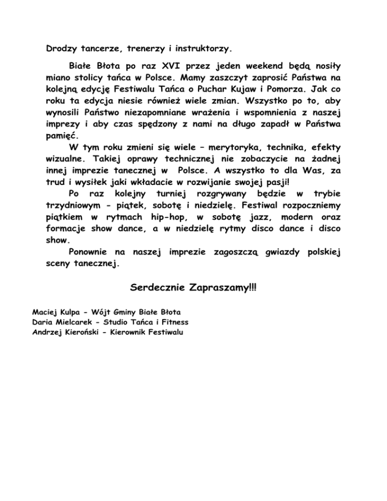 Drodzy tancerze, trenerzy i instruktorzy. Białe Błota po raz XVI przez jeden weekend będą nosiły miano stolicy tańca w Polsce. Mamy zaszczyt zaprosić Państwa na kolejną edycję Festiwalu Tańca o Puchar Kujaw i Pomorza. Jak co roku ta edycja niesie również wiele zmian. Wszystko po to, aby wynosili Państwo niezapomniane wrażenia i wspomnienia z naszej imprezy i aby czas spędzony z nami na długo zapadł w Państwa pamięć. W tym roku zmieni się wiele – merytoryka, technika, efekty wizualne. Takiej oprawy technicznej nie zobaczycie na żadnej innej imprezie tanecznej w Polsce. A wszystko to dla Was, za trud i wysiłek jaki wkładacie w rozwijanie swojej pasji! Po raz kolejny turniej rozgrywany będzie w trybie trzydniowym - piątek, sobotę i niedzielę. Festiwal rozpoczniemy piątkiem w rytmach hip-hop, w sobotę jazz, modern oraz formacje show dance, a w niedzielę rytmy disco dance i disco show. Ponownie na naszej imprezie zagoszczą gwiazdy polskiej sceny tanecznej. Serdecznie Zapraszamy!!! Maciej Kulpa - Wójt Gminy Białe Błota Daria Mielcarek - Studio Tańca i Fitness Andrzej Kieroński - Kierownik Festiwalu XVI OGÓLNOPOLSKI FESTIWAL TAŃCA "O PUCHAR KUJAW I POMORZA" Studio Tańca i Fitness - Daria Mielcarek Białe Błota 27,28,29 marca 2015r. Honorowy patronat festiwalu Wójt Gminy Białe Błota Maciej Kulpa Termin i miejsce: 27,28,29 marca 2015r. (piątek, sobota, niedziela) godz. 10:00 sala gimnastyczna Publicznego Gimnazjum im. Mariana Rejewskiego ul. Czysta 1A, 86-005 Białe Błota. 27.03.2015r. – hip-hop, 28.03.2015r. – jazz, modern, show dance 29.03.2015r. – disco dance, disco show, inne formy tańca Organizator: Studio Tańca i Fitness - Daria Mielcarek Andrzej Kieroński – Zespół Tańca Nowoczesnego OL-TOM PLAN FESTIWALU 27.03.2015r. – Piątek Godz. 10:00 – otwarcie pierwszego dnia festiwalu Godz. 10:15 – rozpoczęcie zmagań tanecznych Po kategoriach solowych i duetach nastąpi wręczenie nagród. Po rozdaniu nagród za pierwszą część turnieju i przerwie zostaną rozegrane pozostałe kategorie. 5. Zakończenie pierwszego dnia festiwalu, rozdanie nagród. 1. 2. 3. 4. Solo hip-hop do lat 11,12-15 lat i powyżej 15 lat We wszystkich rundach muzyka organizatora, Czas prezentacji 1 min. (eliminacje grupowe, finały indywidualne), W rundach eliminacyjnych zabronione jest wykonywanie akrobatycznych. figur Duety hip-hop do lat 11, 12-15 lat i powyżej 15 lat We wszystkich rundach muzyka organizatora, Czas prezentacji 1.00 min., O przynależności do kategorii wiekowej decyduje wiek starszego z partnerów, W rundach eliminacyjnych zabronione jest wykonywanie figur akrobatycznych. Mini formacje hip-hop do lat 11, 12-15 lat i powyżej 15 lat Ilość tancerzy 3-7 osób, Muzyka własna wyłącznie na CD lub pendrive, (zaleca się posiadanie nagrania zastępczego) Czas prezentacji do 2 min. Formacje hip-hop do lat 11, 12-15 lat i powyżej 15 lat Ilość tancerzy 8 -24 osób, Muzyka własna wyłącznie na CD lub pendrive, (zaleca się posiadanie nagrania zastępczego) Czas prezentacji do 4 min. 28.03.2015r. – Sobota Godz. 10:00 – otwarcie drugiego dnia festiwalu Godz. 10:15 – rozpoczęcie zmagań tanecznych Wręczenie nagród po pierwszej części turnieju, przerwa. Po rozdaniu nagród za pierwszą część turnieju i przerwie zostaną rozegrane pozostałe kategorie. 5. Zakończenie drugiego dnia festiwalu, rozdanie nagród. 1. 2. 3. 4. Solo jazz do lat 11, 12-15 lat i powyżej 15 lat We wszystkich rundach muzyka własna, Czas prezentacji do 2 min. (w przypadku dużej ilości uczestników organizator zastrzega sobie prawo do skrócenia czasu prezentacji w eliminacjach do 1 min.), Muzyka własna wyłącznie na CD lub pendrive. (zaleca się posiadanie nagrania zastępczego) Duety jazz do lat 11, 12-15 lat i powyżej 15 lat We wszystkich rundach muzyka własna, Czas prezentacji do 2,5 min. (w przypadku dużej ilości uczestników organizator zastrzega sobie prawo do skrócenia czasu prezentacji w eliminacjach do 1 min.), Muzyka własna wyłącznie na CD lub pendrive, (zaleca się posiadanie nagrania zastępczego) O przynależności do kategorii wiekowej decyduje wiek starszego z partnerów. Mini formacje jazz do lat 11, 12-15 lat i powyżej 15 lat We wszystkich rundach muzyka własna, Czas prezentacji do 3 min., Muzyka własna wyłącznie na CD lub pendrive. (zaleca się posiadanie nagrania zastępczego) Formacje jazz do lat 11, 12-15 lat i powyżej 15 lat We wszystkich rundach muzyka własna, Czas prezentacji do 4 min., Muzyka własna wyłącznie na CD lub pendrive. (zaleca się posiadanie nagrania zastępczego) Solo modern do lat 11, 12-15 lat i powyżej 15 lat We wszystkich rundach muzyka własna, Czas prezentacji do 2 min., (w przypadku dużej ilości uczestników organizator zastrzega sobie prawo do skrócenia czasu prezentacji w eliminacjach do 1 min.), Muzyka własna wyłącznie na CD lub pendrive. (zaleca się posiadanie nagrania zastępczego) Duety modern do lat 11, 12-15 lat i powyżej 15 lat We wszystkich rundach muzyka własna, czas prezentacji do 2,5 min. (w przypadku dużej ilości uczestników organizator zastrzega sobie prawo do skrócenia czasu prezentacji w eliminacjach do 1 min.), Muzyka własna wyłącznie na CD lub pendrive, (zaleca się posiadanie nagrania zastępczego) O przynależności do kategorii wiekowej decyduje wiek starszego z partnerów. Mini formacje modern do lat 11, 12-15 lat i powyżej 15 lat We wszystkich rundach muzyka własna, czas prezentacji do 3 min, Muzyka własna wyłącznie na CD lub pendrive. (zaleca się posiadanie nagrania zastępczego) Formacje modern do lat 11, 12-15 lat i powyżej 15 lat We wszystkich rundach muzyka własna, czas prezentacji do 4 min, Muzyka własna wyłącznie na CD lub pendrive. (zaleca się posiadanie nagrania zastępczego) Formacje show dance do lat 11, 12-15 lat i powyżej 15 lat We wszystkich rundach muzyka własna, czas prezentacji do 4 min, Muzyka własna wyłącznie na 