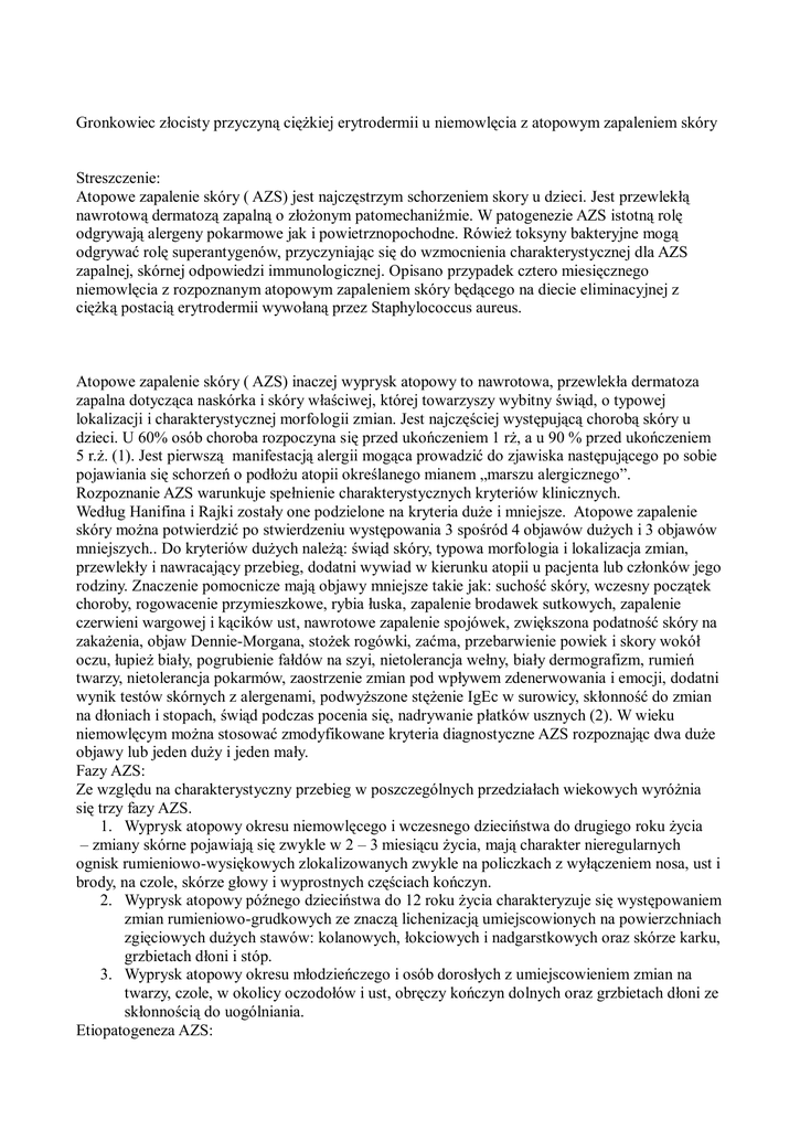 Gronkowiec złocisty przyczyną ciężkiej erytrodermii u niemowlęcia z atopowym zapaleniem skóry Streszczenie: Atopowe zapalenie skóry ( AZS) jest najczęstrzym schorzeniem skory u dzieci. Jest przewlekłą nawrotową dermatozą zapalną o złożonym patomechaniźmie. W patogenezie AZS istotną rolę odgrywają alergeny pokarmowe jak i powietrznopochodne. Rówież toksyny bakteryjne mogą odgrywać rolę superantygenów, przyczyniając się do wzmocnienia charakterystycznej dla AZS zapalnej, skórnej odpowiedzi immunologicznej. Opisano przypadek cztero miesięcznego niemowlęcia z rozpoznanym atopowym zapaleniem skóry będącego na diecie eliminacyjnej z ciężką postacią erytrodermii wywołaną przez Staphylococcus aureus. Atopowe zapalenie skóry ( AZS) inaczej wyprysk atopowy to nawrotowa, przewlekła dermatoza zapalna dotycząca naskórka i skóry właściwej, której towarzyszy wybitny świąd, o typowej lokalizacji i charakterystycznej morfologii zmian. Jest najczęściej występującą chorobą skóry u dzieci. U 60% osób choroba rozpoczyna się przed ukończeniem 1 rż, a u 90 % przed ukończeniem 5 r.ż. (1). Jest pierwszą manifestacją alergii mogąca prowadzić do zjawiska następującego po sobie pojawiania się schorzeń o podłożu atopii określanego mianem „marszu alergicznego”. Rozpoznanie AZS warunkuje spełnienie charakterystycznych kryteriów klinicznych. Według Hanifina i Rajki zostały one podzielone na kryteria duże i mniejsze. Atopowe zapalenie skóry można potwierdzić po stwierdzeniu występowania 3 spośród 4 objawów dużych i 3 objawów mniejszych.. Do kryteriów dużych należą: świąd skóry, typowa morfologia i lokalizacja zmian, przewlekły i nawracający przebieg, dodatni wywiad w kierunku atopii u pacjenta lub członków jego rodziny. Znaczenie pomocnicze mają objawy mniejsze takie jak: suchość skóry, wczesny początek choroby, rogowacenie przymieszkowe, rybia łuska, zapalenie brodawek sutkowych, zapalenie czerwieni wargowej i kącików ust, nawrotowe zapalenie spojówek, zwiększona podatność skóry na zakażenia, objaw Dennie-Morgana, stożek rogówki, zaćma, przebarwienie powiek i skory wokół oczu, łupież biały, pogrubienie fałdów na szyi, nietolerancja wełny, biały dermografizm, rumień twarzy, nietolerancja pokarmów, zaostrzenie zmian pod wpływem zdenerwowania i emocji, dodatni wynik testów skórnych z alergenami, podwyższone stężenie IgEc w surowicy, skłonność do zmian na dłoniach i stopach, świąd podczas pocenia się, nadrywanie płatków usznych (2). W wieku niemowlęcym można stosować zmodyfikowane kryteria diagnostyczne AZS rozpoznając dwa duże objawy lub jeden duży i jeden mały. Fazy AZS: Ze względu na charakterystyczny przebieg w poszczególnych przedziałach wiekowych wyróżnia się trzy fazy AZS. 1. Wyprysk atopowy okresu niemowlęcego i wczesnego dzieciństwa do drugiego roku życia – zmiany skórne pojawiają się zwykle w 2 – 3 miesiącu życia, mają charakter nieregularnych ognisk rumieniowo-wysiękowych zlokalizowanych zwykle na policzkach z wyłączeniem nosa, ust i brody, na czole, skórze głowy i wyprostnych częściach kończyn. 2. Wyprysk atopowy późnego dzieciństwa do 12 roku życia charakteryzuje się występowaniem zmian rumieniowo-grudkowych ze znaczą lichenizacją umiejscowionych na powierzchniach zgięciowych dużych stawów: kolanowych, łokciowych i nadgarstkowych oraz skórze karku, grzbietach dłoni i stóp. 3. Wyprysk atopowy okresu młodzieńczego i osób dorosłych z umiejscowieniem zmian na twarzy, czole, w okolicy oczodołów i ust, obręczy kończyn dolnych oraz grzbietach dłoni ze skłonnością do uogólniania. Etiopatogeneza AZS: Patomechanizm AZS jest bardzo złożony. Za pierwotny czynnik w etiopatogenezie AZS obecnie uważane jest zaburzenie czynności bariery naskórkowej, umożliwiające penetrację alergenów i czynników drażniących z otoczenia (3). Główną barierę chroniącą stanowi warstwa rogowa naskórka. Zbudowana jest ona z keratynocytów zwanych korneocytami. Są one połączone macierzą lipidową. Całość wzmacniają włókna białkowe – korneodesmosomy. Zachodzą tu dynamiczne procesy namnażania, obumierania i złuszczania się komórek. Prawidłowe wytwarzanie tzw koperty rogowej będącej wynikiem terminalnej apoptozy korneocytów i tworzenia krzyżowych wiązań przez transglutaminazy jest szczególnie ważne dla funkcji ochronnej naskórka (4). W procesie tym zasadniczą rolę odgrywa filagryna (FLG) zasadowe białko warstwy rogowej spajające włókna keratynowe. Chorzy na AZS charakteryzują się obniżoną ekspresją filagryny w naskórku (5). Nieprawidłowa synteza białek strukturalnych naskórka, wysokie stężenie proteaz i niska aktywność ich inhibitorów, zaburzenia syntezy naskórkowych lipidów, zmiana wartości ph, zmniejszone wiązanie wody w naskórku i wzrost przeznaskórkowej utraty wody są obecnie uważane za pierwotne czynniki w etiopatogenezie AZS i nazwane teorią zewnątrzpochodną. - outside. Teoria wewnątrzpochodna – inside podnosi rolę zaburzeń czynności układu immunologicznego w etiopatogenezie wyprysku atopowego (6). Związane jest to ze zmianą równowagi pomiędzy populacjami limfocytów Th2 i Th1/Th0 i rozwojem w ostrej fazie choroby IgE zależnej odpowiedzi na alergeny pokarmowe i powietrznopochodne. Istnieją przekonywujące dane kliniczne i laboratoryjne dotyczące istotnej roli alergenów pokarmowych. Główna rolę przypisuje się białku mleka krowiego – betalaktoglobulinie, alfalaktoalbuminie i kazeinie. Należy pamiętać, że wołowina i cielęcina zawierają białka zbliżone lub identyczne z białkami mleka krowiego, dlatego u dzieci silnie uczulonych mogą wystąpić objawy po spożyciu tych mięs. Dzieciom uczulonym na mleko krowie nie należy podawać również mleka koziego, ponieważ zawiera białka zbliżone do mleka krowiego. Drugim najistotniejszym alerge