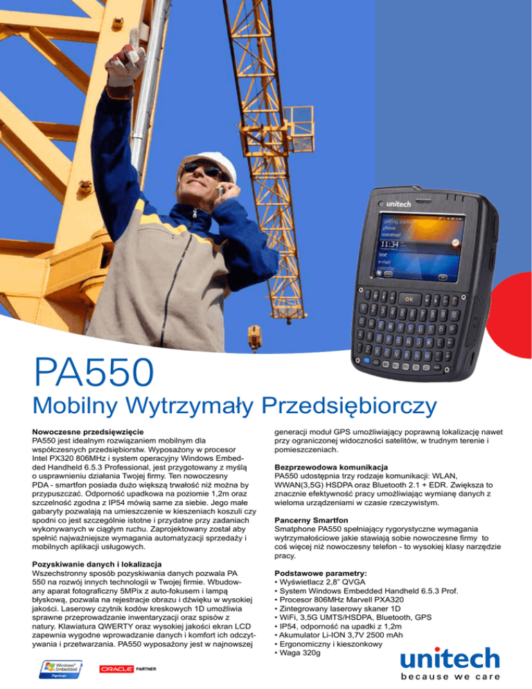 PA550 Mobilny Wytrzymały Przedsiębiorczy Nowoczesne przedsięwzięcie PA550 jest idealnym rozwiązaniem mobilnym dla współczesnych przedsiębiorstw. Wyposażony w procesor Intel PX320 806MHz i system operacyjny Windows Embedded Handheld 6.5.3 Professional, jest przygotowany z myślą o usprawnieniu działania Twojej firmy. Ten nowoczesny PDA - smartfon posiada dużo większą trwałość niż można by przypuszczać. Odporność upadkowa na poziomie 1,2m oraz szczelność zgodna z IP54 mówią same za siebie. Jego małe gabaryty pozwalają na umieszczenie w kieszeniach koszuli czy spodni co jest szczególnie istotne i przydatne przy zadaniach wykonywanych w ciągłym ruchu. Zaprojektowany został aby spełnić najważniejsze wymagania automatyzacji sprzedaży i mobilnych aplikacji usługowych. Pozyskiwanie danych i lokalizacja Wszechstronny sposób pozyskiwania danych pozwala PA 550 na rozwój innych technologii w Twojej firmie. Wbudowany aparat fotograficzny 5MPix z auto-fokusem i lampą błyskową, pozwala na rejestracje obrazu i dźwięku w wysokiej jakości. Laserowy czytnik kodów kreskowych 1D umożliwia sprawne przeprowadzanie inwentaryzacji oraz spisów z natury. Klawiatura QWERTY oraz wysokiej jakości ekran LCD zapewnia wygodne wprowadzanie danych i komfort ich odczytywania i przetwarzania. PA550 wyposażony jest w najnowszej generacji moduł GPS umożliwiający poprawną lokalizację nawet przy ograniczonej widoczności satelitów, w trudnym terenie i pomieszczeniach. Bezprzewodowa komunikacja PA550 udostępnia trzy rodzaje komunikacji: WLAN, WWAN(3,5G) HSDPA oraz Bluetooth 2.1 + EDR. Zwiększa to znacznie efektywność pracy umożliwiając wymianę danych z wieloma urządzeniami w czasie rzeczywistym. Pancerny Smartfon Smatphone PA550 spełniający rygorystyczne wymagania wytrzymałościowe jakie stawiają sobie nowoczesne firmy to coś więcej niż nowoczesny telefon - to wysokiej klasy narzędzie pracy. Podstawowe parametry: • Wyświetlacz 2,8” QVGA • System Windows Embedded Handheld 6.5.3 Prof. • Procesor 806MHz Marvell PXA320 • Zintegrowany laserowy skaner 1D • WiFi, 3,5G UMTS/HSDPA, Bluetooth, GPS • IP54, odporność na upadki z 1,2m • Akumulator Li-ION 3,7V 2500 mAh • Ergonomiczny i kieszonkowy • Waga 320g PA550 Specyfikacja System CPU RAM ROM OS Wymiary Waga Wymiar Intel PXA320 806MHz Mobile DDR 256MB NaND 512MB Windows Embedded Handheld 6.5.3 Professional Wyświetlacz 2.8” QVGA transflective color LCD with touch screen and backlight (Excellent sunlight readability, 80° viewing angle) - 135 DPI Klawiatura QWERTY keypad with individual numeric keys Numeric keypad (optional) 330g w przybliżeniu 125mm x 82mm x 35mm (Antenna length excluded) Warunki pracy Temp. otoczenia Temp. przechowywania Wilgotność Stopień ochrony Odporność na upadek Software Microsoft Visual Studio 2005/2008 Mobile SIP(VOIP) Oracle Database Lite Camera / Photos / Video 5.0 megapixel auto-focus camera with flash Unitech MPEG-4 video codec (VGA resolution) 12Manage & 12Solutions In-house developed software to enhance device deployment and remote management. 12[want:to]Solutions including 12Manage improve system reliability, reduce service costs and ensure systems running smootly. More info: www.unitechnical.info Wskaźnik 3 Leds wskazując ładowania i skanowania Vibrator Zintegrowane urządzenia czytania 1D Skaner laserowy Typy kodów 1D Skaner laserowy UPC-A/E, EAN-8/13, Codabar, Code 11, Code 32, Code 93 (full ASCI), Code 128, Interleaved & Std. 2 of 5, EAN 128, Delta, MSI/ Plessey, Toshiba Komunikacja USB WLAN PAN WWAN GPS -10˚C to 50˚C -20˚C to 60˚C 5% ~ 95% (non-condensing) 1.2 metr IP54 USB 1.1 Host & Client IEEE 802.11b/g Bluetooth 2.1 + EDR 3.5G Five-bands, GSM/GPRS 850Mhz, 900MhZ, 1800Mhz and 1900Mhz ,UMTS WCDMA/HSDPA 50Mhz,1900Mhz, 2100Mhz / GPRS Edge Ublox NEO-5Q GPS with KickStart® and SuperSense® technologies Źródła zasilania Gówna bateria 9.25 Watts (3.7V@2500mAh) Li-ion battery pack Bateria zapasowa Data / czas retencji - 2 godzin - 18mAh Czas pracy 1 scan/5 sec. - 7 godzin Audio Głośnik 0.8W - Mono Złącze słuchawek 3.5mm 4 słup; L/R Głośnik & mikrofon Odbiornik Echo Cancellation Mikrofon Akcesoria Desktop USB Cradle z ładowarka Typu Desktop Cradle z ładowarka Komunikacja USB i kabel ładowania Zasilacz Universal Power Korki Ładowarka do zapalniczki pojazdu Mono Headset 3.5mm Zestaw samochodowy Zgodność z regulacjami CE, FCC, BSMI, VCCI, CCC, RoHS compliance Unitech’s service program UnitCare offers customers a high level of security by a reliable, high-quality and effective program for getting your devices serviced quickly. It also drives the hidden costs out of your installations. UnitCare goes beyond the standard warranty with a complete service offer for different need. More information: www.unitcare.info Gniazdo rozszerzeń Micro SD Obsługa pamięci SDHC do 32GB Pytania i informacje Leander Peichl Territory Manager Austrii, Szwajcarii i Wschodniej T. +43 664 52 64 974 E-mail: [email protected] Unitech Europe Tilburg, The Netherlands • Tel.: +31 (0)13 460 9292 • Email: [email protected] • Website: http://eu.ute.com Unitech America Unitech Asia Pacific Unitech China Unitech Europe Unitech Japan Unitech Taiwan Specifications subject to change without notice. Copyright 2011 Unitech Electronics Co., Ltd. All rights reserved. Unitech is a registered trademark of Unitech Electronics Co., Ltd. All product and company names are trademarks, service marks, or registered trademarks of their respective owners.