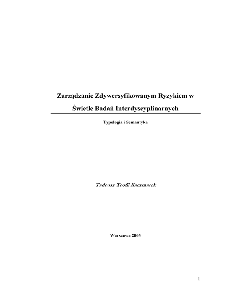 Zarządzanie Zdywersyfikowanym Ryzykiem w Świetle Badań Interdyscyplinarnych Typologia i Semantyka Tadeusz Teofil Kaczmarek Warszawa 2003 1 Spis treści Wstęp 7 Rozdział I Interdyscyplinarne badanie zdywersyfikowanego ryzyka - typologia i semantyka ....................................................................................................... 9 1. Stan zagadnienia .................................................................................. 2. Pojęcie ryzyka ..................................................................................... 3. Typologia ryzyka................................................................................. 3.1. Ryzyko ubezpieczeniowe..................................................................... 3.2. Ryzyko ekonomiczne .......................................................................... 3.3. Ryzyko finansowe .............................................................................. 3.4. Ryzyko produkcyjne........................................................................... 3.5. Ryzyko prawne a bezpieczeństwo ....................................................... 3.6. Ryzyko organizacyjne ........................................................................ 3.7. Ryzyko polityczne .............................................................................. 3.8. Ryzyko związane z nowymi technologiami i ekologią........................ 3.9. Ryzyko medyczne i epidemiologiczne ................................................. 3.10. Ryzyko farmaceutyczne .................................................................. 3.11. Ryzyko chemiczne .......................................................................... 3.12. Ryzyko psychologiczne ................................................................... 3.13. Ryzyko socjologiczne ...................................................................... 3.14. Medialne ryzyko środków przekazu ................................................ 3.15. Ryzyko cywilizacyjne i kulturowe................................................... 3.16. Ryzyko filozoficzne, etyczne i religijne............................................ 3.17. Ryzyko siły wyższej (vis major) ...................................................... 9 11 16 17 18 19 20 21 24 26 28 31 33 35 37 39 40 42 43 46 4. Prawo do podejmowania ryzyka......................................................... 49 Podsumowanie rozdziału 1.......................................................................... 51 Rozdział II Interdyscyplinarne zarządzanie ryzykiem - generalne zasady ................... 53 1. Określenie zasad procesu zarządzania ryzykiem................................ 1.1. Identyfikacja i analiza ryzyka ............................................................. 1.2. Ocena i sformułowanie wariantów...................................................... 1.3. Ograniczanie i eliminowanie przyczyn ryzyka.................................... 1.3.1. Zwiększanie zasobu informacji - z różnych dyscyplin i dziedzin . 1.3.2. Skutki asymetrii informacji.............................................................. 2. Przeciwdziałanie zdywersyfikowanemu ryzyku .................................. 2.1. Klasyfikacja sposobów przeciwdziałania ryzyku................................. 2.2. Ponoszenie ryzyka (własne pokrycie ryzyka)..................................... 2.2.1. Wkalkulowanie ryzyka w cenę ........................................................ 2.2.2. Zapobieganie ryzyku przez tworzenie rezerwy................................ 2.2.3. Przeniesienie ryzyka ....................................................................... 53 57 57 58 58 59 61 61 62 62 63 65 2.2.3.1. Przeniesienie ryzyka przez umowę ............................................. 2.2.3.2. Ubezpieczyciel jako podmiot przejmujący ryzyko ....................... 2.2.4. Kompensacja ryzyka ................................................................... 65 66 67 2 3. 4. Problemy związane z zarządzaniem ryzykiem w małych i średnich przedsiębiorstwach............................................................. Inne sposoby radzenia sobie z wybranym rodzajem ryzyka (ryzyko eksportowe)........................................................................... 67 69 Podsumowanie rozdziału II .............................................................................. 74 Rozdział III Zintegrowane zarządzanie ryzykiem w procesach zarządczych ................. 75 1. Interakcja w zarządzaniu ryzykiem i kierowaniem przedsiębiorstwem.............................................................................. 2. Identyfikacja rodzajów ryzyka w tworzonym systemie celów przedsiębiorstwa................................................................................. 3. Analiza ryzyka w identyfikowaniu określonych problemów................ 4. Uwzględnianie ryzyka przy poszukiwaniu alternatywnych rozwiązań........................................................................................... 5. Ryzyko i wybór instrumentów zarządzania ryzykiem........................ 6. Kontrola jako funkcja zarządzania ryzykiem ..................................... Podsumowanie rozdziału III.. ................................................................... Rozdział IV Nowe aspekty i kierunki badań nad ryzykiem ............................................. 1. 76 78 81 84 86 87 89 90 6. Strategie zmierzające do ograniczenia globalnego ryzyka i zagrożeń dla środowiska naturalnego................................................. Działania człowieka a zmiany klimatyczne......................................... Postawa obiektywna i wątpienie metodyczne w badaniu ryzyka......... Optymistyczna i pesymistyczna postawa w ocenie ryzyka................. Eksplozja zasobów informacji i jej wpływ na badania nad ryzykiem -jaka perspektywa ?.................................................... Znaczenie badań transdyscyplin