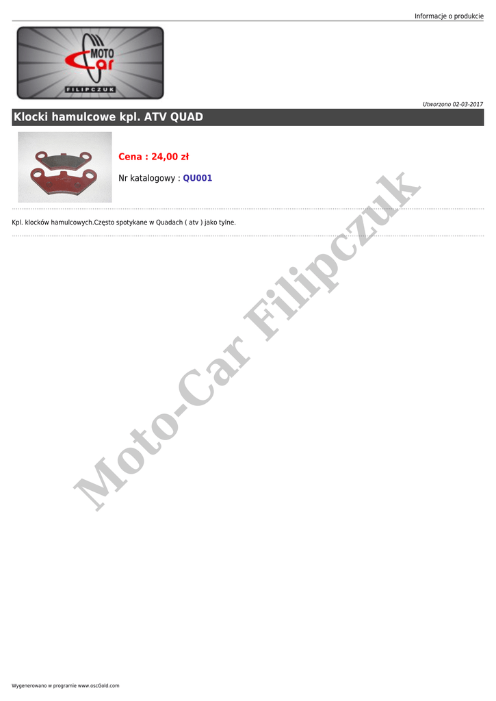 Informacje o produkcie Utworzono 02-03-2017 Klocki hamulcowe kpl. ATV QUAD Cena : 24,00 zł zu k Nr katalogowy : QU001 M ot oC ar Fi lip c Kpl. klocków hamulcowych.Często spotykane w Quadach ( atv ) jako tylne. Wygenerowano w programie www.oscGold.com