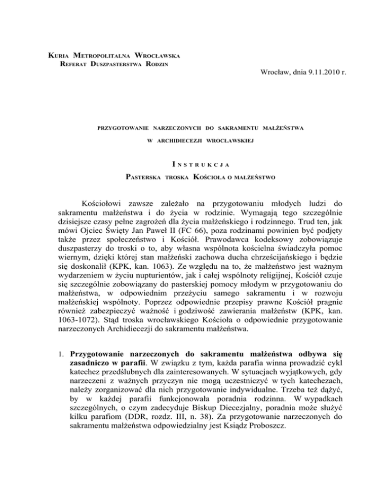 KURIA METROPOLITALNA WROCŁAWSKA REFERAT DUSZPASTERSTWA RODZIN Wrocław, dnia 9.11.2010 r. PRZYGOTOWANIE NARZECZONYCH DO SAKRAMENTU MAŁŻEŃSTWA W ARCHIDIECEZJI WROCŁAWSKIEJ INSTRUKCJA PASTERSKA TROSKA KOŚCIOŁA O MAŁŻEŃSTWO Kościołowi zawsze zależało na przygotowaniu młodych ludzi do sakramentu małżeństwa i do życia w rodzinie. Wymagają tego szczególnie dzisiejsze czasy pełne zagrożeń dla życia małżeńskiego i rodzinnego. Trud ten, jak mówi Ojciec Święty Jan Paweł II (FC 66), poza rodzinami powinien być podjęty także przez społeczeństwo i Kościół. Prawodawca kodeksowy zobowiązuje duszpasterzy do troski o to, aby własna wspólnota kościelna świadczyła pomoc wiernym, dzięki której stan małżeński zachowa ducha chrześcijańskiego i będzie się doskonalił (KPK, kan. 1063). Ze względu na to, że małżeństwo jest ważnym wydarzeniem w życiu nupturientów, jak i całej wspólnoty religijnej, Kościół czuje się szczególnie zobowiązany do pasterskiej pomocy młodym w przygotowaniu do małżeństwa, w odpowiednim przeżyciu samego sakramentu i w rozwoju małżeńskiej wspólnoty. Poprzez odpowiednie przepisy prawne Kościół pragnie również zabezpieczyć ważność i godziwość zawierania małżeństw (KPK, kan. 1063-1072). Stąd troska wrocławskiego Kościoła o odpowiednie przygotowanie narzeczonych Archidiecezji do sakramentu małżeństwa. 1. Przygotowanie narzeczonych do sakramentu małżeństwa odbywa się zasadniczo w parafii. W związku z tym, każda parafia winna prowadzić cykl katechez przedślubnych dla zainteresowanych. W sytuacjach wyjątkowych, gdy narzeczeni z ważnych przyczyn nie mogą uczestniczyć w tych katechezach, należy zorganizować dla nich przygotowanie indywidualne. Trzeba też dążyć, by w każdej parafii funkcjonowała poradnia rodzinna. W wypadkach szczególnych, o czym zadecyduje Biskup Diecezjalny, poradnia może służyć kilku parafiom (DDR, rozdz. III, n. 38). Za przygotowanie narzeczonych do sakramentu małżeństwa odpowiedzialny jest Ksiądz Proboszcz. 2 Przynajmniej na trzy miesiące przed planowanym terminem ślubu, narzeczeni zgłaszają się w kancelarii parafialnej, narzeczonej lub narzeczonego, celem podjęcia bezpośredniego przygotowania do zawarcia sakramentu małżeństwa. 2. Przygotowanie obejmuje: a) Rozmowa duszpasterska w kancelarii parafialnej, na podstawie aktualnego protokołu kanonicznego badania narzeczonych. Podczas tego spotkania duszpasterz zorientuje się, jakie jest ich zaangażowanie religijne, na ile uczestniczą w życiu Kościoła i jak przedstawia się ich przygotowanie do małżeństwa, by w oparciu o to rozpoznanie ustalić dalsze etapy przygotowania do tego wydarzenia, tak bardzo ważnego i fundamentalnego dla nich. Podczas tej rozmowy duszpasterz kieruje narzeczonych na przygotowanie, podając na piśmie dokładny adres i godziny katechezy przedślubnej, indywidualnych spotkań w poradni rodzinnej i dnia skupienia. b) Dziewięć katechez przedślubnych, podczas których należy omówić tematy z: teologii małżeństwa i rodziny, etyki życia małżeńskiego, odpowiedzialnego rodzicielstwa oraz liturgię sakramentu małżeństwa. Tematy katechez: • Chrześcijanin – uczeń Chrystusa. • Powołanie do życia w małżeństwie i rodzinie. • Rozwój i zagrożenia miłości w małżeństwie. • Odpowiedzialne rodzicielstwo. • Normy etyczne życia małżeńskiego. • Postawy antyrodzicielskie a naturalne planowanie rodziny. • Dziecko – najcenniejszy dar dla małżonków. • Sakramentalny charakter małżeństwa – zadania. • Liturgia sakramentu małżeństwa. Katechezy nie powinny być przeprowadzone częściej niż raz w tygodniu (maksymalnie 2 katechezy tygodniowo). c) Trzy konsultacje indywidualne w poradni życia rodzinnego z odpo- wiednio przygotowaną osobą świecką – doradcą życia rodzinnego, posiadającą misję kanoniczną Biskupa Diecezjalnego. d) Uczestnictwo w dniu skupienia dla narzeczonych, zorganizowanym przez Dekanalnego Duszpasterza Rodzin na terenie dekanatu. e) Spowiedź i Komunia św. na początku i na końcu bezpośredniego przygotowania. 3 3. Wynagrodzenie: a) Narzeczeni są zobowiązani do złożenia ofiary w wysokości 70,- zł (słownie: siedemdziesiąt złotych) od pary Księdzu Proboszczowi parafii, w której uczestniczą w przygotowaniu do sakramentu małżeństwa. b) Ksiądz Proboszcz parafii prowadzącej przygotowanie zabezpiecza materialne warunki pracy w poradni oraz dba o dokształcanie i formację doradców. Pokrywa koszty ich dokształcania w ramach dni skupienia oraz szkoleń i rekolekcji organizowanych przez Referat Duszpasterstwa Rodzin Kurii oraz Rady ds. Rodziny Episkopatu Polski (koszty dojazdu, pobytu, materiałów szkoleniowych oraz materiałów dla parafii - DDR pkt. 42). c) Do Księdza Proboszcza należy też stosowne wynagradzanie doradców za pracę w poradni. Jeżeli jest to poradnia dla dekanatu, za wynagrodzenie odpowiada Ksiądz Dziekan, gdy dla kilku parafii, sprawę wynagrodzenia ustalą i realizują zainteresowani proboszczowie (DDR, rozdz. III, n. 42). Wynagrodzenie dla doradców życia rodzinnego w Archidiecezji Wrocławskiej ustalono w wysokości: Dyżur w poradni 1 godz. - 25,- zł (netto) Konferencja, wykład, katecheza 45 min. - 25,- zł (netto) Jeżeli doradca życia rodzinnego przygotowuje narzeczonych poza godzinami dyżuru w poradni: trzy spotkania indywidualne z narzeczonymi po ½ godz. - koszt 35,- zł (netto). Wynagrodzenie otrzymuje doradca z kasy parafialnej, po podpisaniu umowy z parafią. Doradcom nie wolno pobierać żadnego wynagrodzenia od narzeczonych. Archidiecezjalny Duszpasterz Rodzin _________________________________ MARIAN GOŁĘBIEWSKI ARCYBISKUP METROPOLITA WROCŁAWSKI L.dz. 1610/2010 Powyższą Instrukcję duszpasterską PRZYGOTOWANIE NARZECZONYCH DO SAKRAMENTU W ARCHIDIECEZJI WROCŁAWSKIEJ niniejszym zatwierdzam i ogłaszam jako obowiązującą, z dniem 01 grudni