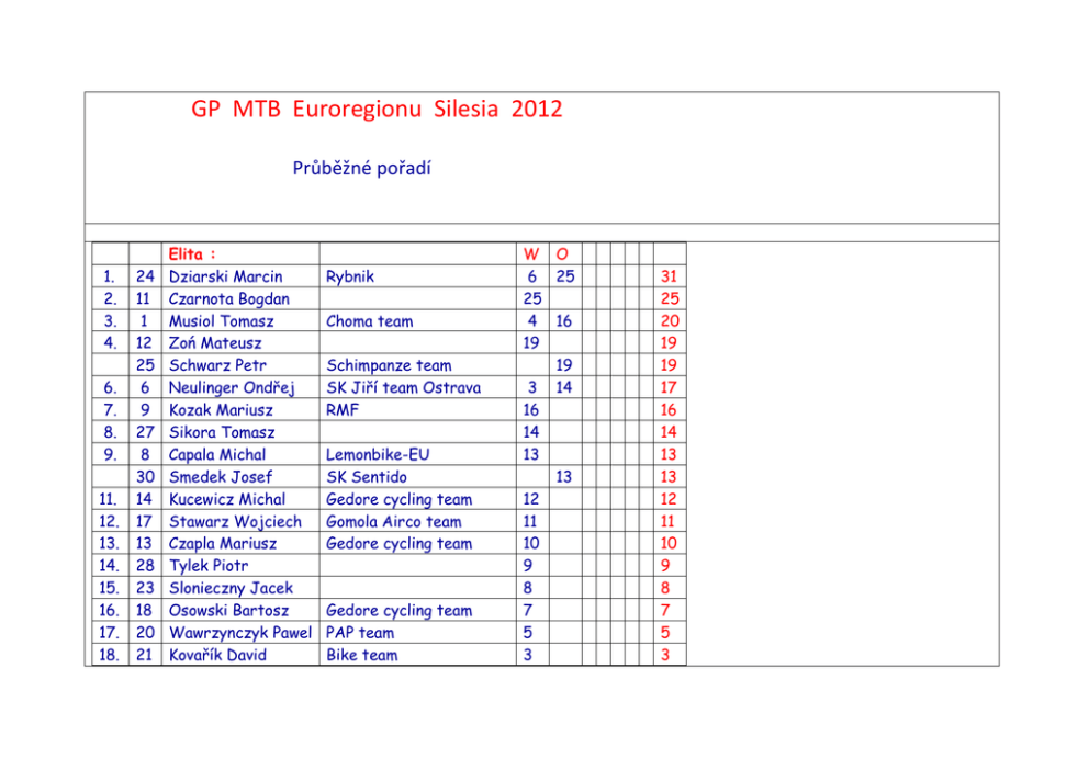 GP MTB Euroregionu Silesia 2012 Průběžné pořadí 1. 2. 3. 4. 6. 7. 8. 9. 11. 12. 13. 14. 15. 16. 17. 18. 24 11 1 12 25 6 9 27 8 30 14 17 13 28 23 18 20 21 Elita : Dziarski Marcin Czarnota Bogdan Musiol Tomasz Zoń Mateusz Schwarz Petr Neulinger Ondřej Kozak Mariusz Sikora Tomasz Capala Michal Smedek Josef Kucewicz Michal Stawarz Wojciech Czapla Mariusz Tylek Piotr Slonieczny Jacek Osowski Bartosz Wawrzynczyk Pawel Kovařík David Rybnik Choma team Schimpanze team SK Jiří team Ostrava RMF Lemonbike-EU SK Sentido Gedore cycling team Gomola Airco team Gedore cycling team Gedore cycling team PAP team Bike team W O 6 25 25 4 16 19 19 3 14 16 14 13 13 12 11 10 9 8 7 5 3 31 25 20 19 19 17 16 14 13 13 12 11 10 9 8 7 5 3 19. 10 20. 7 21. 4 22. 19 1. 2. 3. 5. 6. 7. 9. 10. 11. 12. 13. 14. 15. 16. 138 140 139 142 101 145 137 105 149 146 148 147 135 144 141 143 Koźlicki Kornel Beneš Jiří Jaluvka Petr Kabusz Dawid Masters A : Kovařík Ivo Galuška Tomáš Ciok Remigiusz Kamecki Satnislaw Byrtus Ivo Kuras Krzysztof Kudlek Zbigniew Bollo Roman Podolski Krzysztof Pasyto Grzegorz Ryglewski Piotr Jančik Martin Miszkow Mariusz Andkosz Michal Jasinski Michal Kawecki Dariusz Źywiec cross racing team SK Jiří team Ostrava SK Jiří team Ostrava PAP team SK Jiří team Ostrava SK Šafrata Bohumín Velonew Jastrzebie SK Sport Klapka Karviná Rybnik Yogi Racing Ostrava RMF F-M Croma team Zabrze Źory Zabrze 2 2 1 1 W 14 19 25 11 2 2 1 1 O 25 16 14 19 16 13 13 12 10 9 8 7 6 5 4 39 35 25 25 19 16 13 13 12 10 9 8 7 6 5 4 1. 2. 3. 4. 5. 1. 2. 3. 4. 5. 6. 151 154 152 170 156 202 207 206 215 201 203 214 8. 212 211 10. 205 11. 208 12. 210 13. 209 Masters B : Sedláček Jiří Bluszcz Stefan Marunowicz Andrzej Grzempa Grzegorz Baier Jan Junioři : Svrčina Karel Stolařík Tomáš Keisler Jiří Heczko Filip Szczepaniak Alan Fratczak Piotr Orzel Dominik Jakl Tomáš Kowol Slawek Śebo Adam Polok Kacper Puciak Rafal Falkarski Mateusz W O SK Jiří team Ostrava 25 25 SK Šafrata Bohumín 16 19 19 E-Rower B.B. 16 SK Šafrata Bohumín 14 SK Jiří team Ostrava SK Jiří team Ostrava SK Jiří team Ostrava TŽ Třinec W 25 19 11 16 White MTB team Biala 14 MTB Silesia SK Jiří team Ostrava 13 12 10 9 8 O 25 16 12 19 14 13 50 35 19 16 14 50 35 23 19 16 14 14 13 13 12 10 9 8 1. 2. 255 289 251 254 5. 257 6. 286 253 8. 253 9. 290 10. 256 1. 2. 3. 5. 6. 7. 9. 302 303 348 306 309 305 301 311 304 310 Kadeti : Junior mlodszy : Szewczyk Michal Průdek Matěj Pobožniak Patryk Czuprinski Jakub Prejda Václav Nowak Piotr Drutko Pawel Prudlo Pawel Petruňa Vojtěch Kubiš David Žáci starší : Mlodzik : Wagner Jakub Voznička Vojtěch Gawlowicz Wiktor Nowak Stanislaw Herman Ondřej Bujas Szymon Grabowski Karol Hašek Daniel Ryglevoski Jan Pelikán Tomáš Cieszyn Bike 2000 W O 19 14 25 25 14 11 SK Jiří team Ostrava 19 GK Gliwice 16 16 Choma team 13 Schimpanzee team 12 SK Šafrata Bohumín 10 W VH team 33 25 25 25 19 16 16 13 12 10 O 25 25 16 14 MTB Silesia Rybnik 19 19 VRV team 16 14 13 BAG Bike 13 12 VRV team 12 50 30 19 19 16 14 13 13 12 12 11. 308 Petřík Jakub VRV team 12. 347 Joannidis Michalis Bike 2000 1. 2. 3. 4. 5. 6. 7. 8. 9. 10. 11. 351 356 357 395 355 354 352 392 353 396 361 358 13. 391 14. 397 15. 360 1. 11 10 Źak / Mladší žáci : Huráč Vojtěch Feso Petřvald Sitko Adrian KTS Tychy Olszar Antoni Cieszyn Stoček Bruno Bike 2000 Czech Maciej Wodzislaw Bohdalorský Jiří SK Jiří team Ostrava Říman Jakub Hašek Max BAG Bike Jančík Martin Zajíc Daniel Bike 2000 Tuharský Erich Schimpanzee team Rzepka Robert Mareš Matěj Adámek Antonín Bike 2000 Swaczyna Tomáš Schimpanzee team Mlodszy źak: Předžáci : 401 Kawecki Igor 403 Grzegorzek Julian W 25 19 14 12 10 16 11 10 O 19 13 16 25 8 7 44 32 30 25 20 17 16 14 13 12 11 11 10 9 6 14 13 12 11 11 10 9 6 W O 19 16 13 16 32 32 3. 402 405 5. 408 6. 406 Gruszczynski Filip 25 Pomiklo Daniel BAG Bike 25 Voznička Ondřej SK Jiří team Ostrava 19 Vall Jan 14 Kobiety Elita : Ženy : 1. 98 Drabik Dagmara 2. 99 Socha Justyna 3. 97 Maráčková Pavlína 94 Macíková Lucie 5. 100 Rezková Aneta 6. 92 Rajská Lenka 96 Bednarczyk Ilona 1. 349 2. 350 341 4. 344 5. 343 6. 346 7. 345 8. 342 W 25 25 19 14 O Choma team Choma team 16 16 14 14 25 Ghost - mojekolo 25 19 SK Šafrata Bohumí 13 13 Mlodzicka + juniorka ml. St.žákyně + kadetky : Pilchovská Aneta Tylek Justyna Prejdová Marie Tvarůžková Tereza Nováková Barbora Knapková Denisa Krupová Lucie Pytlová Markéta 32 28 25 25 19 13 13 W SK Šafrata Bohumín O 19 10 25 SK Jiří team Ostrava 25 VRV team 19 VRV team 16 VRV team 14 VRV team 13 Bag Bike 12 29 25 25 19 16 14 13 12 9. 307 Joannidu Marie 1. 2. 3. 4. 5. 1. 2. 3. 4. 5. Bike 2000 398 394 400 390 393 Źak – dziewczyny : Mladší žákyně : Faroń Wiktoria Hermanová Veronika Szczepaniak Patrycia Bojková Michaela Gajdáčková Petra 449 450 448 440 404 Ml. Źak – dziewczyny : W Předžákyně : Pala Zuzana 25 Choma Laura Choma team 19 Pytlová Eva BAG Bike Gibas Dominika Chrzaszcz Olivia Choma team 11 W 11 O VKS Gymnazium VRV team 25 19 25 19 Bike 2000 16 SK Šafrata Bohumín 14 44 25 19 16 14 O 19 14 25 16 13 Výsledky i průběžné pořadí budou zveřejňovány na našich klubových stránkách : http://sksafrata.netstranky.cz/mtb-gp-silesia-2012.html 44 33 25 16 13