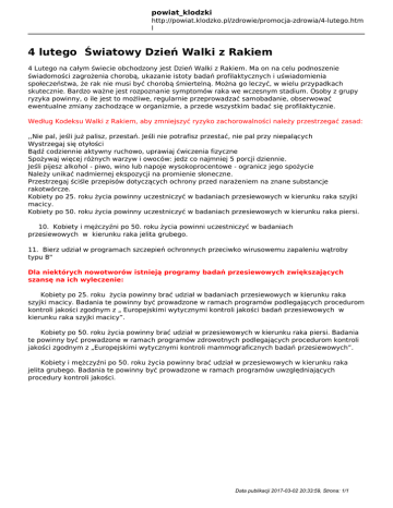 powiat_klodzki http://powiat.klodzko.pl/zdrowie/promocja-zdrowia/4-lutego.htm l 4 lutego Światowy Dzień Walki z Rakiem 4 Lutego na całym świecie obchodzony jest Dzień Walki z Rakiem. Ma on na celu podnoszenie świadomości zagrożenia chorobą, ukazanie istoty badań profilaktycznych i uświadomienia społeczeństwa, że rak nie musi być chorobą śmiertelną. Można go leczyć, w wielu przypadkach skutecznie. Bardzo ważne jest rozpoznanie symptomów raka we wczesnym stadium. Osoby z grupy ryzyka powinny, o ile jest to możliwe, regularnie przeprowadzać samobadanie, obserwować ewentualne zmiany zachodzące w organizmie, a przede wszystkim badać się profilaktycznie. Według Kodeksu Walki z Rakiem, aby zmniejszyć ryzyko zachorowalności należy przestrzegać zasad: ,,Nie pal, jeśli już palisz, przestań. Jeśli nie potrafisz przestać, nie pal przy niepalących Wystrzegaj się otyłości Bądź codziennie aktywny ruchowo, uprawiaj ćwiczenia fizyczne Spożywaj więcej różnych warzyw i owoców: jedz co najmniej 5 porcji dziennie. Jeśli pijesz alkohol - piwo, wino lub napoje wysokoprocentowe - ogranicz jego spożycie Należy unikać nadmiernej ekspozycji na promienie słoneczne. Przestrzegaj ściśle przepisów dotyczących ochrony przed narażeniem na znane substancje rakotwórcze. Kobiety po 25. roku życia powinny uczestniczyć w badaniach przesiewowych w kierunku raka szyjki macicy. Kobiety po 50. roku życia powinny uczestniczyć w badaniach przesiewowych w kierunku raka piersi. 10. Kobiety i mężczyźni po 50. roku życia powinni uczestniczyć w badaniach przesiewowych w kierunku raka jelita grubego. 11. Bierz udział w programach szczepień ochronnych przeciwko wirusowemu zapaleniu wątroby typu B" Dla niektórych nowotworów istnieją programy badań przesiewowych zwiększających szansę na ich wyleczenie: Kobiety po 25. roku życia powinny brać udział w badaniach przesiewowych w kierunku raka szyjki macicy. Badania te powinny być prowadzone w ramach programów podlegających procedurom kontroli jakości zgodnym z „ Europejskimi wytycznymi kontroli jakości badań przesiewowych w kierunku raka szyjki macicy”. Kobiety po 50. roku życia powinny brać udział w przesiewowych w kierunku raka piersi. Badania te powinny być prowadzone w ramach programów zdrowotnych podlegających procedurom kontroli jakości zgodnym z „Europejskimi wytycznymi kontroli mammograficznych badań przesiewowych”. Kobiety i mężczyźni po 50. roku życia powinny brać udział w przesiewowych w kierunku raka jelita grubego. Badania te powinny być prowadzone w ramach programów uwzględniających procedury kontroli jakości. Data publikacji 2017-03-02 20:33:59, Strona: 1/1