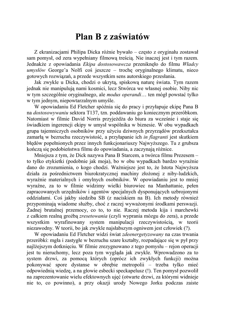 Plan B z zaświatów Z ekranizacjami Philipa Dicka róŜnie bywało – często z oryginału zostawał sam pomysł, od zera wypełniany filmową treścią. Nie inaczej jest i tym razem. JednakŜe z opowiadania Ekipa dostosowawcza przeniknęło do filmu Władcy umysłów George’a Nolfi coś jeszcze – trochę oryginalnego klimatu, nieco gotowych rozwiązań, a przede wszystkim sens autorskiego przesłania. Jak zwykle u Dicka, chodzi o ukrytą, spiskową naturę świata. Tym razem jednak nie manipulują nami kosmici, lecz Stwórca we własnej osobie. Niby nic w tym szczególnie oryginalnego, ale modus operandi… ten mógł powstać tylko w tym jednym, niepowtarzalnym umyśle. W opowiadaniu Ed Fletcher spóźnia się do pracy i przyłapuje ekipę Pana B na dostosowywaniu sektora T137, tzn. poddawaniu go koniecznym przeróbkom. Natomiast w filmie David Norris przyjeŜdŜa do biura za wcześnie i staje się świadkiem ingerencji ekipy w umysł wspólnika w biznesie. W obu wypadkach grupa tajemniczych osobników przy uŜyciu dziwnych przyrządów przekształca zamarłą w bezruchu rzeczywistość, a przyłapanie ich in flagranti jest skutkiem błędów popełnionych przez innych funkcjonariuszy NajwyŜszego. Tu z grubsza kończą się podobieństwa filmu do opowiadania, a zaczynają róŜnice. Mniejsza z tym, Ŝe Dick nazywa Pana B Starcem, a twórca filmu Prezesem – to tylko etykietki (podobnie jak moja), bo w obu wypadkach bardzo wyraźnie dano do zrozumienia, o kogo chodzi. WaŜniejsze jest to, Ŝe Istota NajwyŜsza działa za pośrednictwem biurokratycznej machiny złoŜonej z niby-ludzkich, wyraźnie materialnych i omylnych osobników. W opowiadaniu jest to mniej wyraźne, za to w filmie widzimy wielki biurowiec na Manhattanie, pełen zapracowanych urzędników i agentów specjalnych dysponujących uzbrojonymi oddziałami. Coś jakby siedziba SB (z naciskiem na B). Ich metody równieŜ przypominają wiadome słuŜby, choć z raczej wywaŜonymi środkami perswazji. śadnej brutalnej przemocy, co to, to nie. Raczej metoda kija i marchewki z całkiem realną groźbą zresetowania (czyli wyprania mózgu do zera), a przede wszystkim wyrafinowany system manipulacji rzeczywistością, w teorii niezawodny. W teorii, bo jak zwykle najsłabszym ogniwem jest człowiek (?). W opowiadaniu Ed Fletcher widzi świat zdeenergetyzowany na czas trwania przeróbki: mgła i zastygłe w bezruchu szare kształty, rozpadające się w pył przy najlŜejszym dotknięciu. W filmie zrezygnowano z tego pomysłu – rejon operacji jest tu nieruchomy, lecz poza tym wygląda jak zwykle. Wprowadzono za to system drzwi, za pomocą których (oprócz ich zwykłych funkcji) moŜna pokonywać spore dystanse w obrębie metropolii – trzeba tylko mieć odpowiednią wiedzę, a na głowie esbecki speckapelusz (!). Ten pomysł pozwolił na zaprezentowanie wielu efektownych ujęć (otwarte drzwi, za którymi widnieje nie to, co powinno), a przy okazji urody Nowego Jorku podczas zaiste błyskawicznego zwiedzania. Spośród innych gadŜetów zasługuje na wyróŜnienie specnotes pełniący funkcję transcendentalnego superkomputera oraz tzw. schody Eschera (z kaŜdego ich końca wychodzi się w to samo miejsce, a mianowicie na dach biurowca Prezesa na Manhattanie). Przejdźmy wreszcie do tego, co wypełnia film, czyli historii pary głównych bohaterów i ich perypetii z Funkcjonariuszami. David Norris (Matt Damon) kandyduje w wyborach na urząd senatora stanu Nowy Jork, jednak przegrywa w wyniku skandalu. Tym niemniej zostaje zapamiętany i ma szanse w następnej kadencji, a z czasem takŜe w wyborach prezydenckich. Tak w kaŜdym razie zakłada Plan, którego pilnuje ekipa urzędników Prezesa. Ów plan co prawda przewidywał przelotne spotkanie Norrisa z Elise (Emily Blunt), lecz w wyniku niedopatrzenia agenta Harry’ego Mitchella (Anthony Mackie) spotykają się ponownie, co zdecydowanie nie miało wchodzić w grę. Wszystko zaczyna się sypać – nie dość, Ŝe Emily daje Davidowi numer swojego telefonu, to jeszcze chwilę potem ten odkrywa istnienie Biura i Funkcjonariuszy. Przypadek kwalifikujący się do zresetowania, co byłoby jednak niezgodne z Planem… Dają więc Davidowi szansę – ma trzymać się od Emily z daleka. Ten jednak, oczywiście, ani myśli iść im na rękę. Co prawda dla pewności zabrano mu kartkę z numerem telefonu, ale co się odwlecze, to nie uciecze... Kiedy po trzech latach znów się przypadkiem spotykają, zaczyna się rozgrywka pełna podstępów i efektownych pościgów po Nowym Jorku, o których wspomniałem powyŜej. A tam, gdzie się kończy gonitwa, zaczynają się schody, co w tym wypadku oznacza ślepe schody Eschera. O co więc w końcu chodziło w tym Planie? Nazwijmy go Planem B nie tylko z racji autorstwa, ale takŜe dlatego, Ŝe poprzedzał go Plan A, w którym nasi bohaterowie byli sobie przeznaczeni. Coś się jednak pokićkało i wyszło na to, Ŝe Emily przeszkadzałaby Davidowi w karierze politycznej z prezydenturą na horyzoncie, a ten przeszkadzałby jej w karierze przyszłej gwiazdy tańca nowoczesnego. Po tamtym planie musiało jednak pozostać jakieś echo, pchające ich niepowstrzymanie ku sobie. Czy jednak to zauroczenie, jak w klasyce romantycznej literatury i filmu, zdoła w końcu pokonać wszelkie przeszkody i doprowadzić do wyłonienia się Planu C? Tego, rzecz jasna, nie zdradzę. Jak widać, w filmie (wyraźniej niŜ w opowiadaniu) chodzi o problem wolnej woli i przeznaczenia. Jeden z Funkcjonariuszy, Thompson (Terence Stamp), mówi wręcz Norrisowi: Twoje uczucia się nie liczą, waŜne jest to, co ci pisano. Prezentuje teŜ przy okazji krótką historię rzeczonego problemu. OtóŜ wolna wola sprawdzała się jako-tako tylko do czasu. W Średniowieczu cierpliwość Stwórcy się wyczerpała, dał więc ludzkości Renesans i Oświecenie, po czym z nadzieją spoczął na laurach. Jednak wiek XX zniesmaczył go tak okrutnie, Ŝe wolną wolę odesłał do