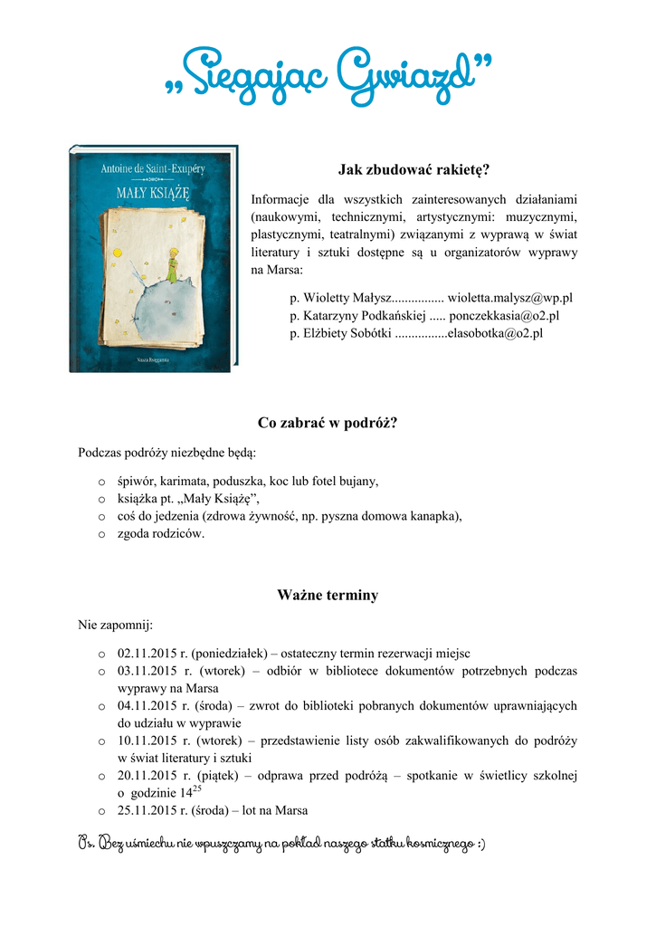 „Sięgając Gwiazd” Jak zbudować rakietę? Informacje dla wszystkich zainteresowanych działaniami (naukowymi, technicznymi, artystycznymi: muzycznymi, plastycznymi, teatralnymi) związanymi z wyprawą w świat literatury i sztuki dostępne są u organizatorów wyprawy na Marsa: p. Wioletty Małysz................ [email protected] p. Katarzyny Podkańskiej ..... [email protected] p. Elżbiety Sobótki [email protected] Co zabrać w podróż? Podczas podróży niezbędne będą: o o o o śpiwór, karimata, poduszka, koc lub fotel bujany, książka pt. „Mały Książę”, coś do jedzenia (zdrowa żywność, np. pyszna domowa kanapka), zgoda rodziców. Ważne terminy Nie zapomnij: o 02.11.2015 r. (poniedziałek) – ostateczny termin rezerwacji miejsc o 03.11.2015 r. (wtorek) – odbiór w bibliotece dokumentów potrzebnych podczas wyprawy na Marsa o 04.11.2015 r. (środa) – zwrot do biblioteki pobranych dokumentów uprawniających do udziału w wyprawie o 10.11.2015 r. (wtorek) – przedstawienie listy osób zakwalifikowanych do podróży w świat literatury i sztuki o 20.11.2015 r. (piątek) – odprawa przed podróżą – spotkanie w świetlicy szkolnej o godzinie 1425 o 25.11.2015 r. (środa) – lot na Marsa Ps. Bez uśmiechu nie wpuszczamy na pokład naszego statku kosmicznego :)