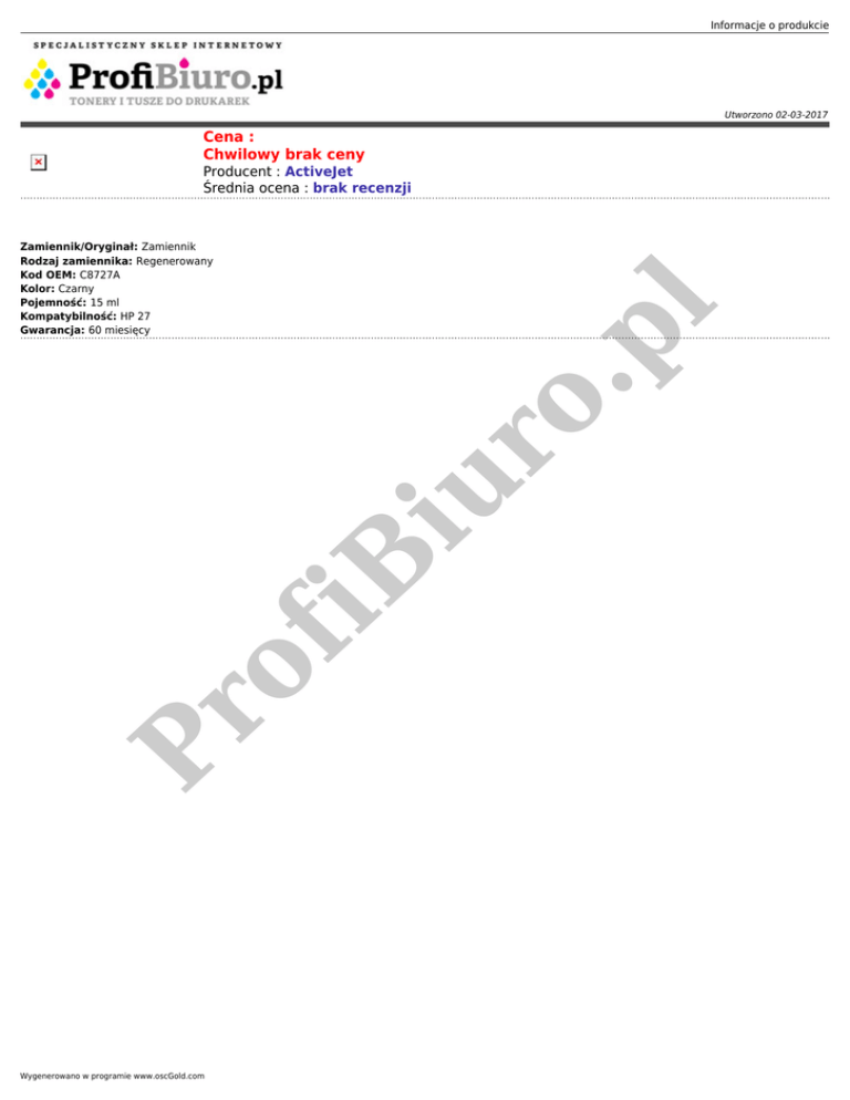 Informacje o produkcie Utworzono 02-03-2017 Cena : Chwilowy brak ceny Producent : ActiveJet Średnia ocena : brak recenzji Pr of iB iu r o. pl Zamiennik/Oryginał: Zamiennik Rodzaj zamiennika: Regenerowany Kod OEM: C8727A Kolor: Czarny Pojemność: 15 ml Kompatybilność: HP 27 Gwarancja: 60 miesięcy Wygenerowano w programie www.oscGold.com